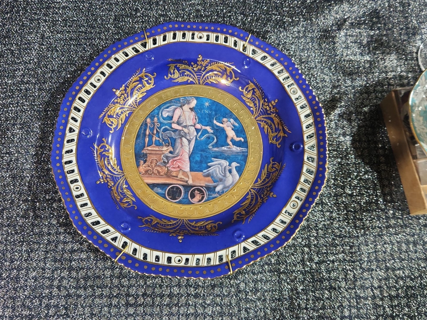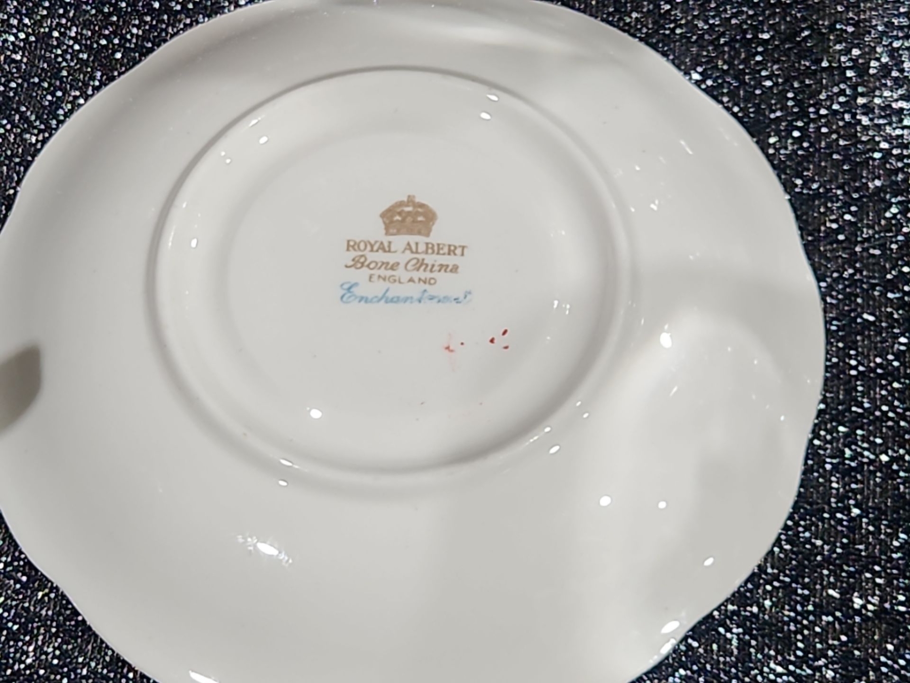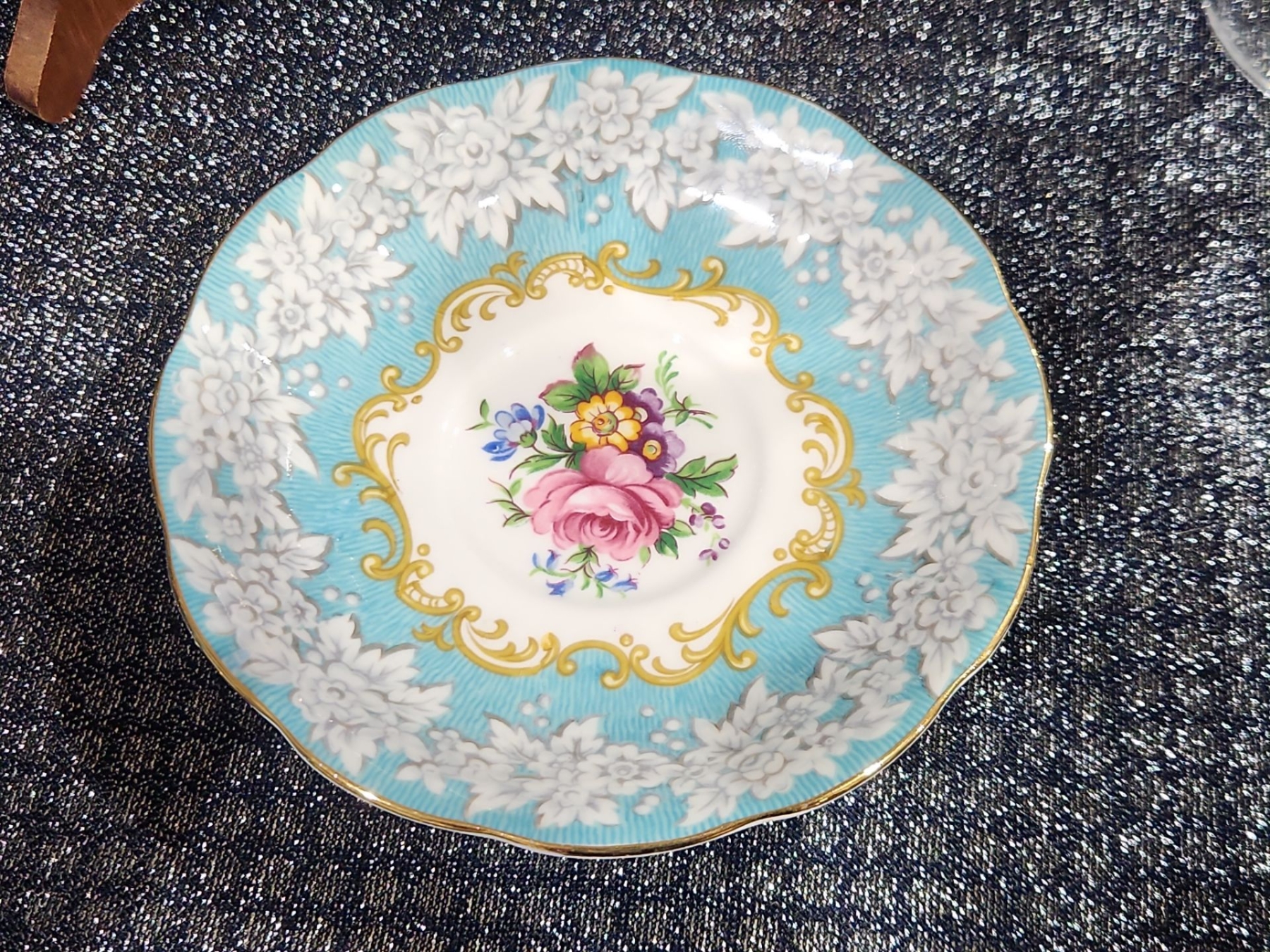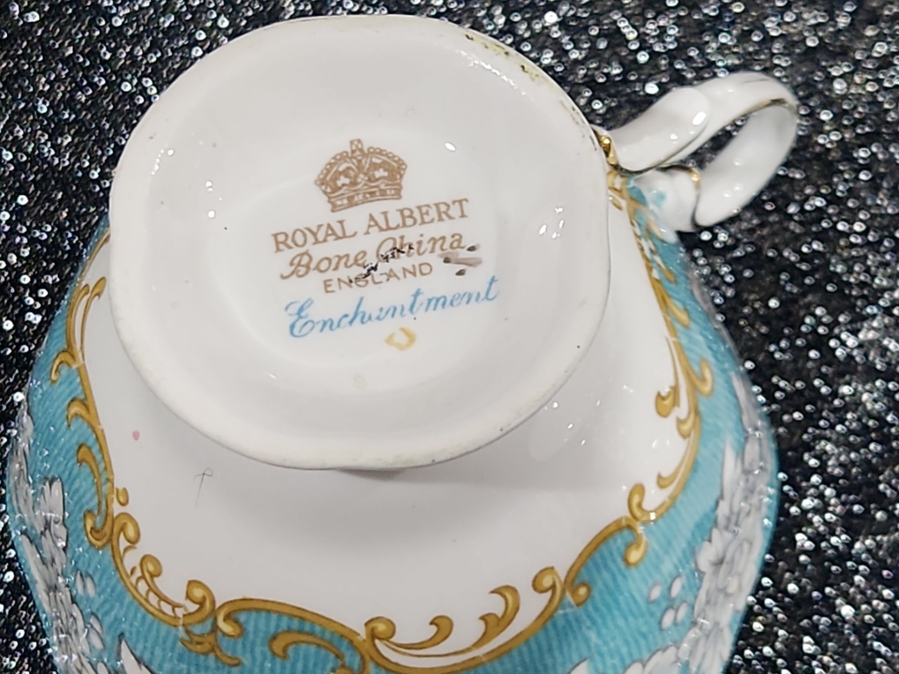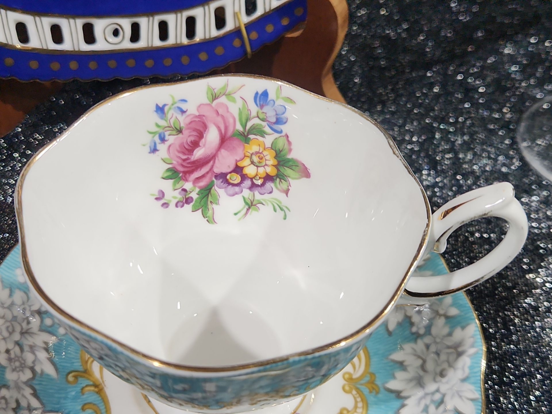 Decorative Plate, Crystal Stemmed Glasses, Royal Albert “Enchantment” Teacup & Saucer , Harry & David Chicken-Shaped Ceramic Spreaders,