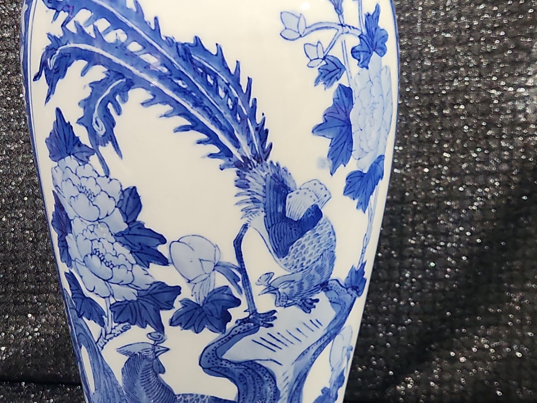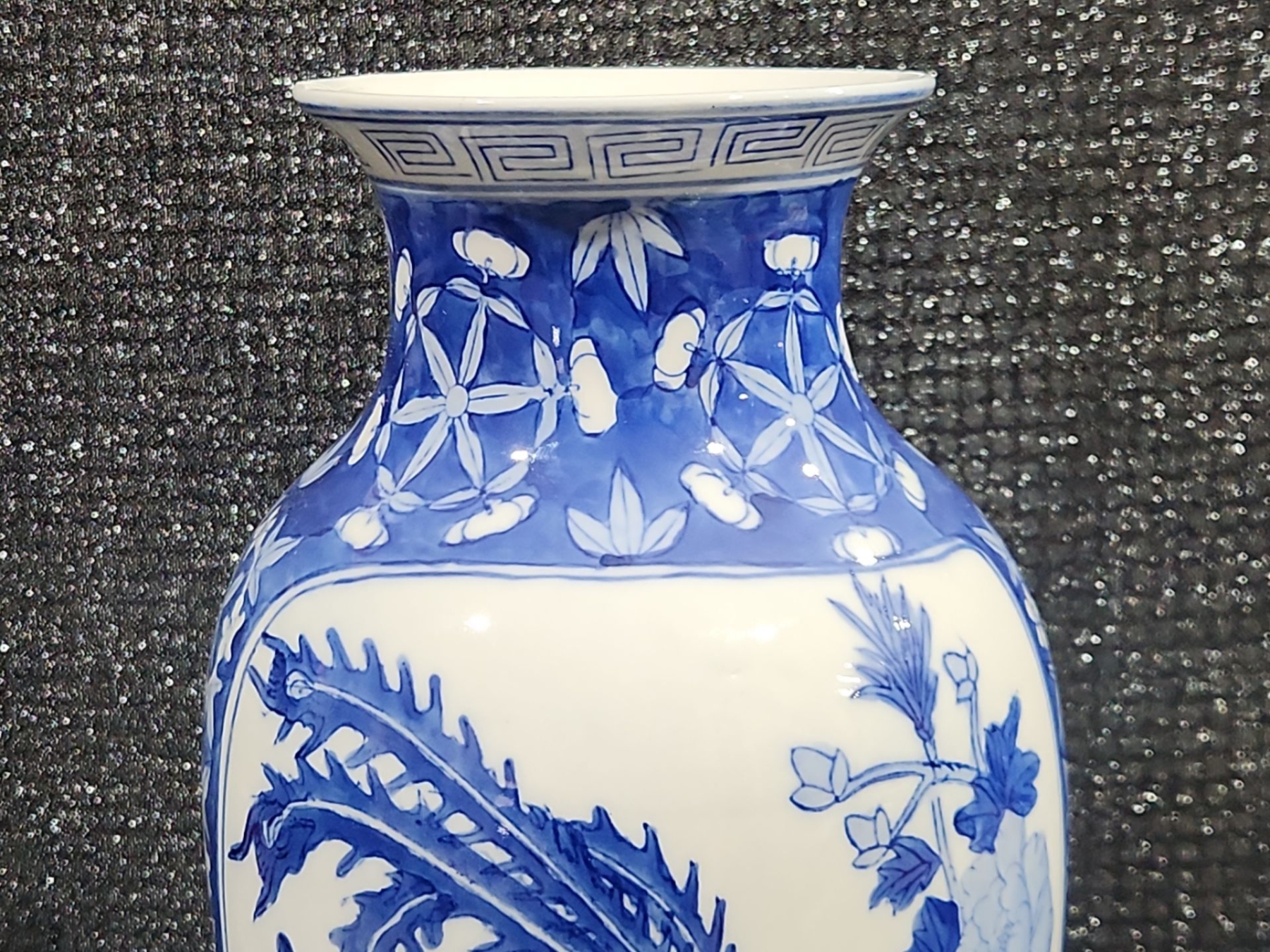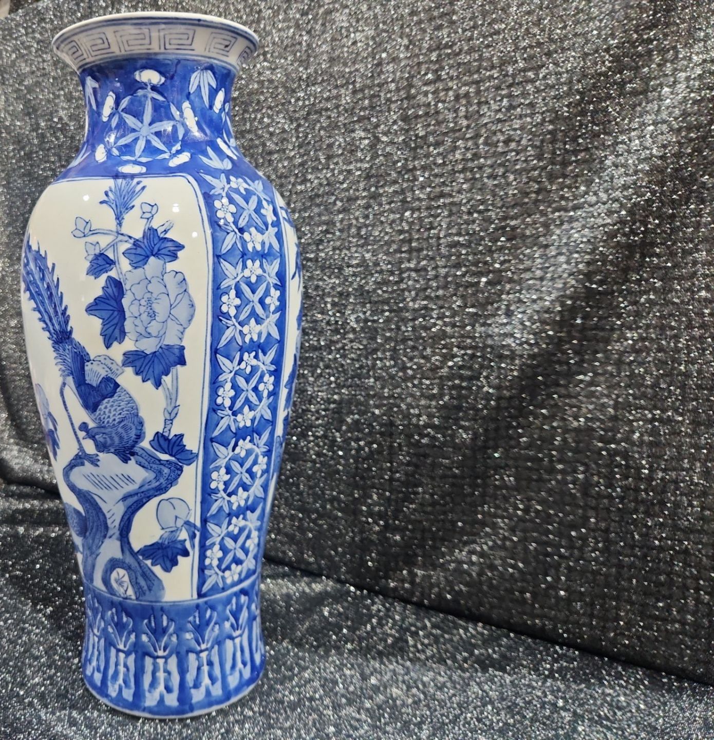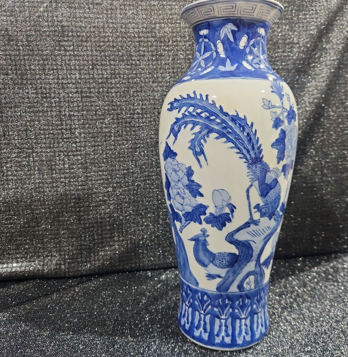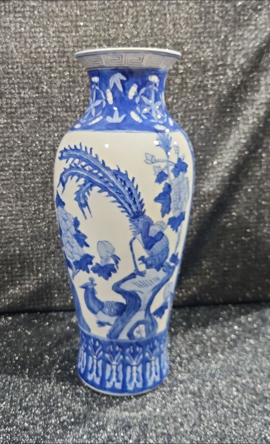 Chinese Kangxi-style blue and white porcelain baluster vase hand-painted botanical scenes and mythological phoenix motifs 18''INCHES HEIGHT