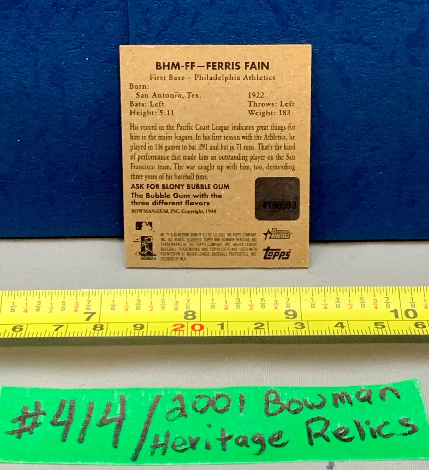 Lot 414 MLB Baseball Card - Ultra Rare Bowman Heritage Original Shibe Park Seat Ferris Fain Thick Card