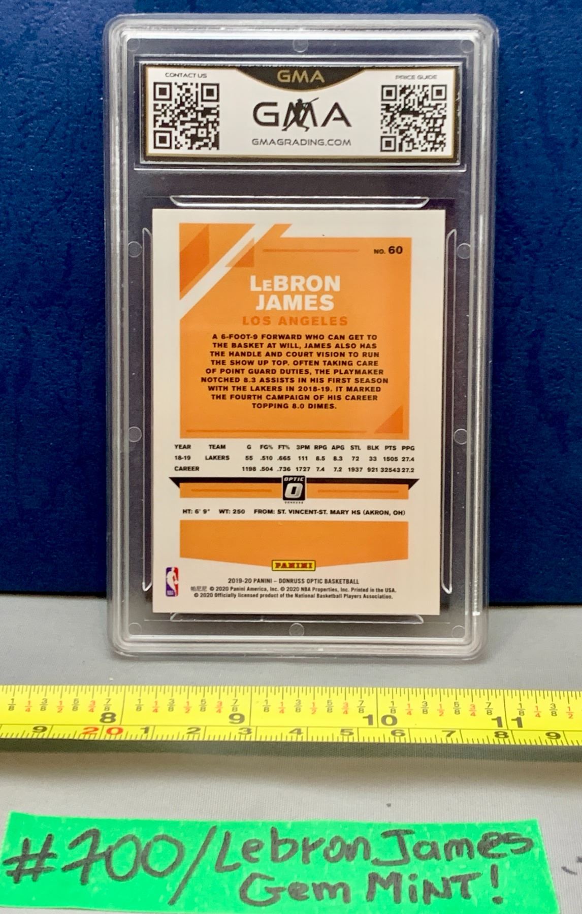 Lot 700 NBA Basketball - 2019 LeBron James Donruss Optic #60 GMA Graded Gem Mint 10