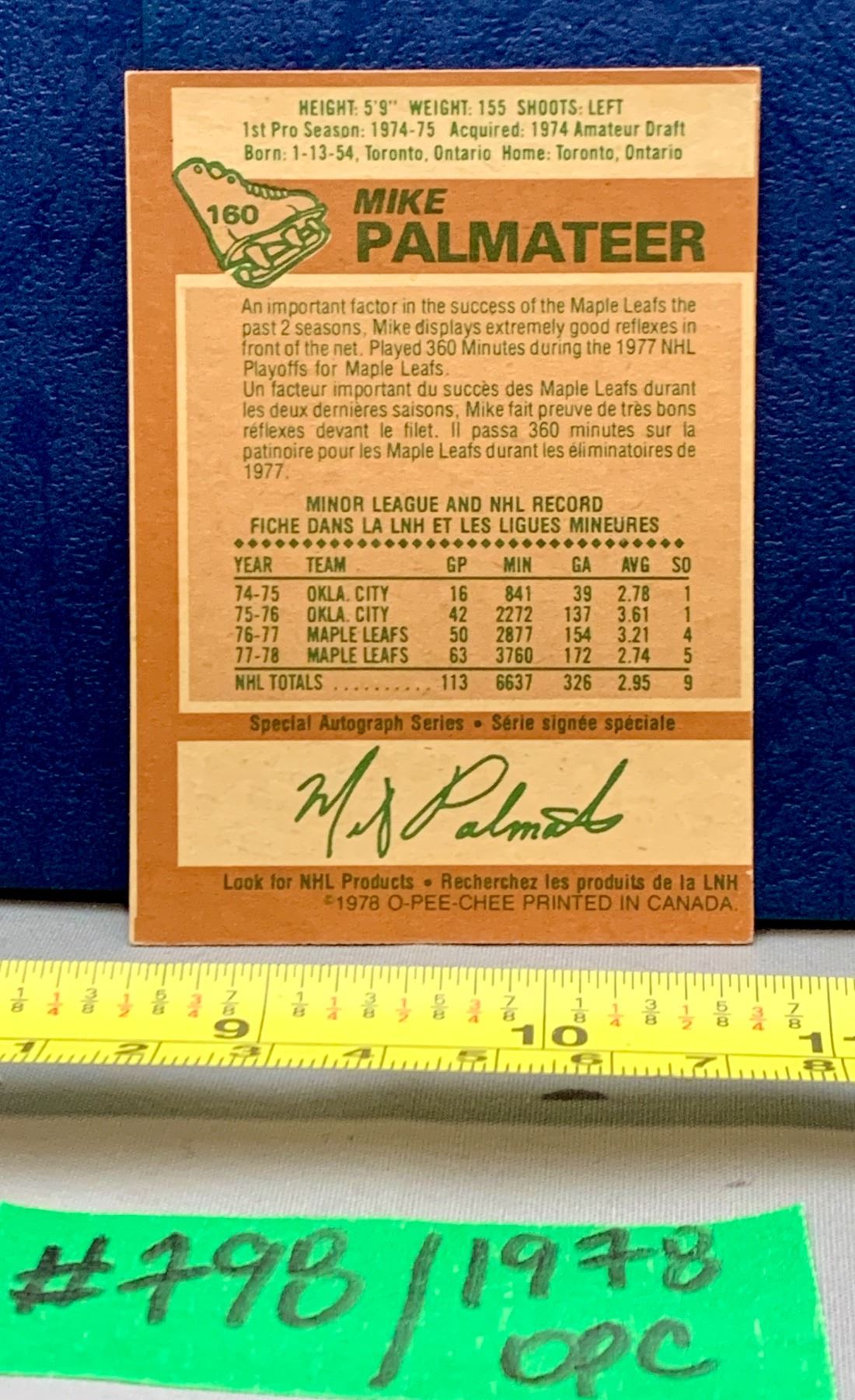 Lot 798 NHL HOCKEY - OPC 1978 Mike Palmateer