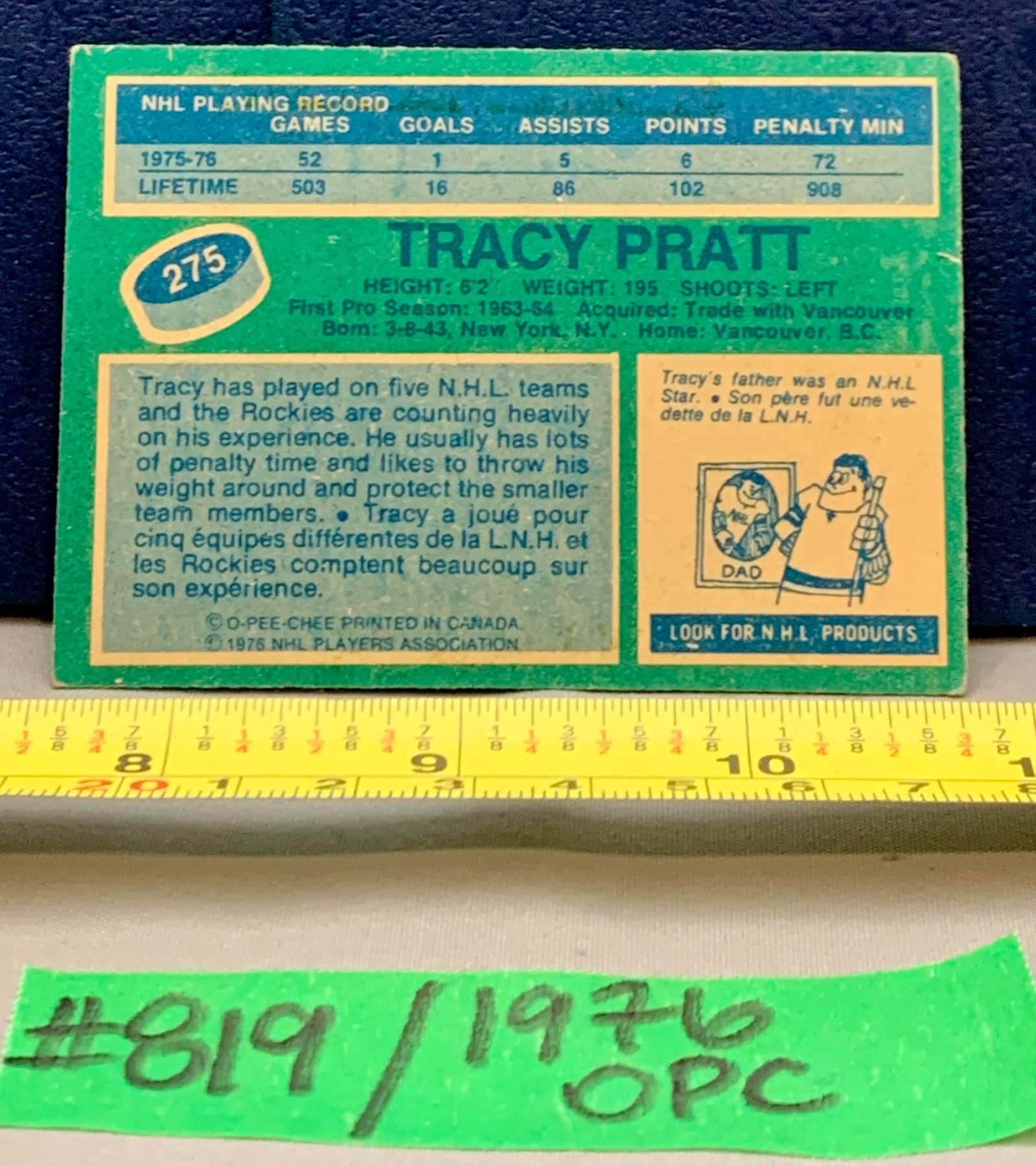 Lot 819 NHL HOCKEY - OPC 1976 Tracy Pratt Colorado Rockies