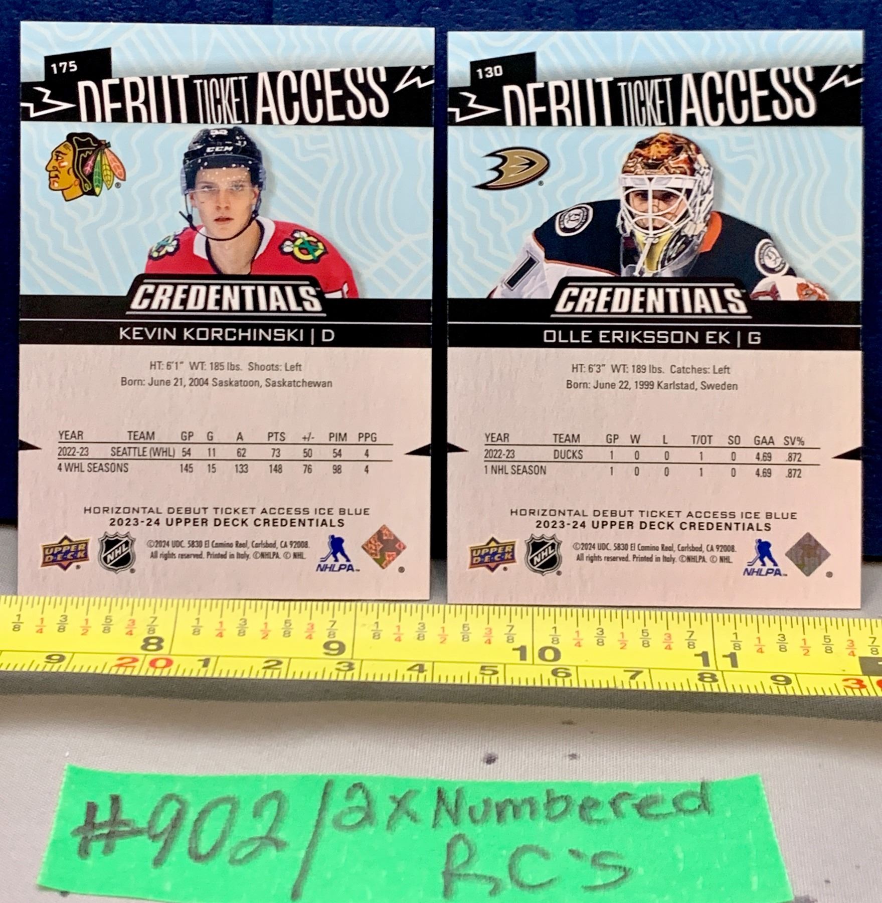 NHL HOCKEY - 2 x Credentials Debut Ticket Access Silver Rookie Cards - Korchinski & Olle Ericksson