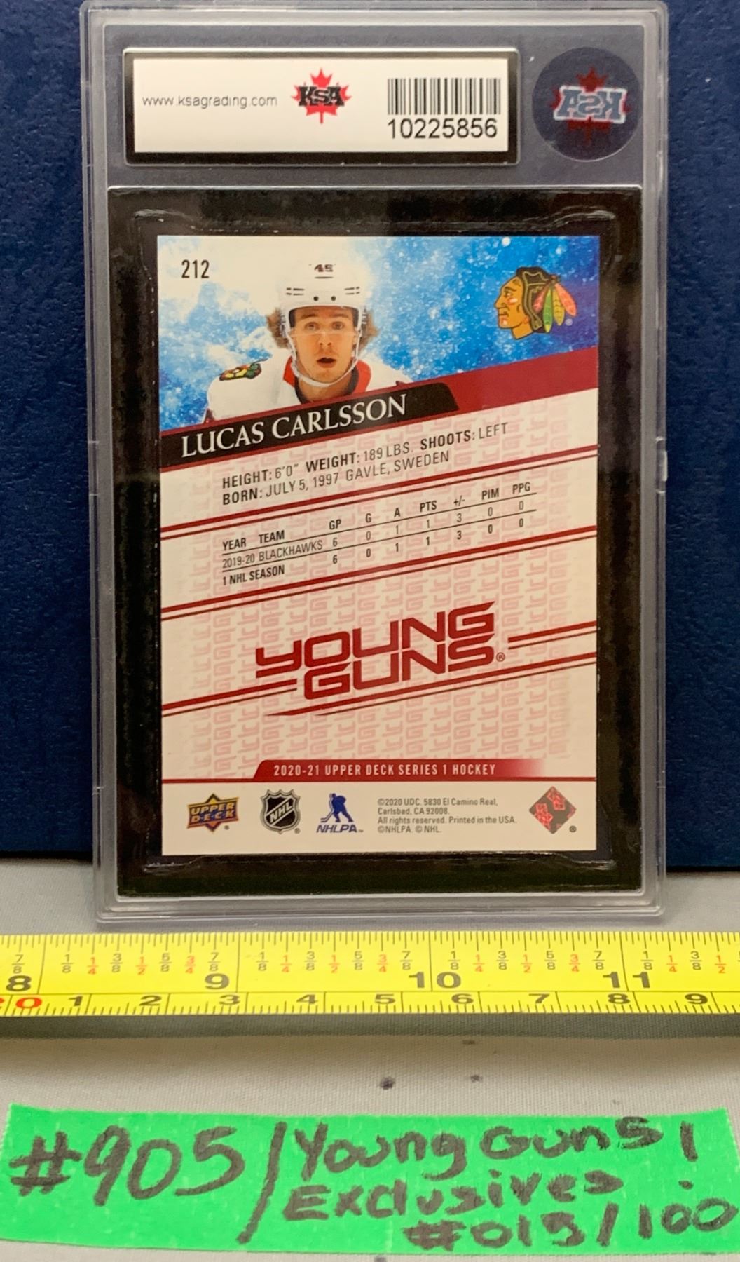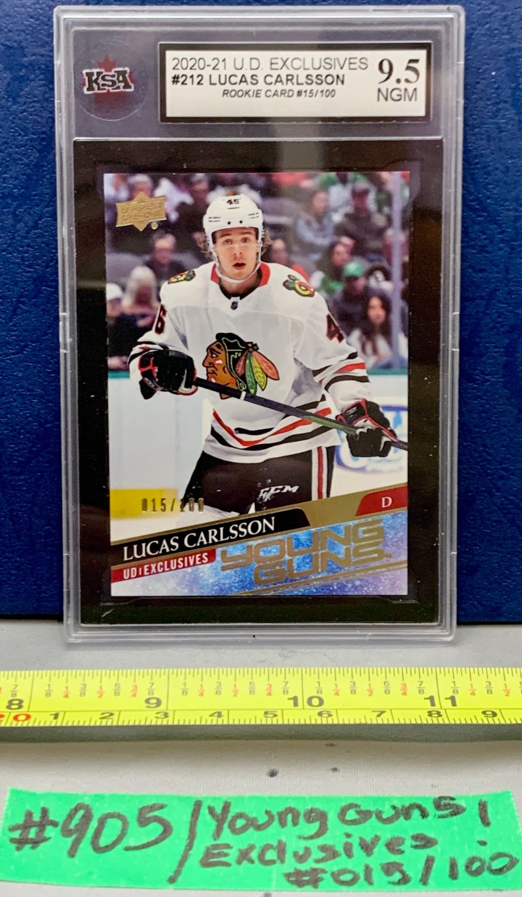Lot 905 NHL HOCKEY - UD Exclusives RARE #015/100 Lucas Carlsson Young Guns Rookie Card KSA 9.5