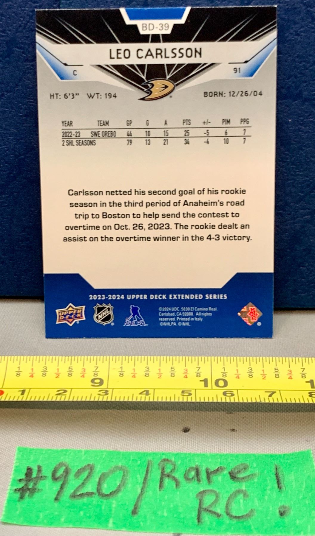 Lot 920 NHL HOCKEY - Very rare Leo Carlsson Black Diamond Holo Rookie Gems Card