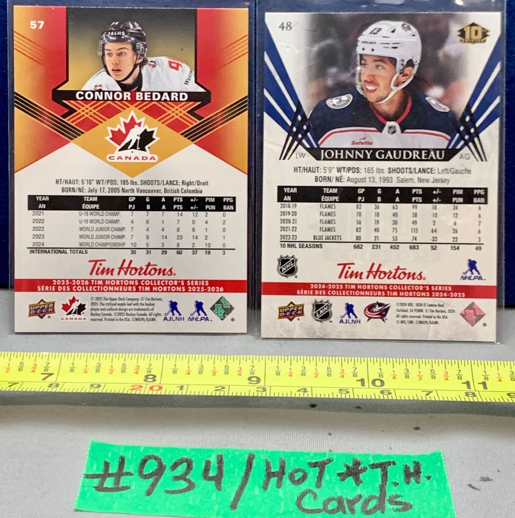 Lot 934 NHL HOCKEY - 2 x Tim Hortons Cards - Connor Bedard & Johnny Gaudreau