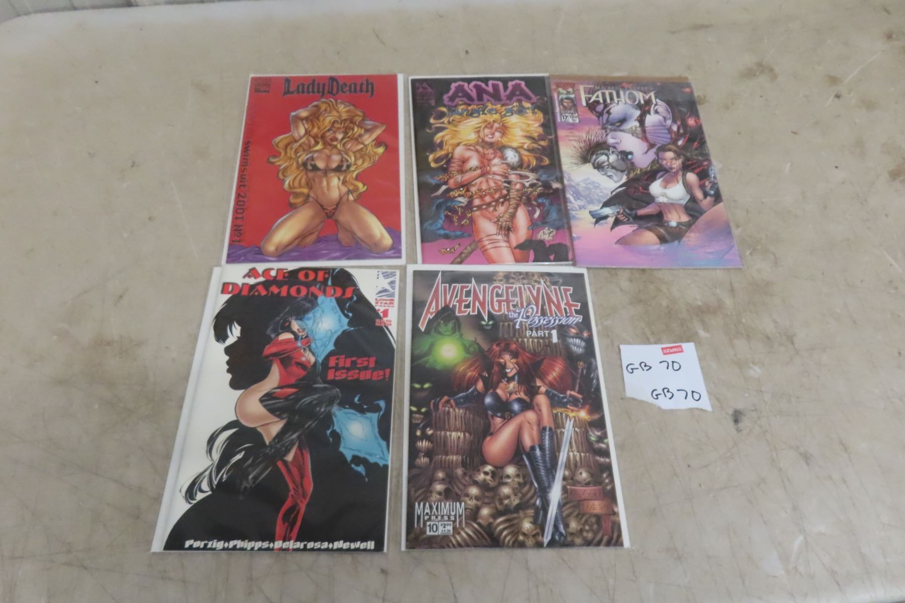 5 Comics: Lady Death Swimsuit 2001 No.1 , Ace of Diamonds Lone Star #1, Ana- Jungle Girl, Avengelyne The Passion Part 1, Fathom July 12