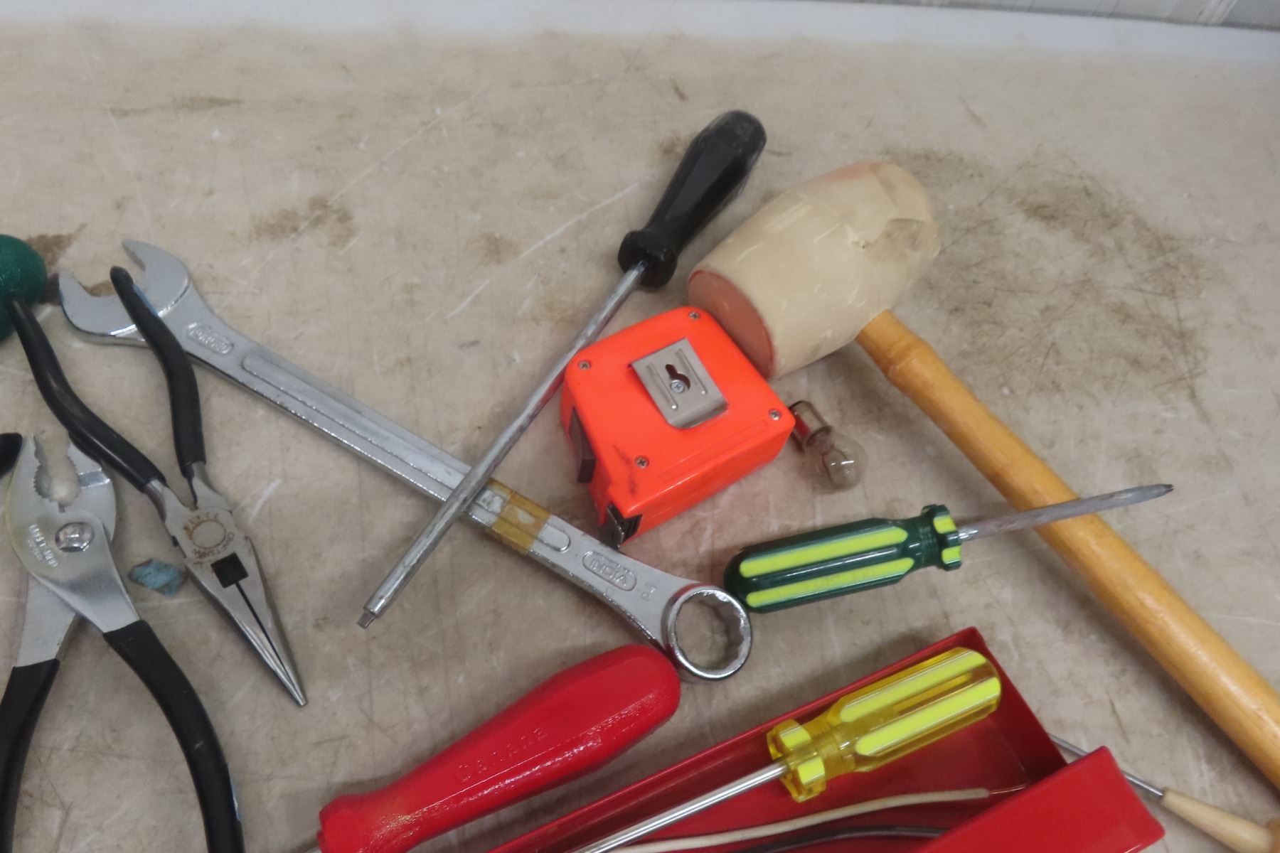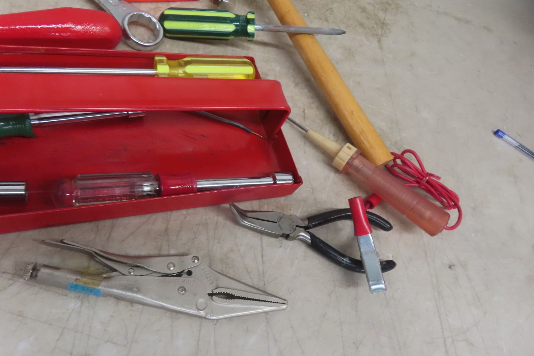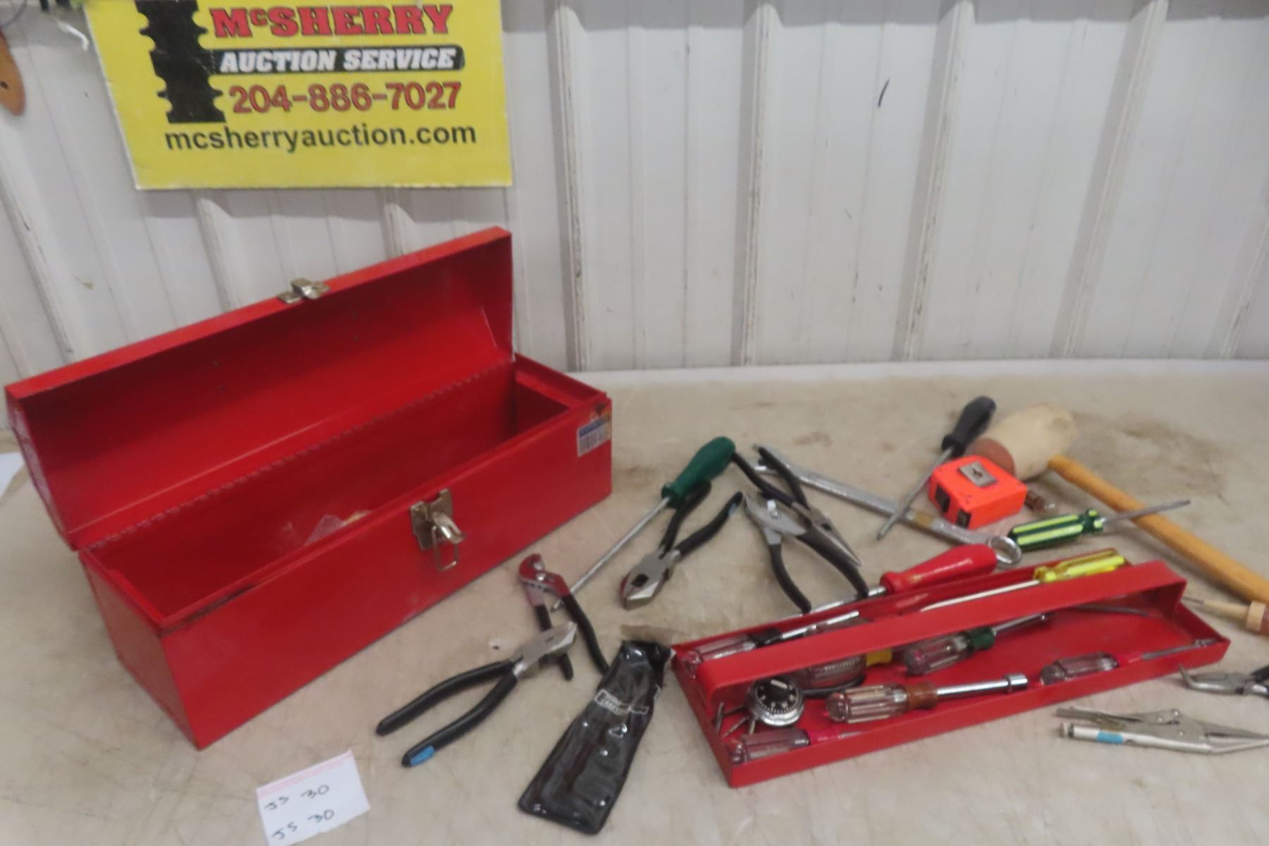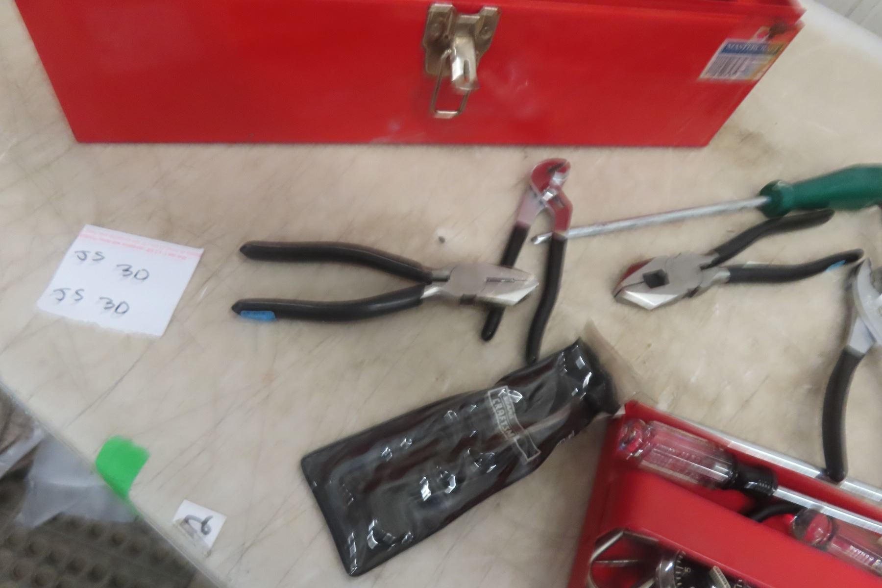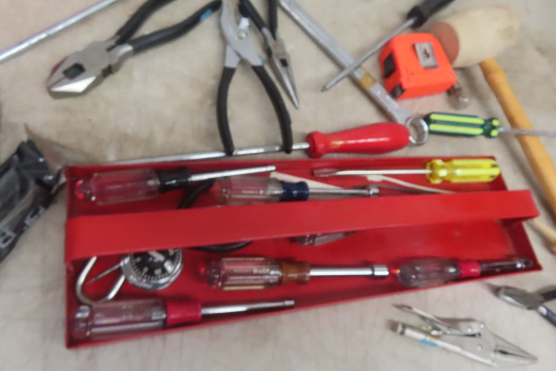 Lot 30 Metal Tool Box with Nut&Screw Drivers, Tape Measures, Circuit Tester, Cutters