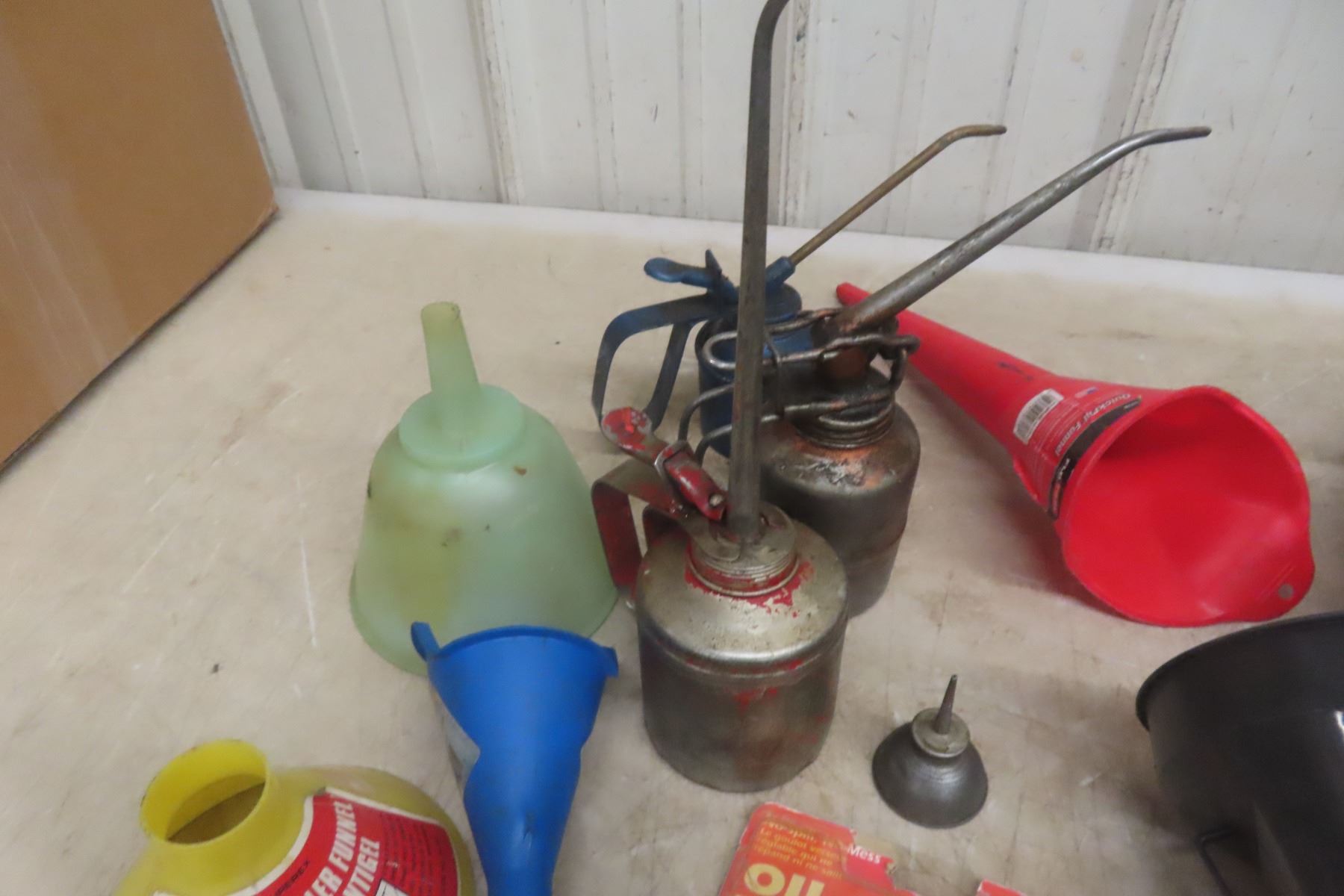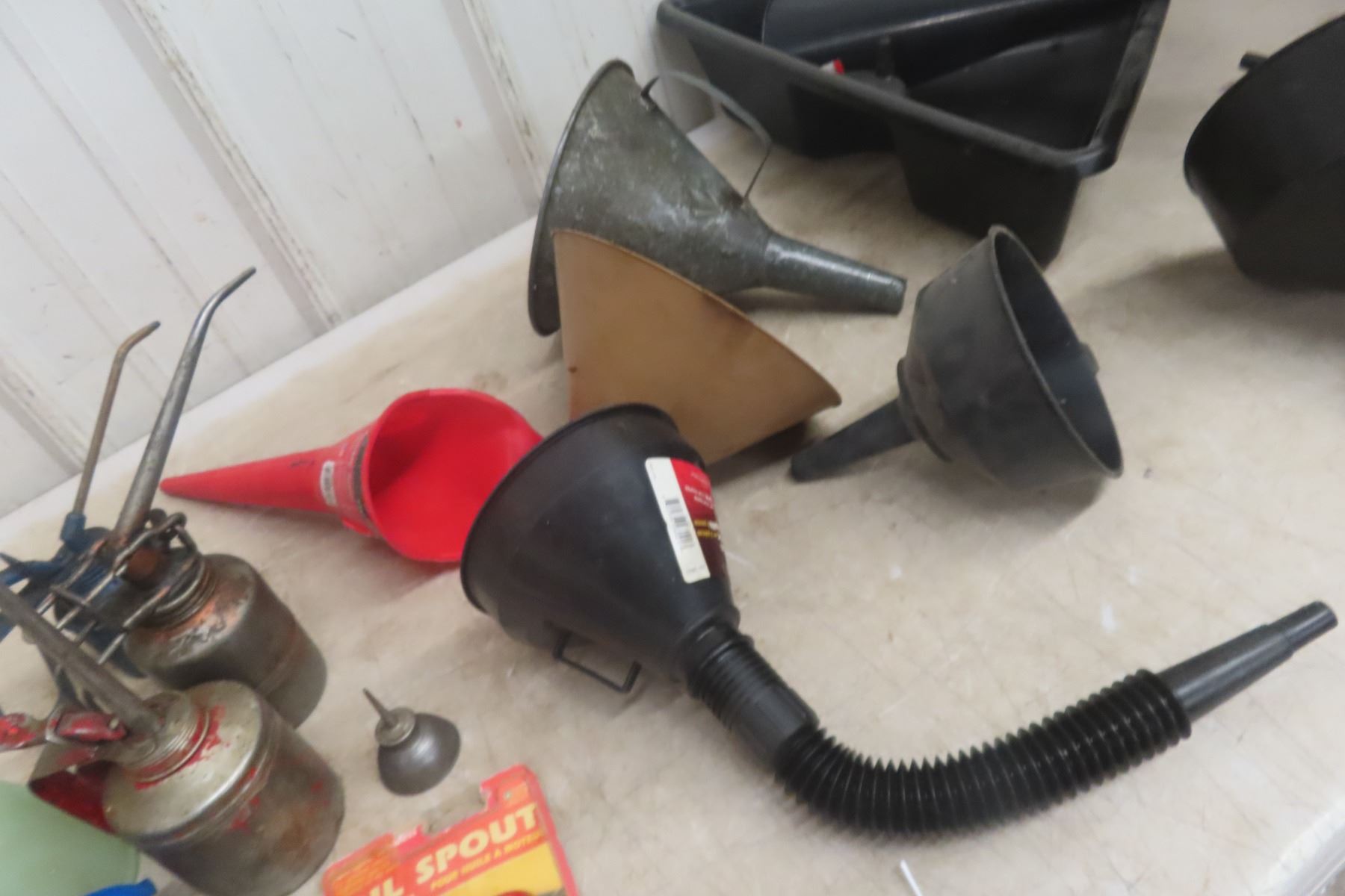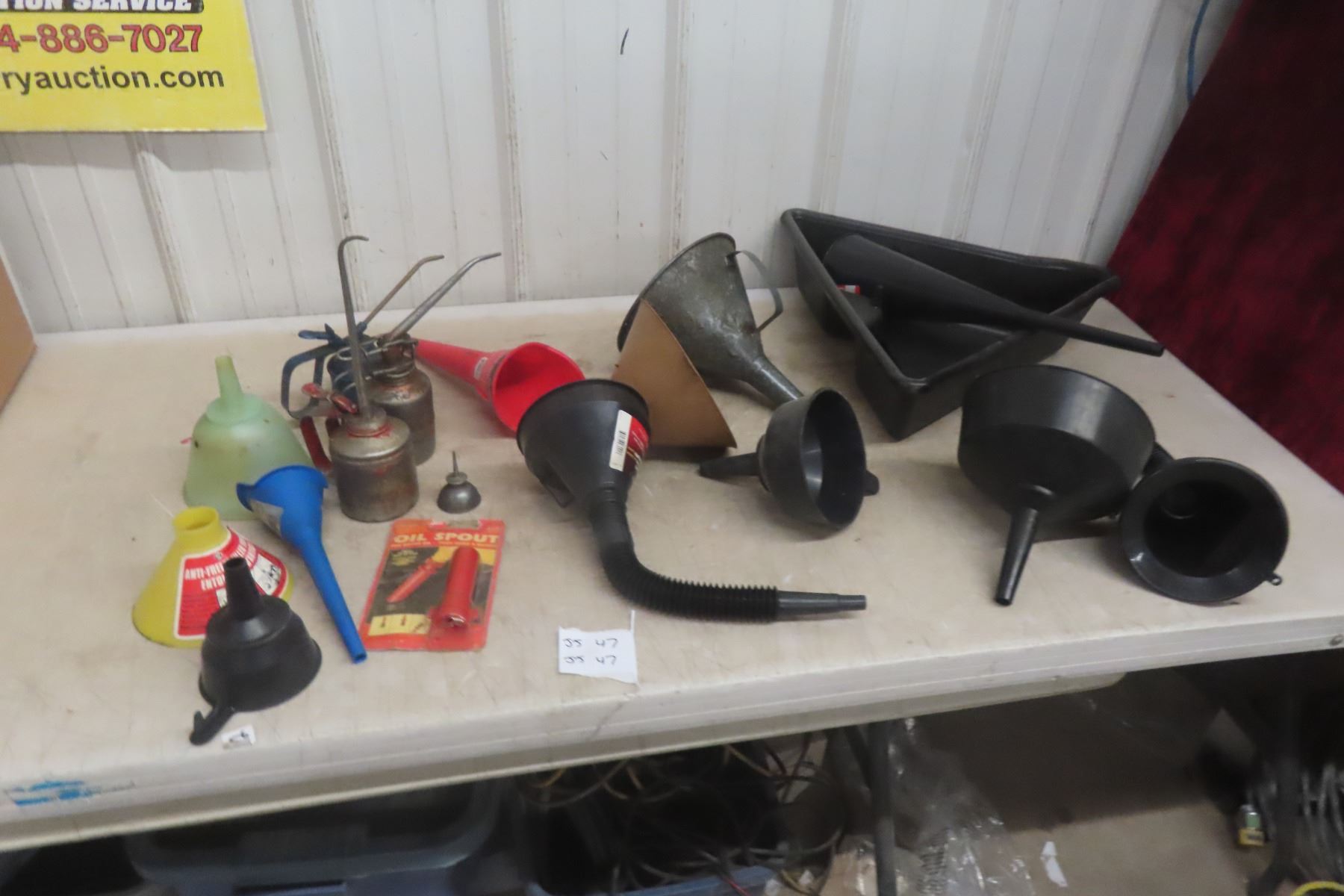 Lot 47 Funnels, Squirt Oil Cans, Oil Catch Pan