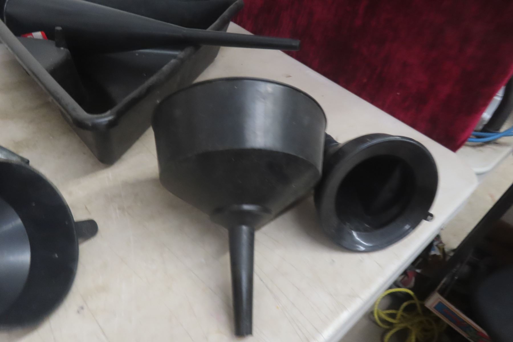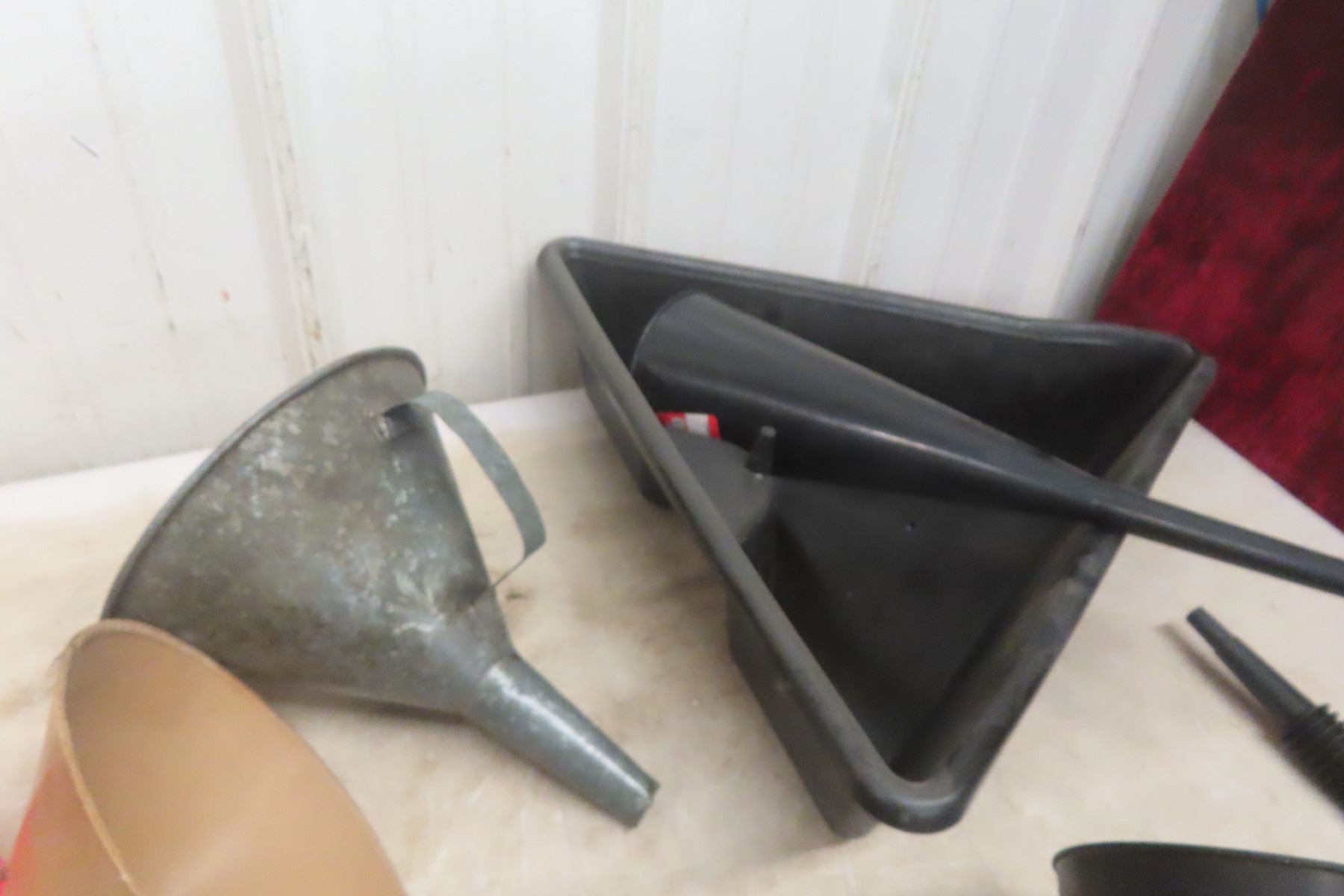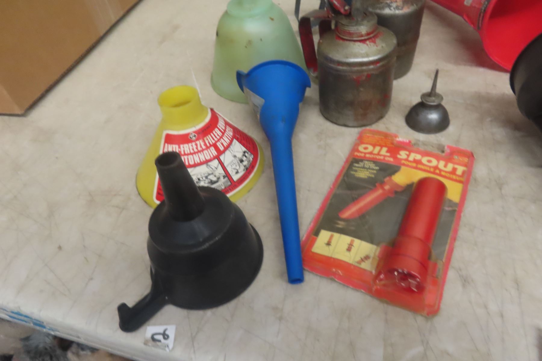 Lot 47 Funnels, Squirt Oil Cans, Oil Catch Pan