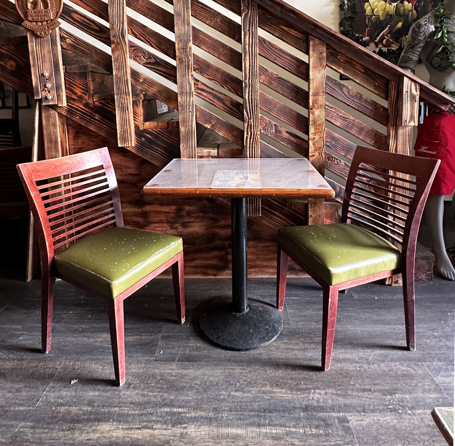 Rectangular Table 29" x 23" x 30"H w/ 4 Wooden Chairs w/ Slatted Backs 17" x 16" x 33.5"