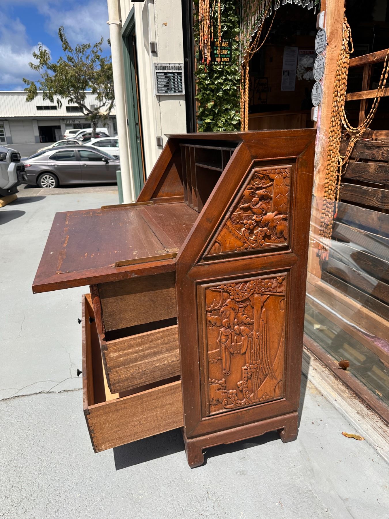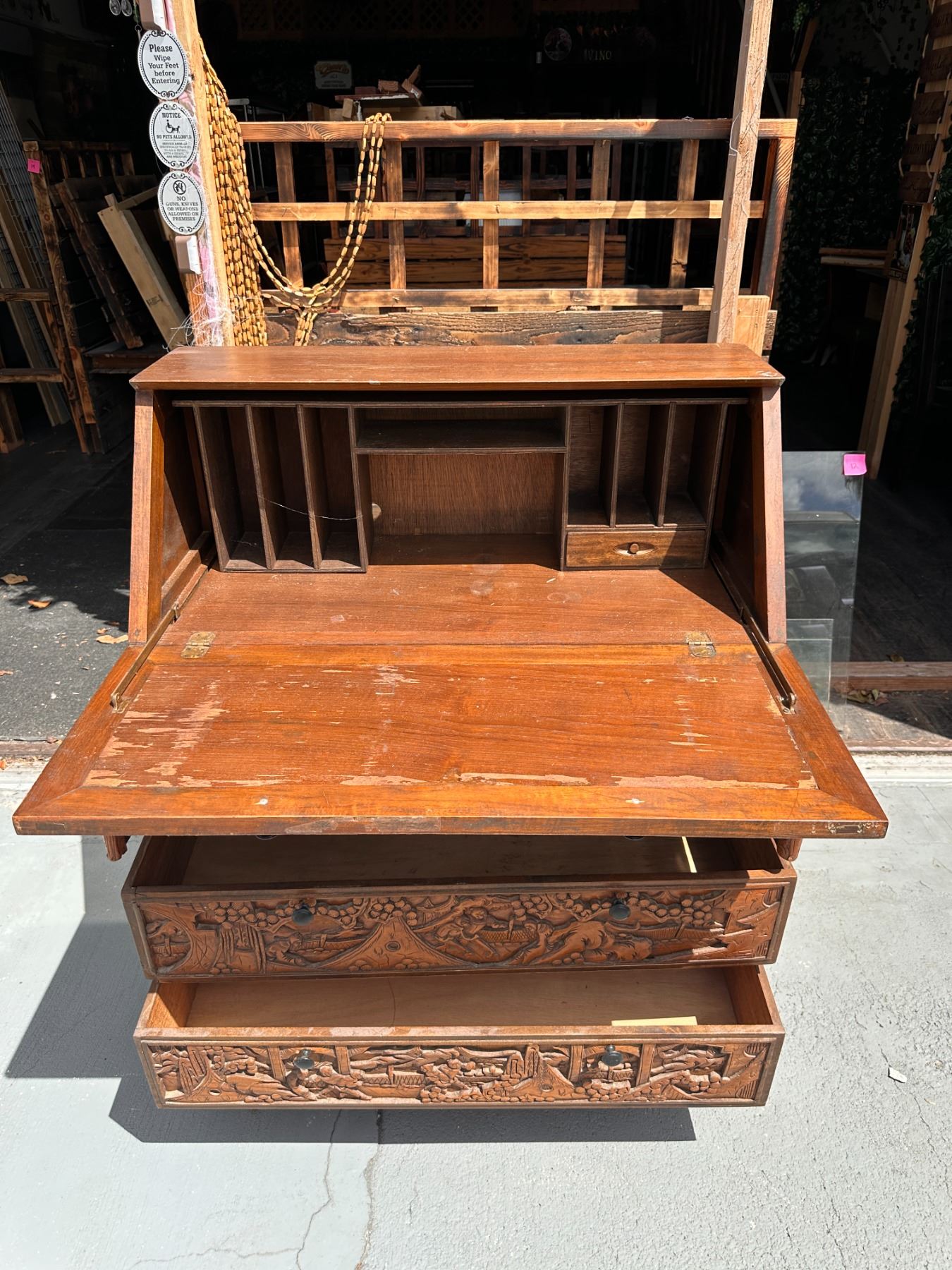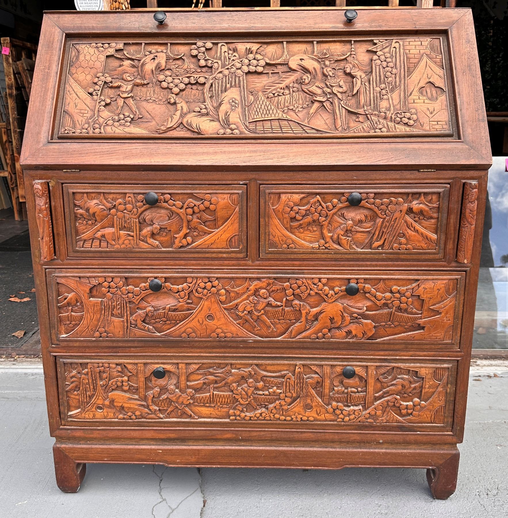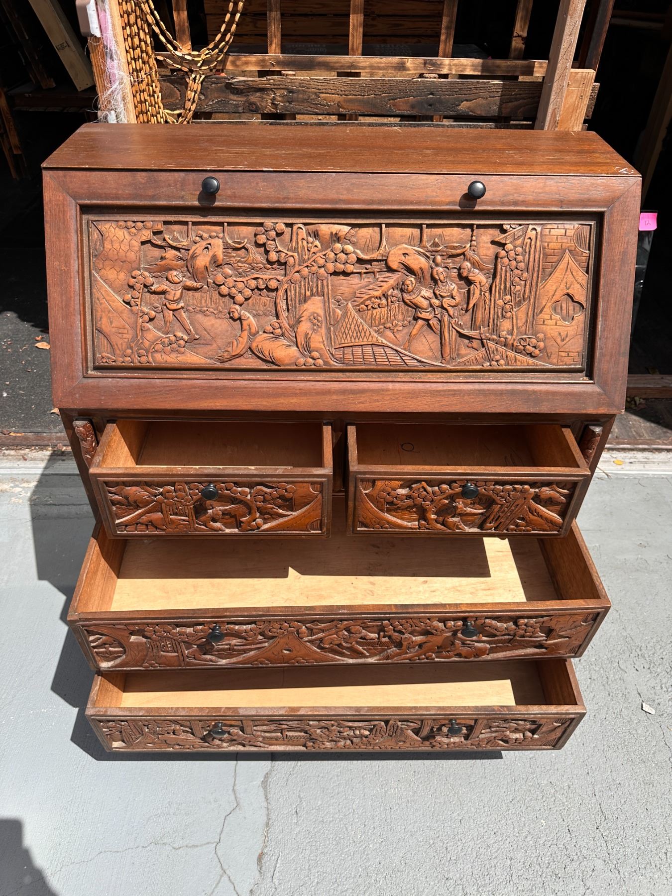 Lot 15 Wooden Drop Leaf Secretary Desk w/ Carved Grape Motif & 4 Drawers 36" x 16" x 42"H