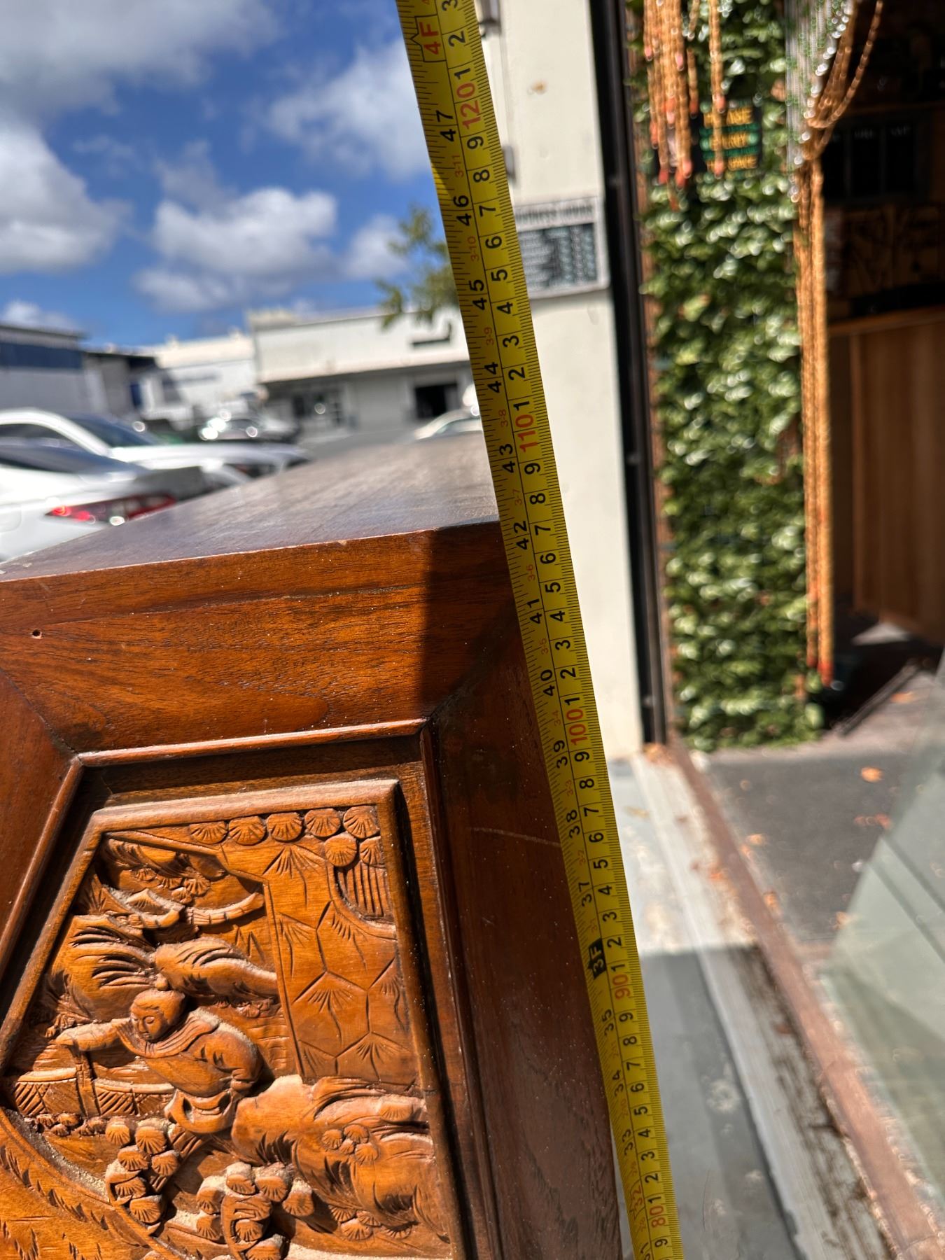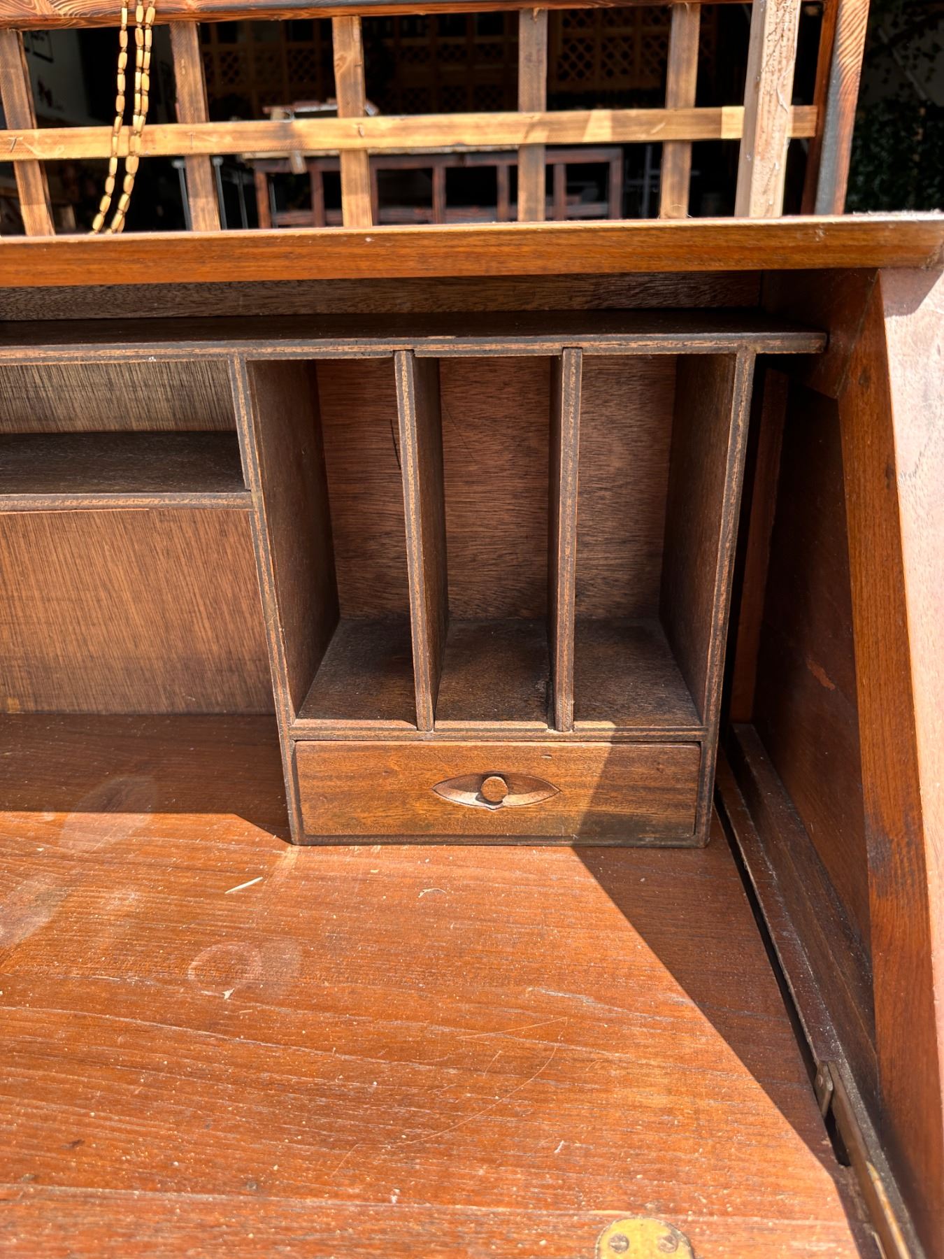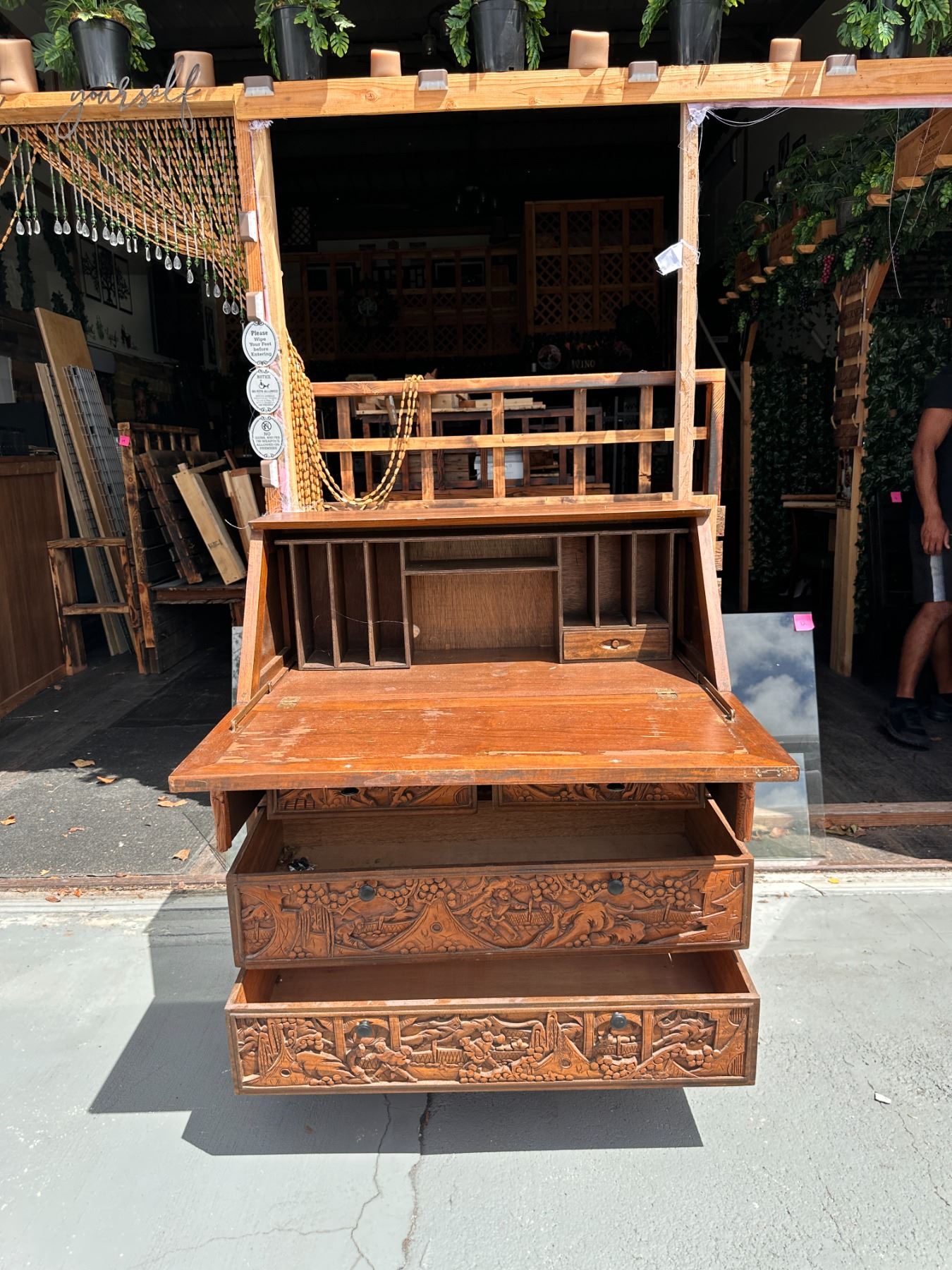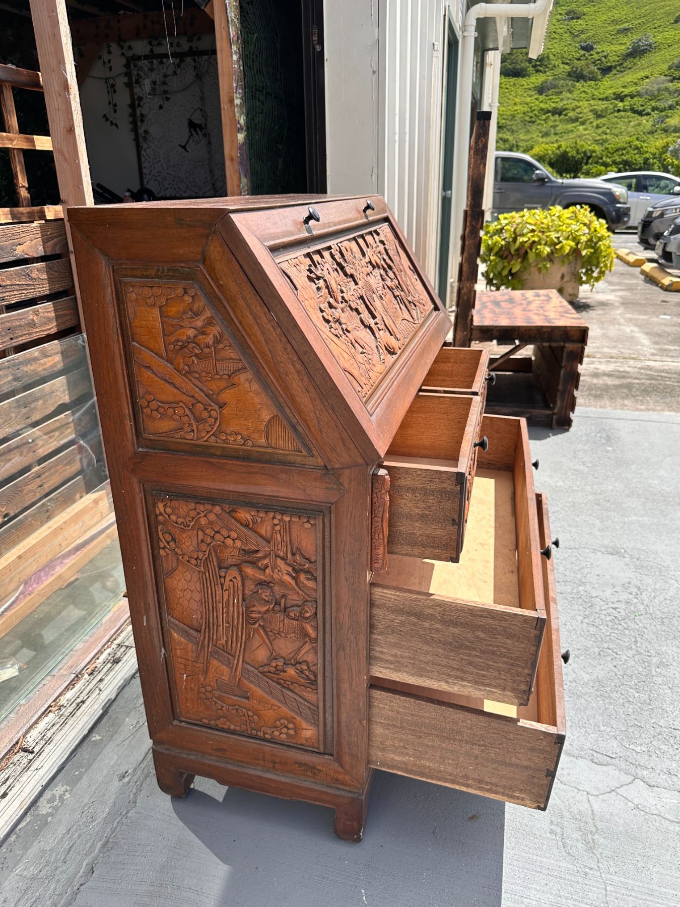 Lot 15 Wooden Drop Leaf Secretary Desk w/ Carved Grape Motif & 4 Drawers 36" x 16" x 42"H