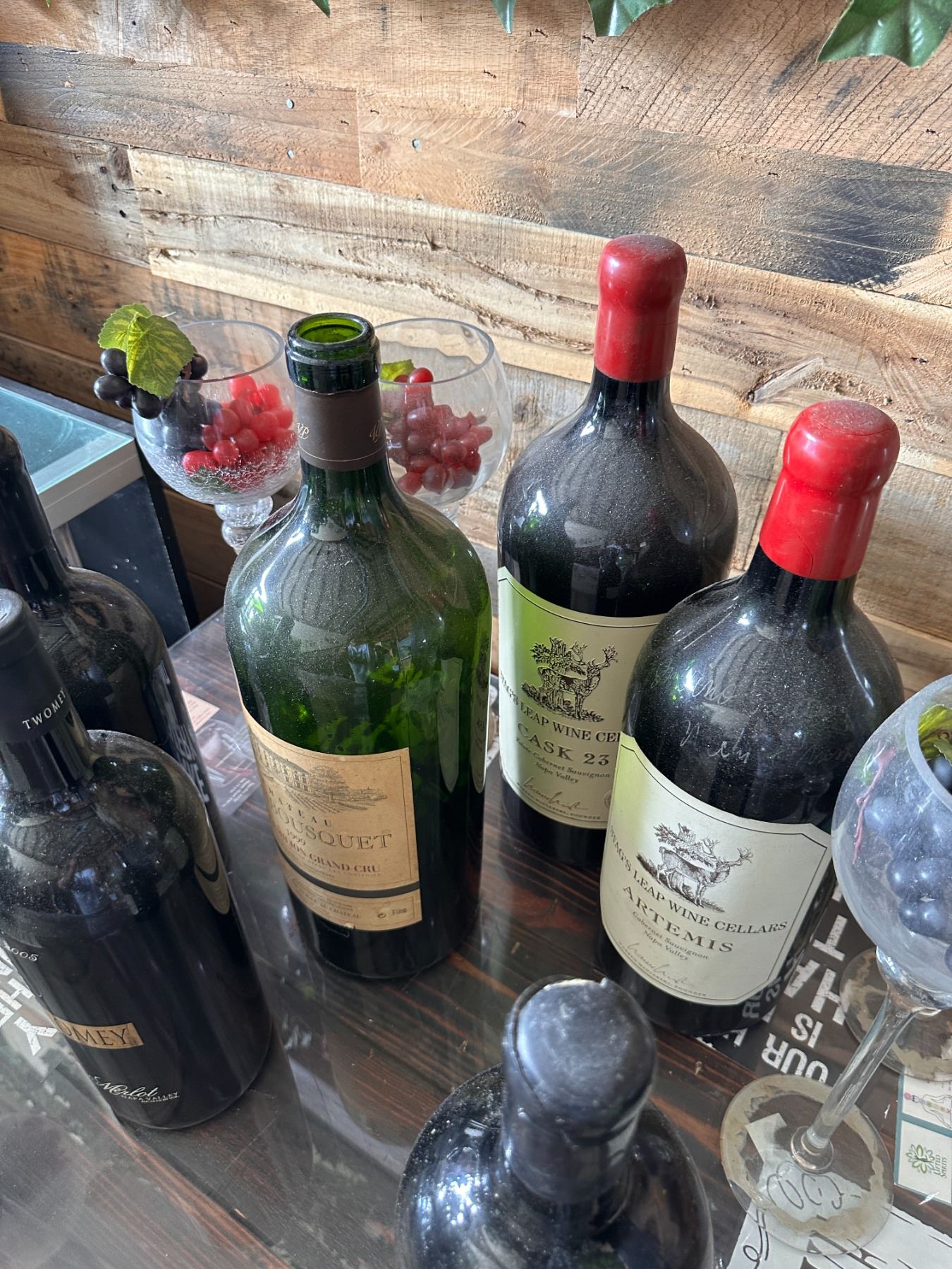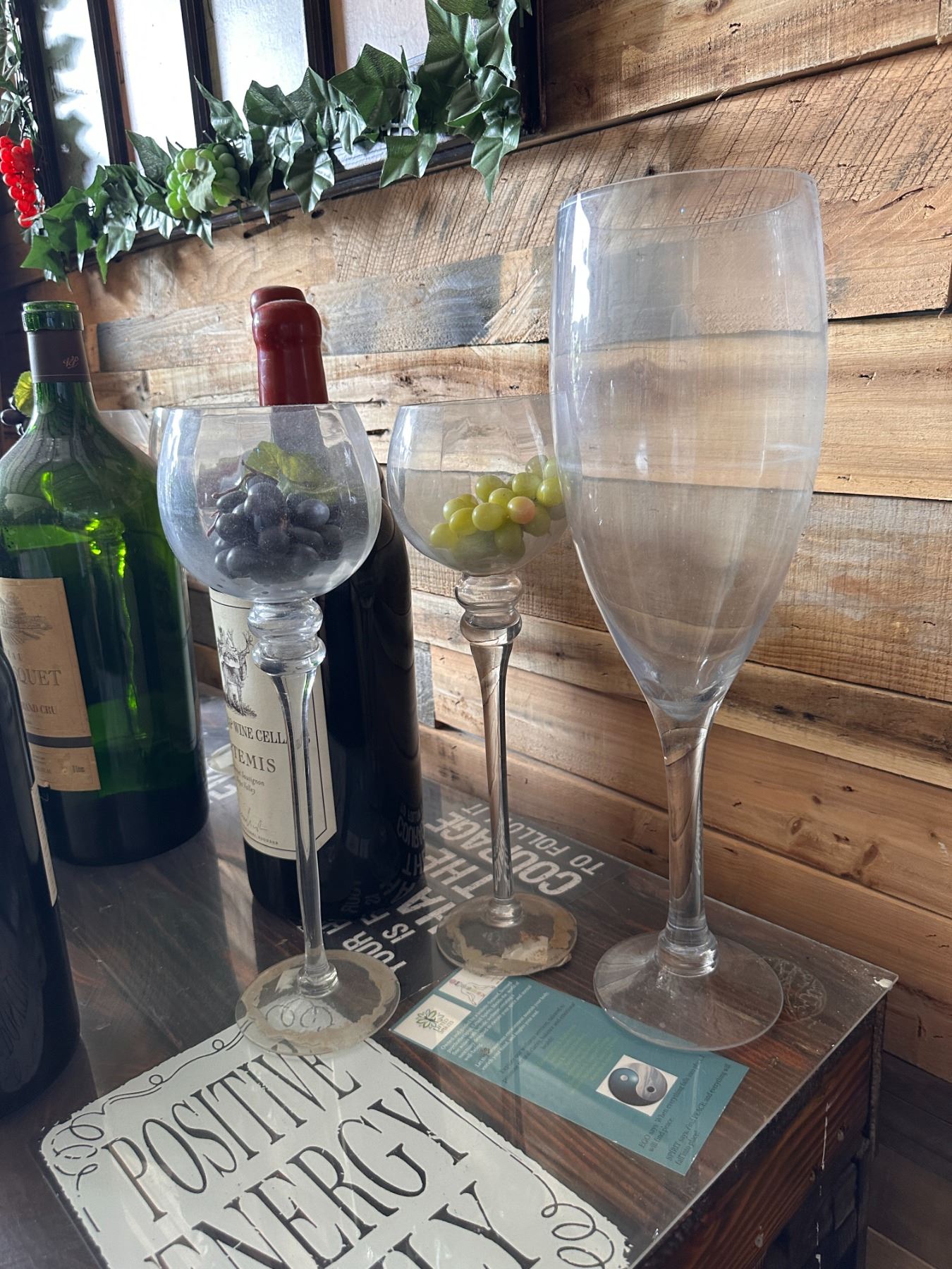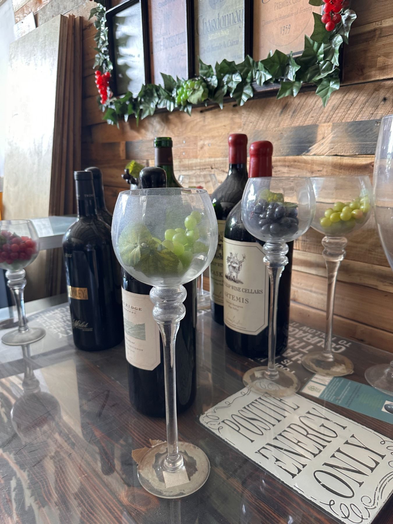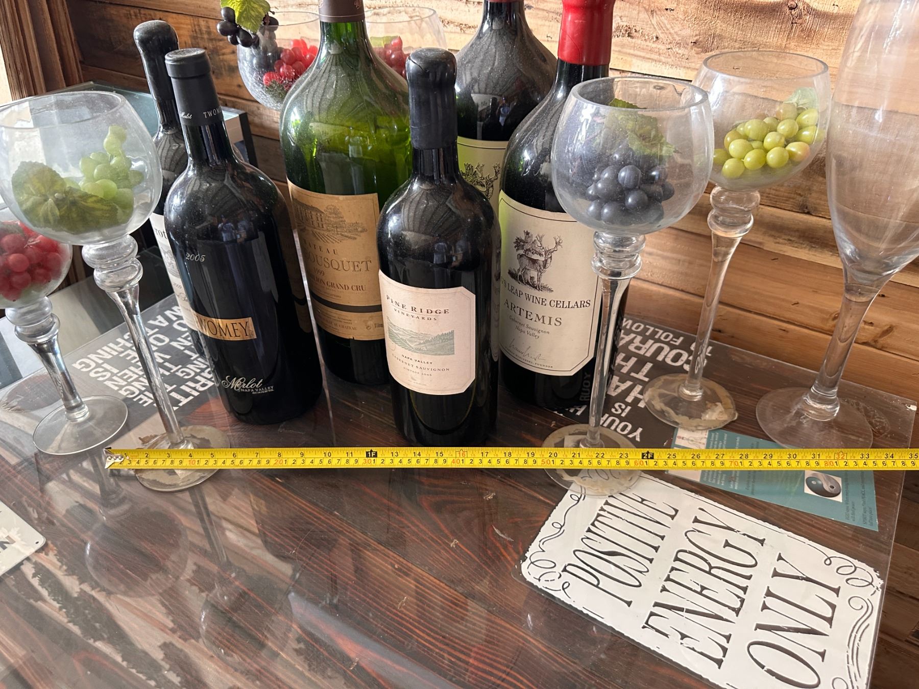Qty 6 Empty Wine Bottles & 4 Stemmed Glasses w/ Artificial Grapes, Misc Sizes