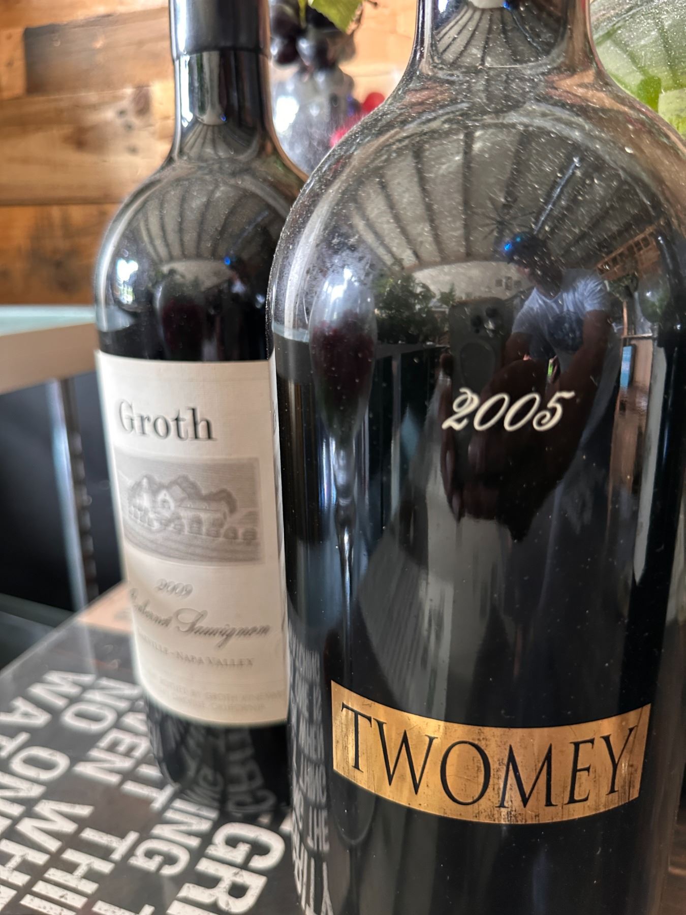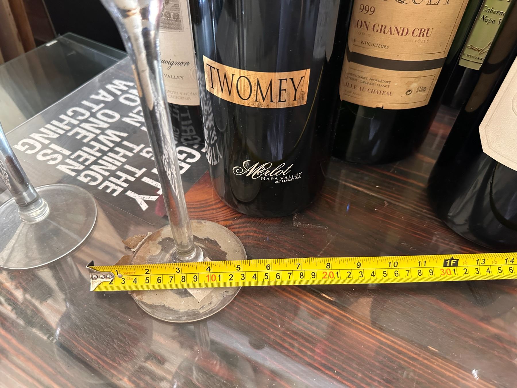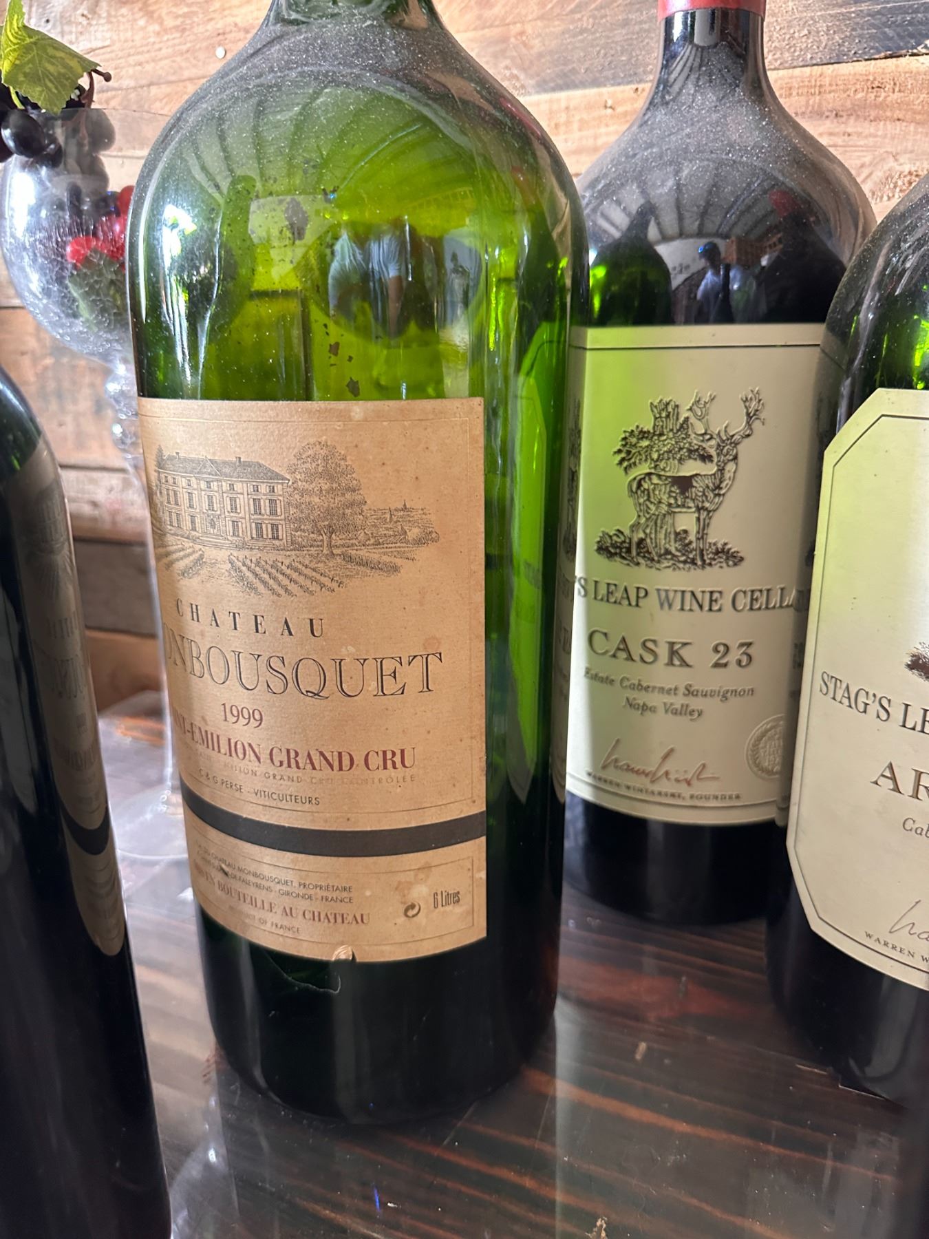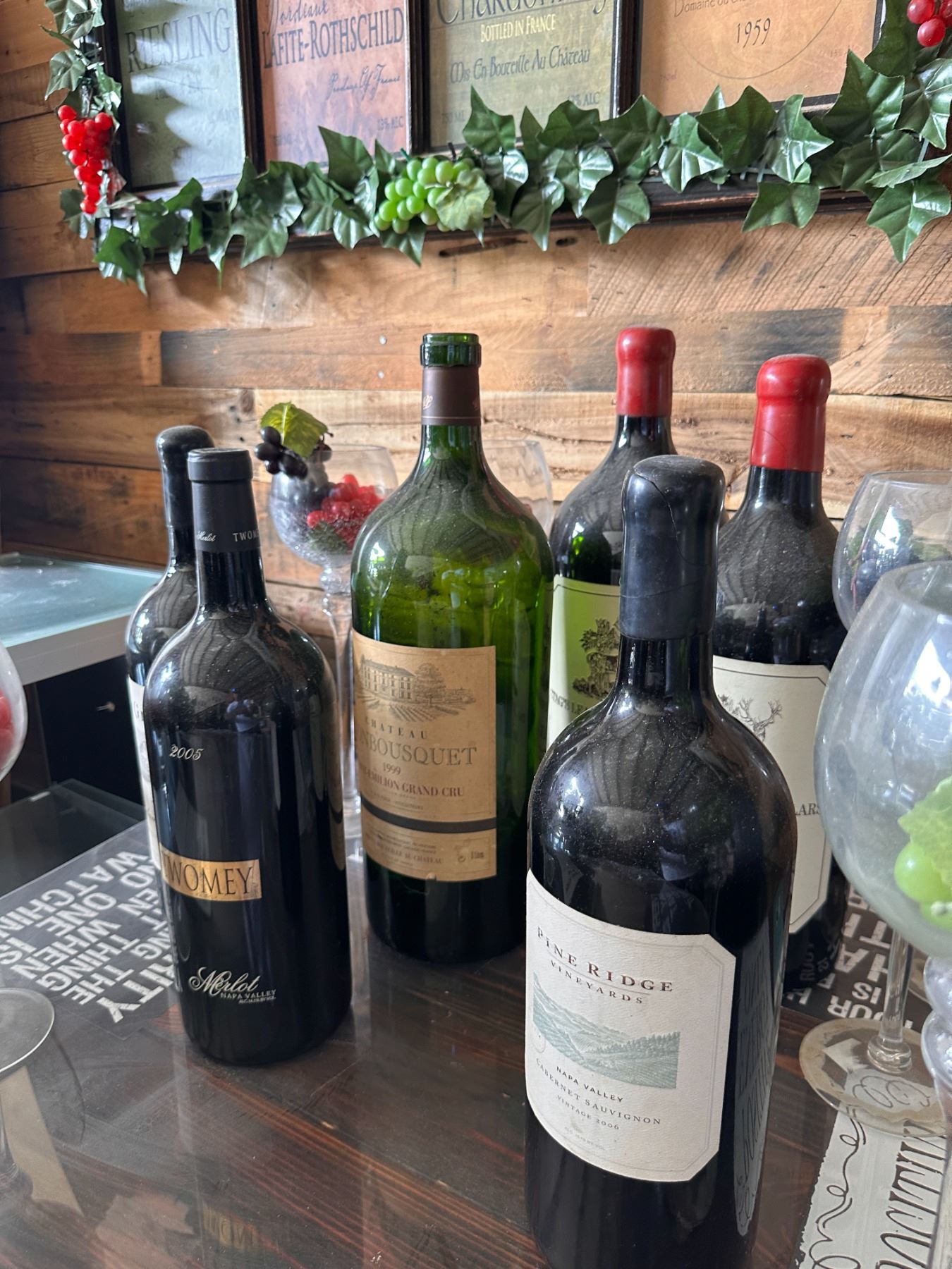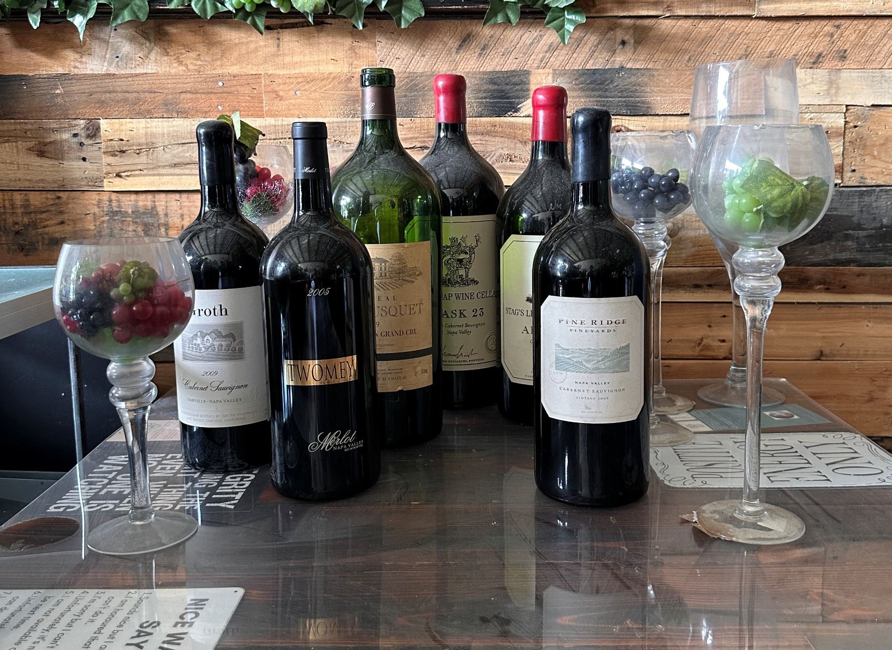 Qty 6 Empty Wine Bottles & 4 Stemmed Glasses w/ Artificial Grapes, Misc Sizes