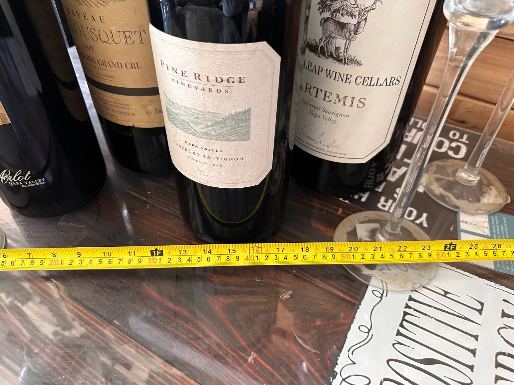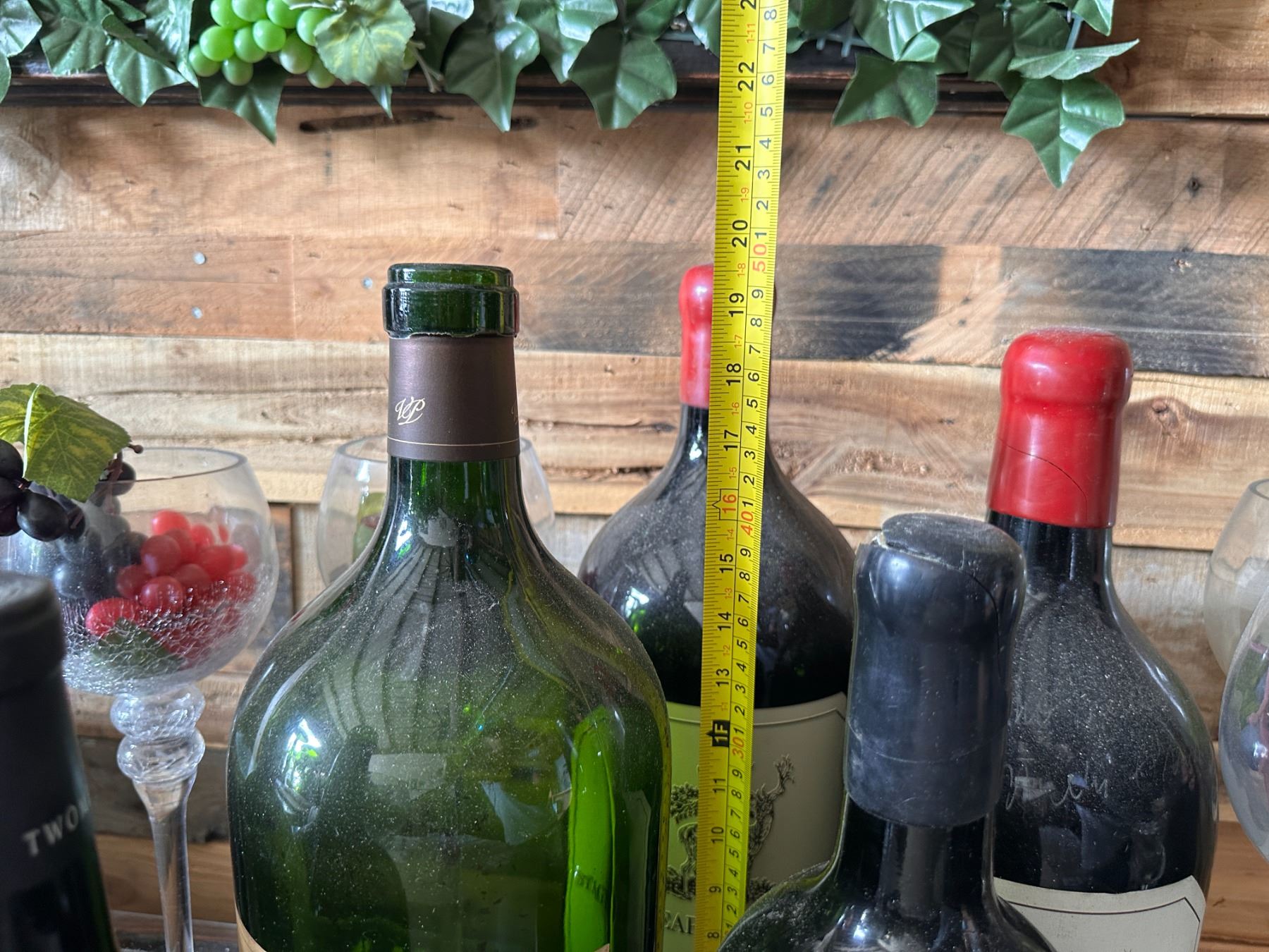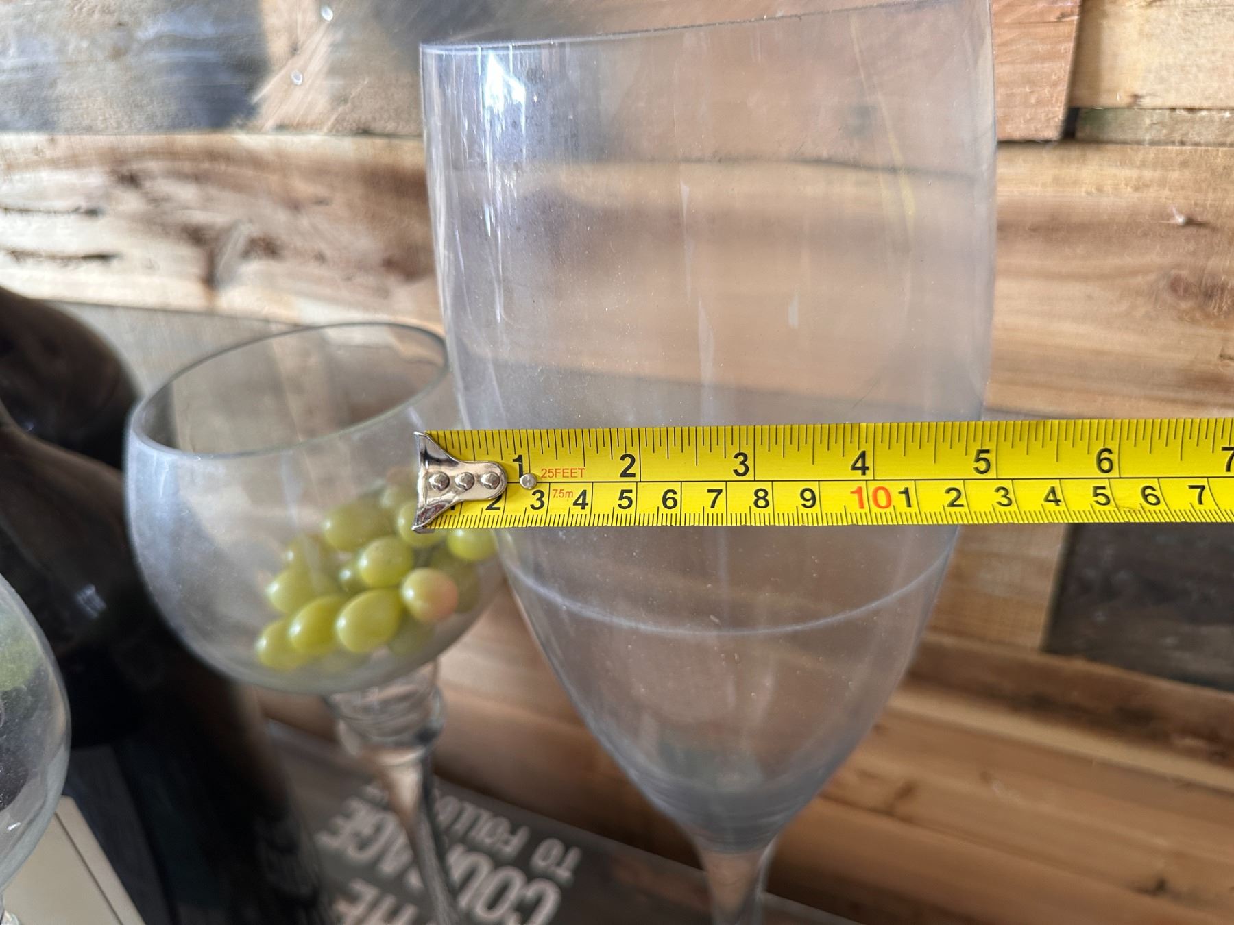Lot 30 Qty 6 Empty Wine Bottles & 4 Stemmed Glasses w/ Artificial Grapes, Misc Sizes