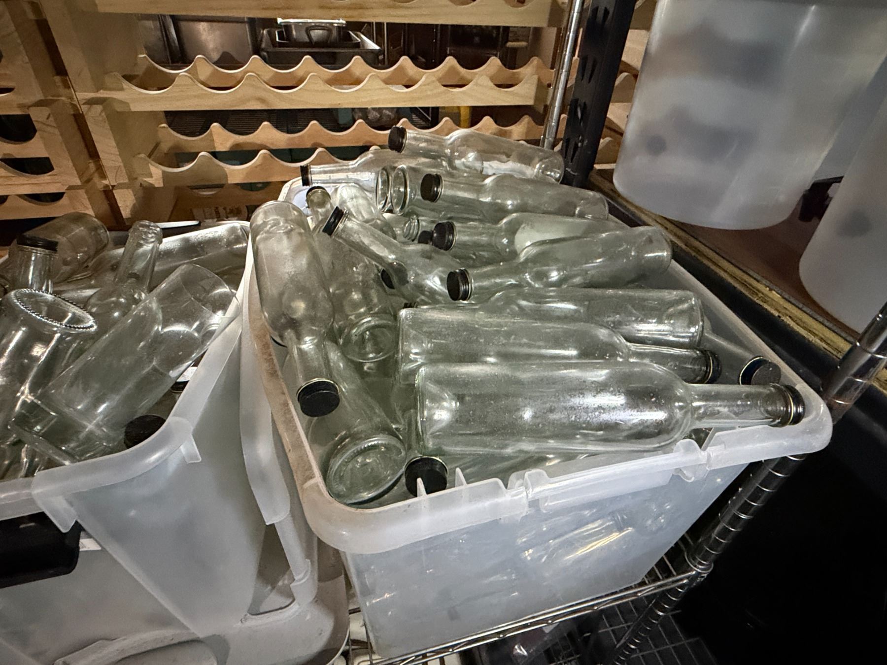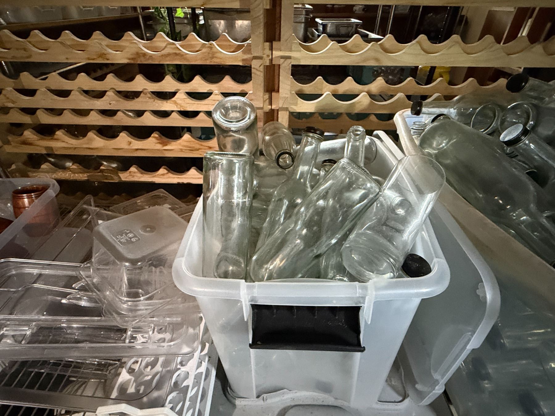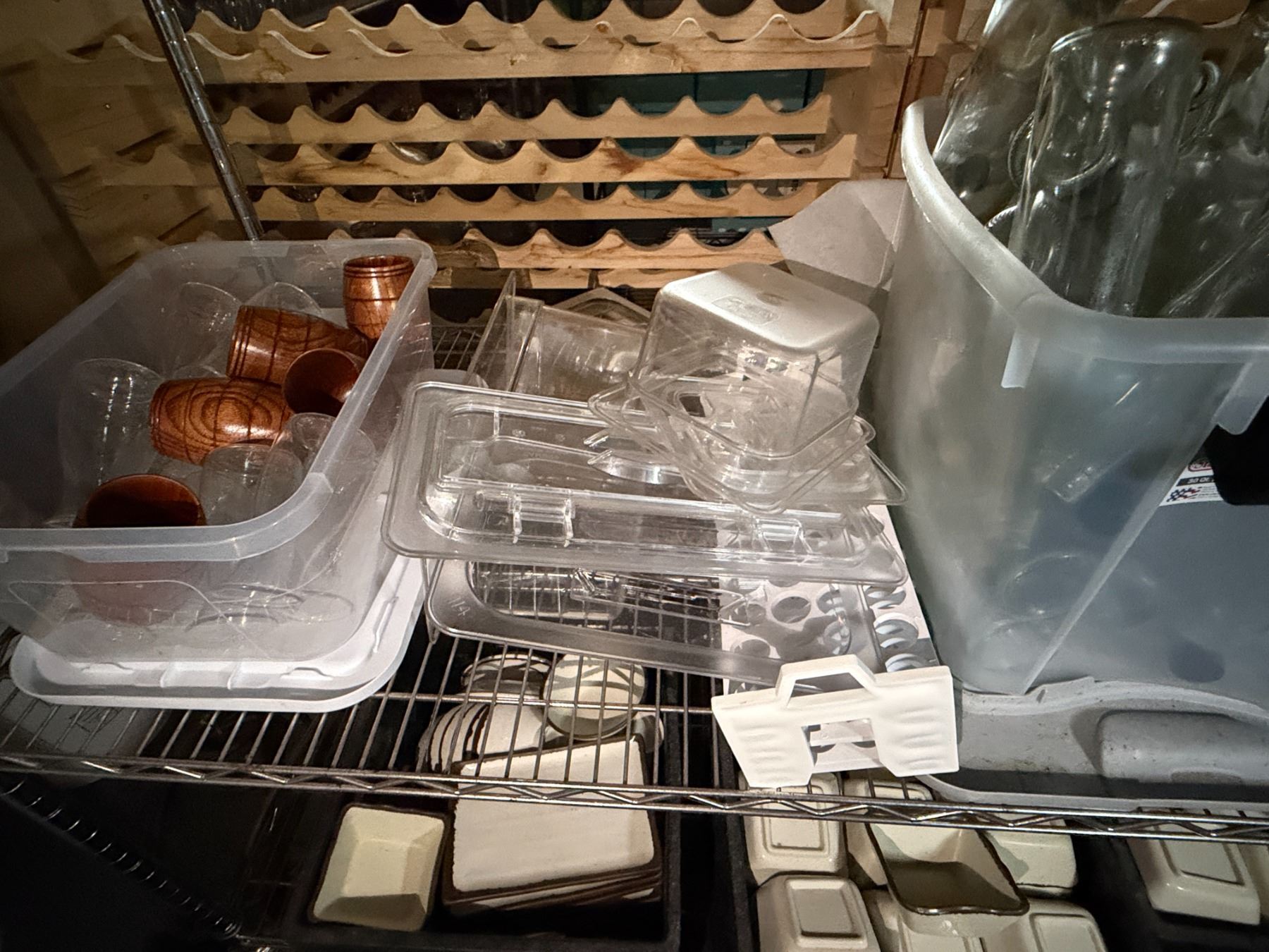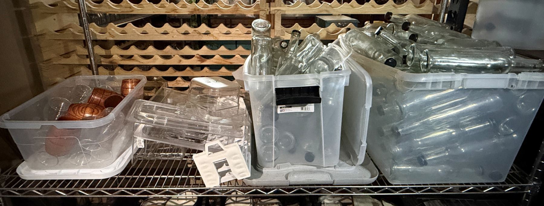 Multiple Clear Bottles, Plastic Food Storage Containers, Wooden Cups, Carafes, etc Misc Sizes