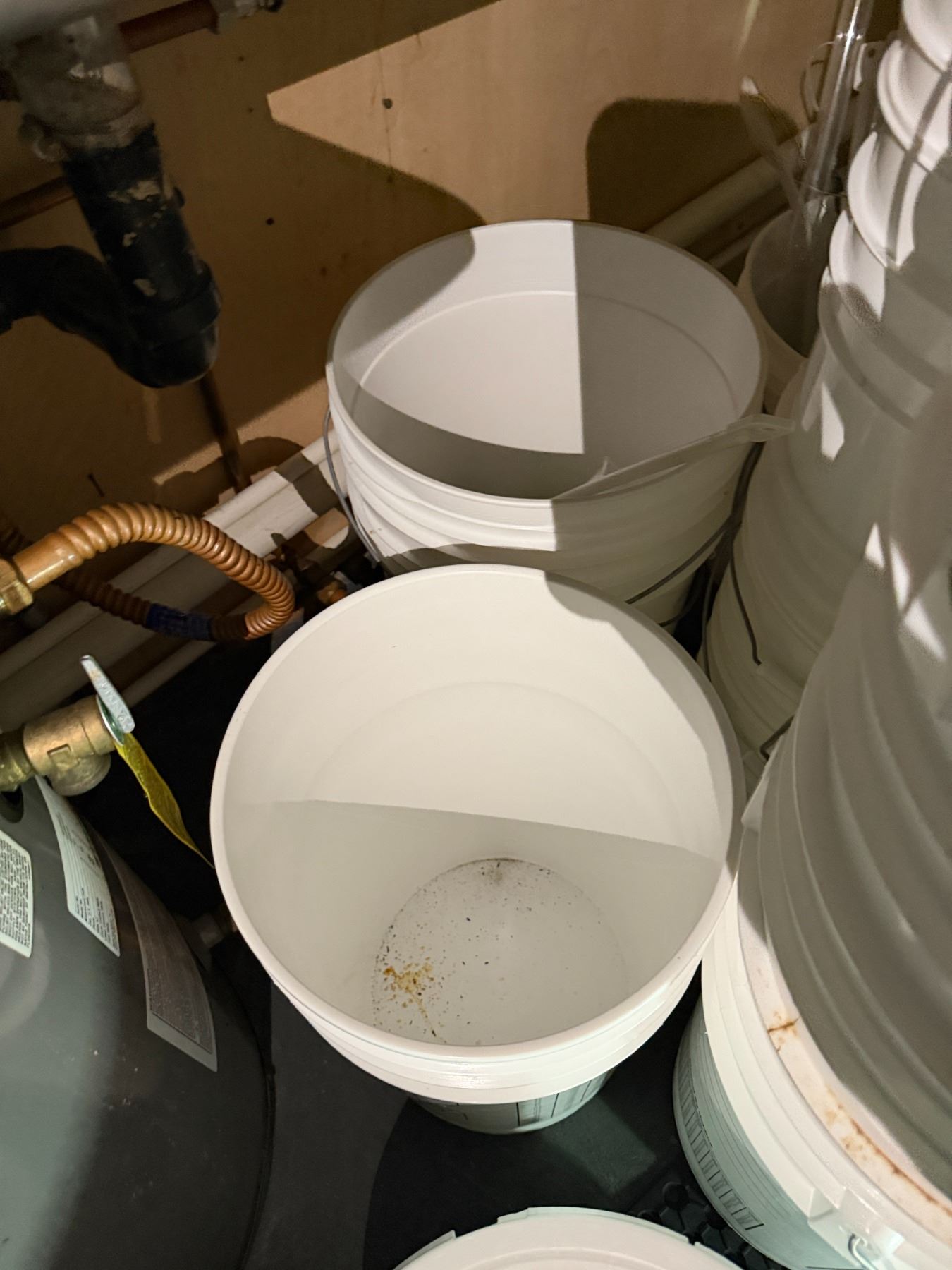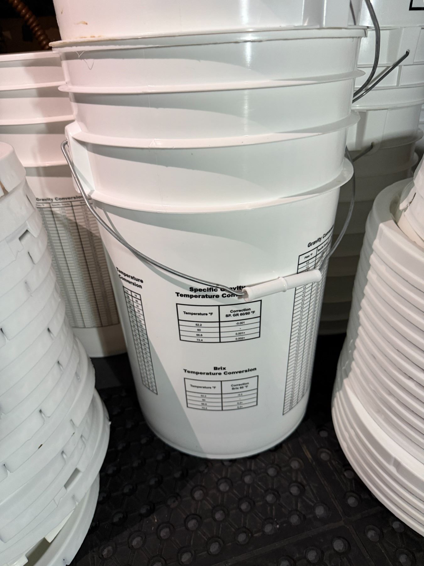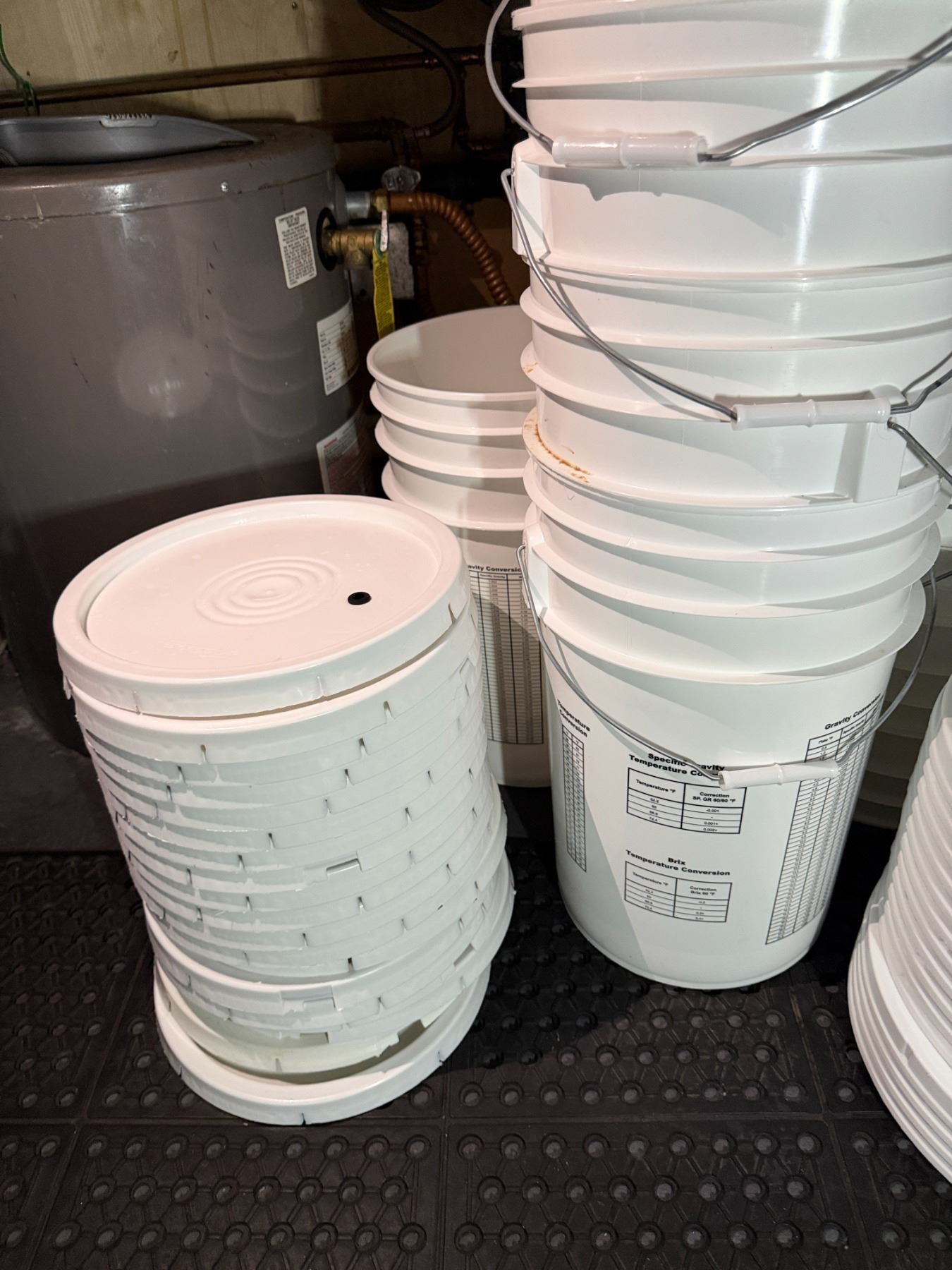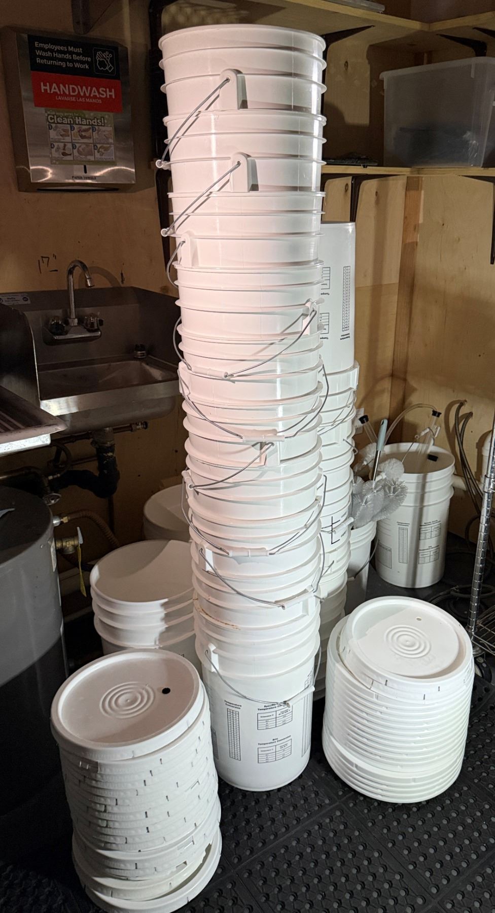 Lot 70 Multiple White Plastic Pails w/ Some Lids, Hoses, etc