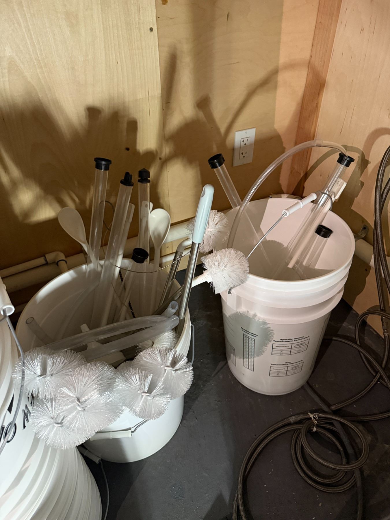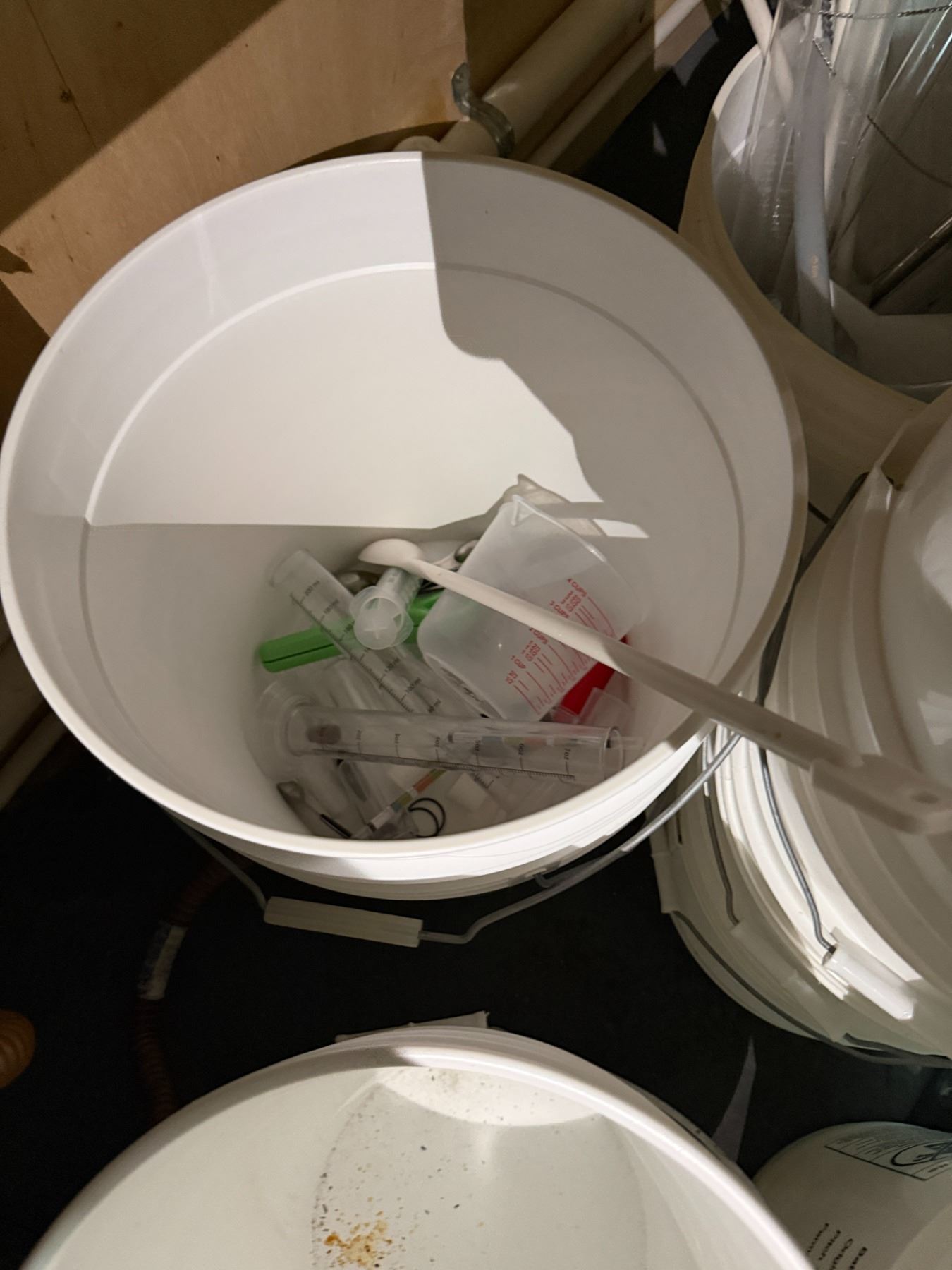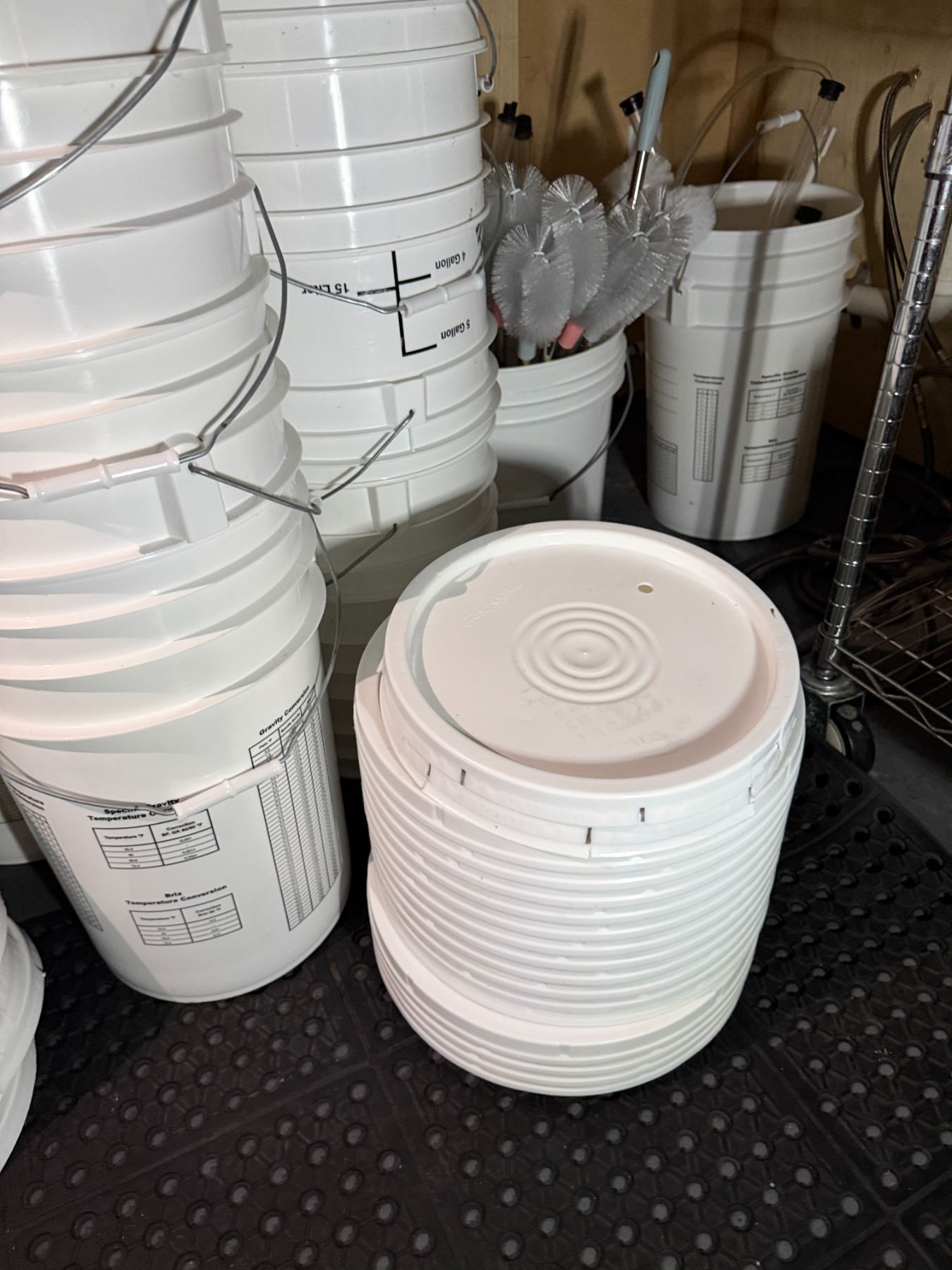 Multiple White Plastic Pails w/ Some Lids, Hoses, etc