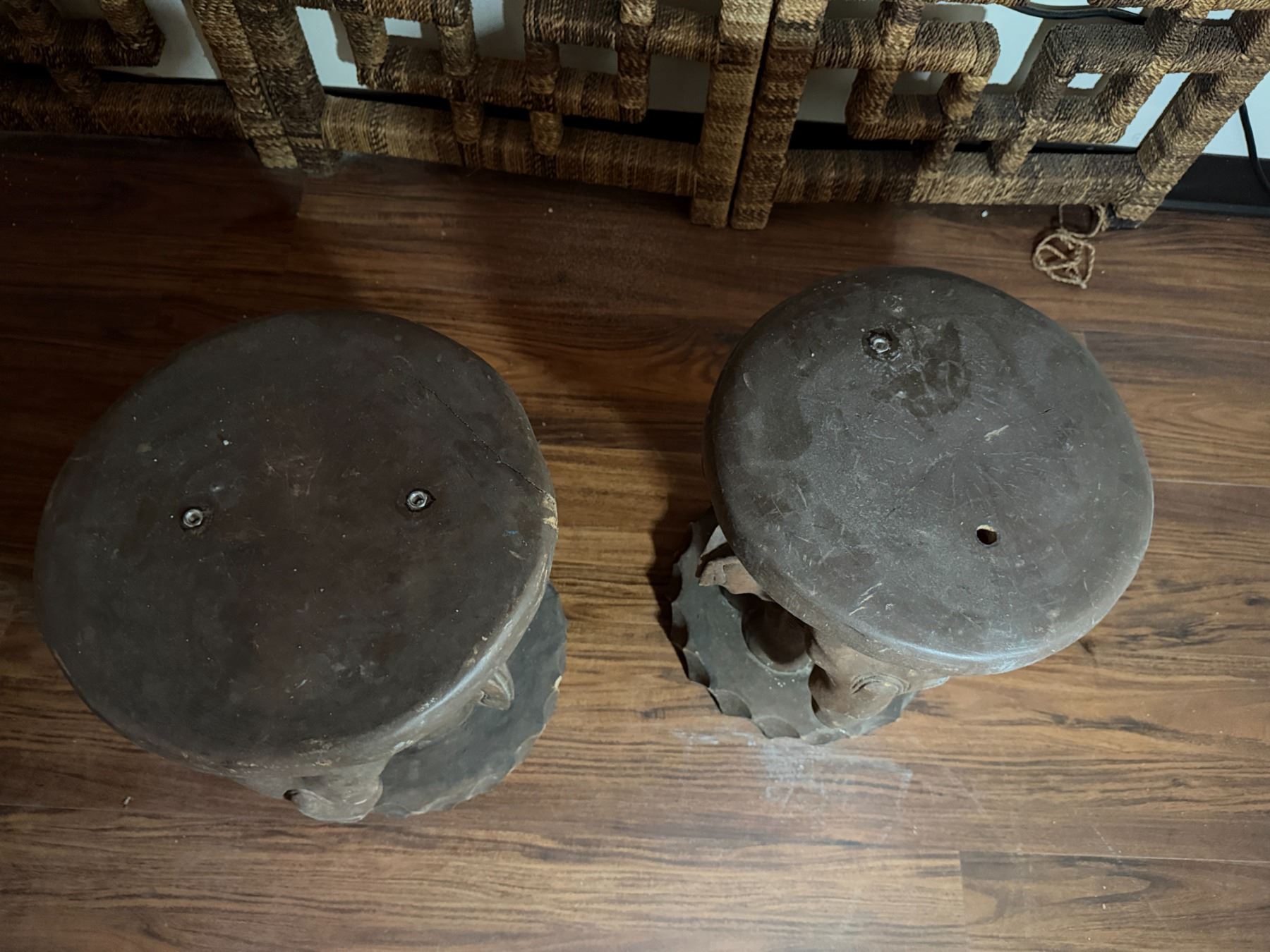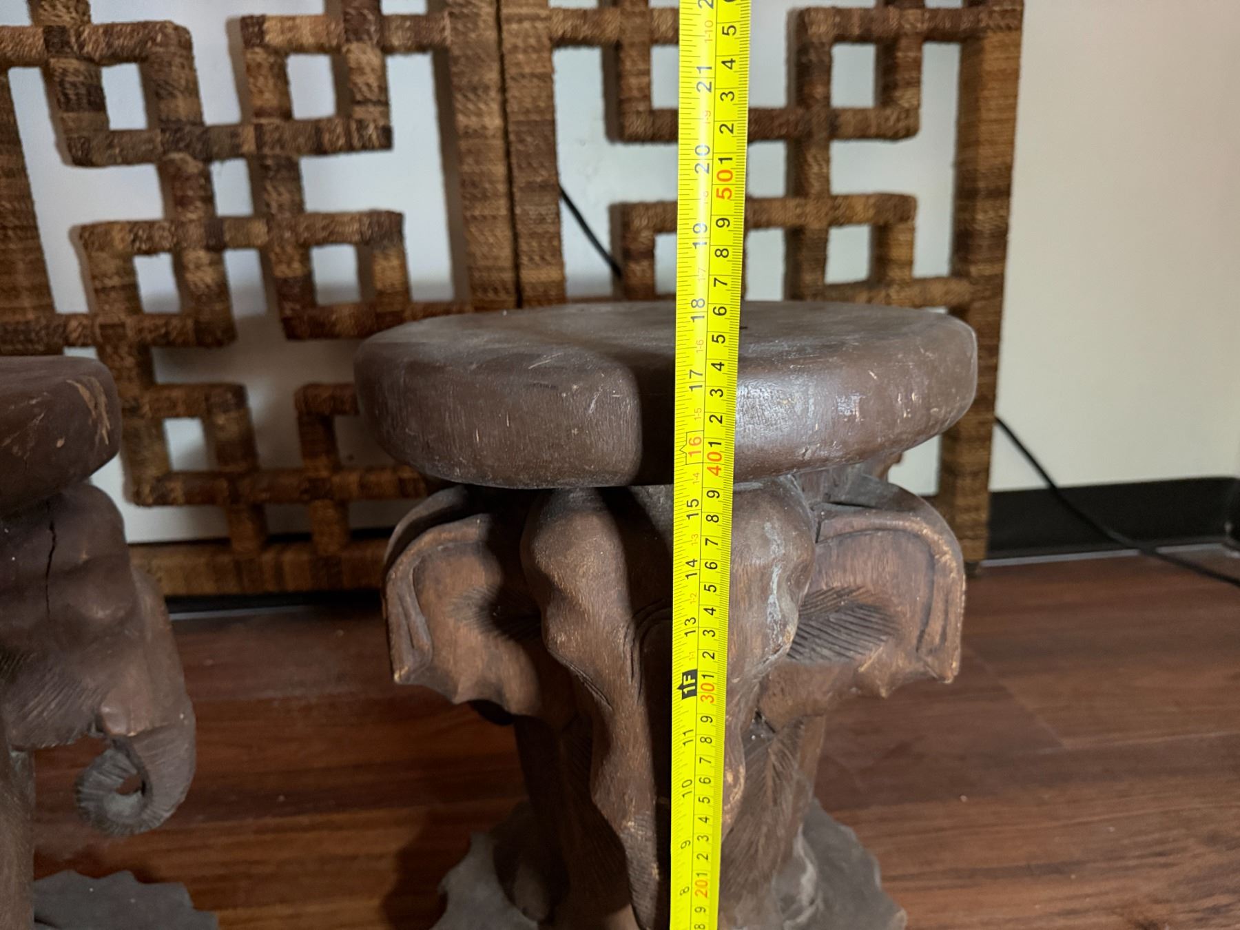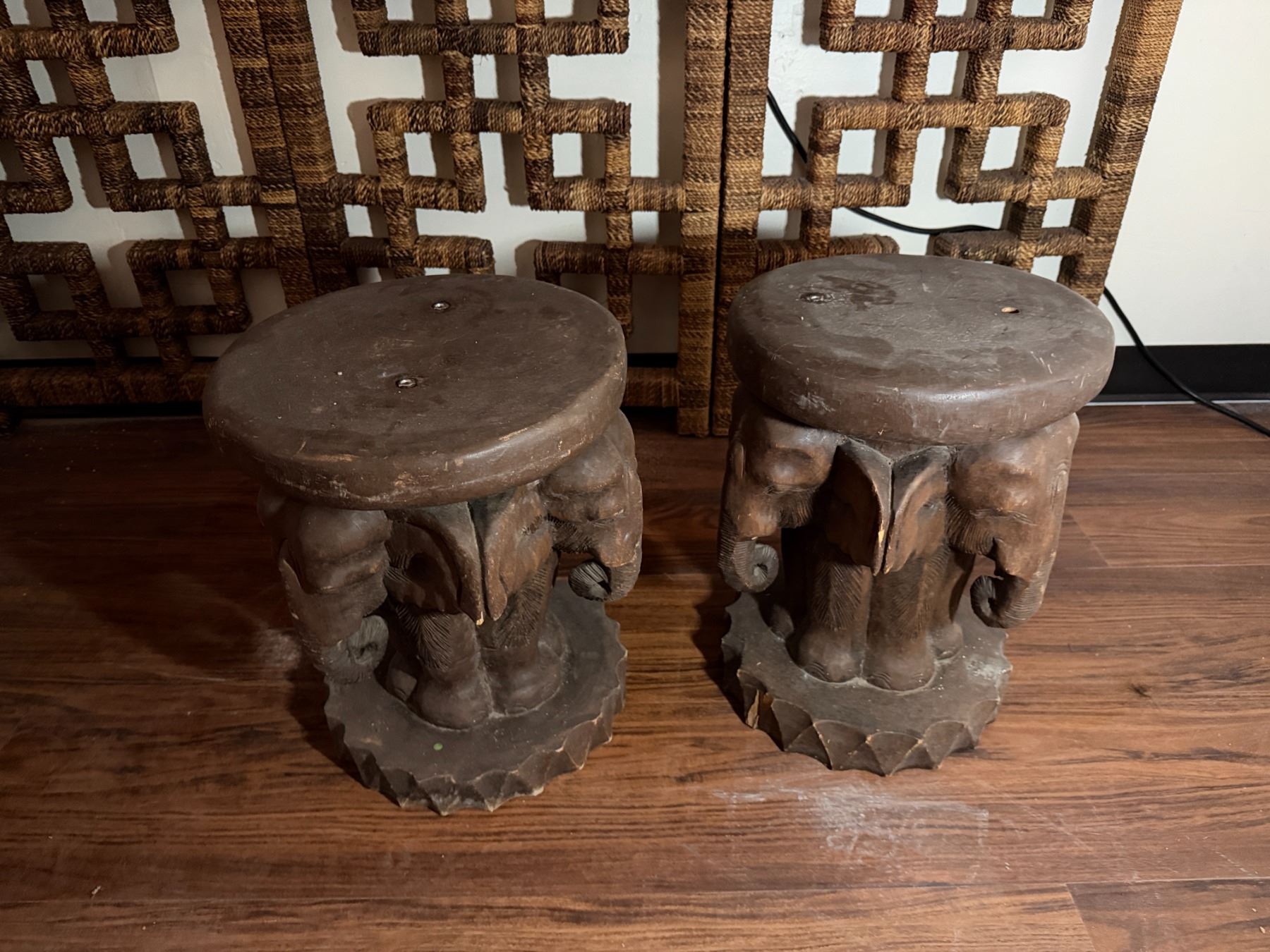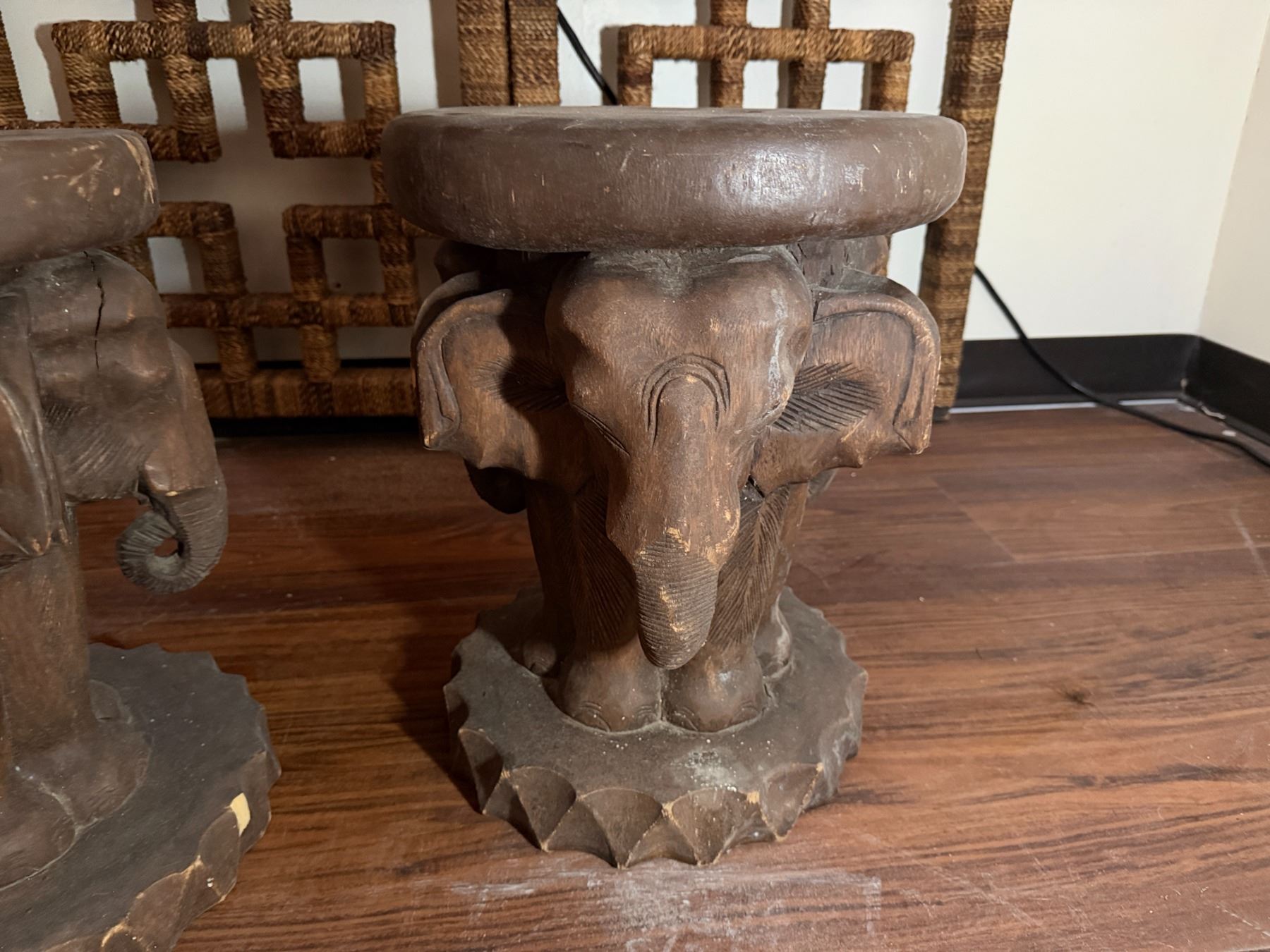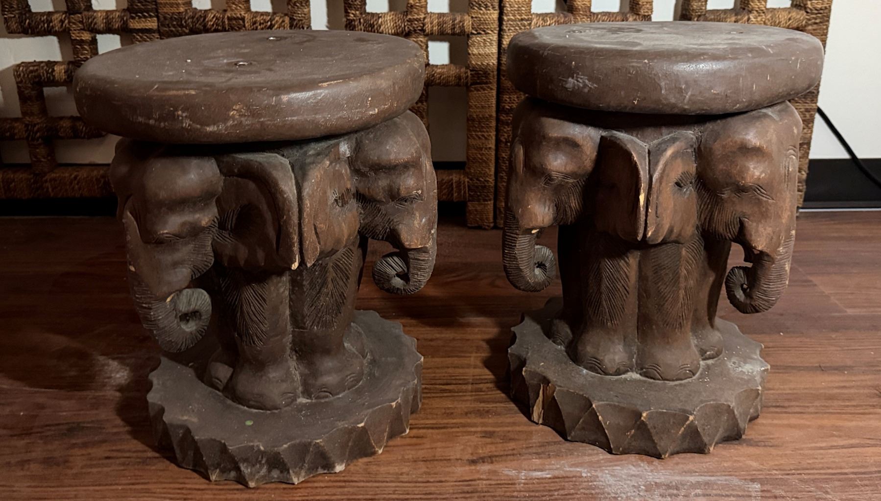 Lot 96 Qty 2 Carved Wooden Elephant Motif Tables 13" Dia, 17"H