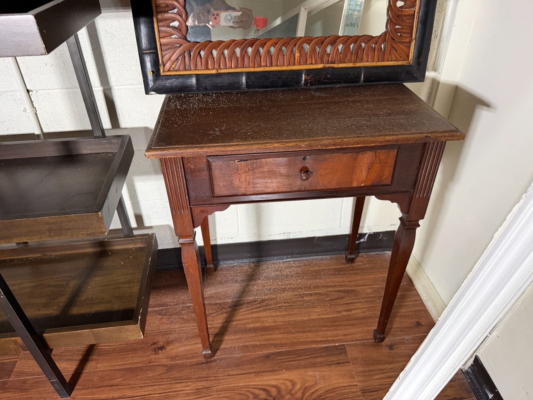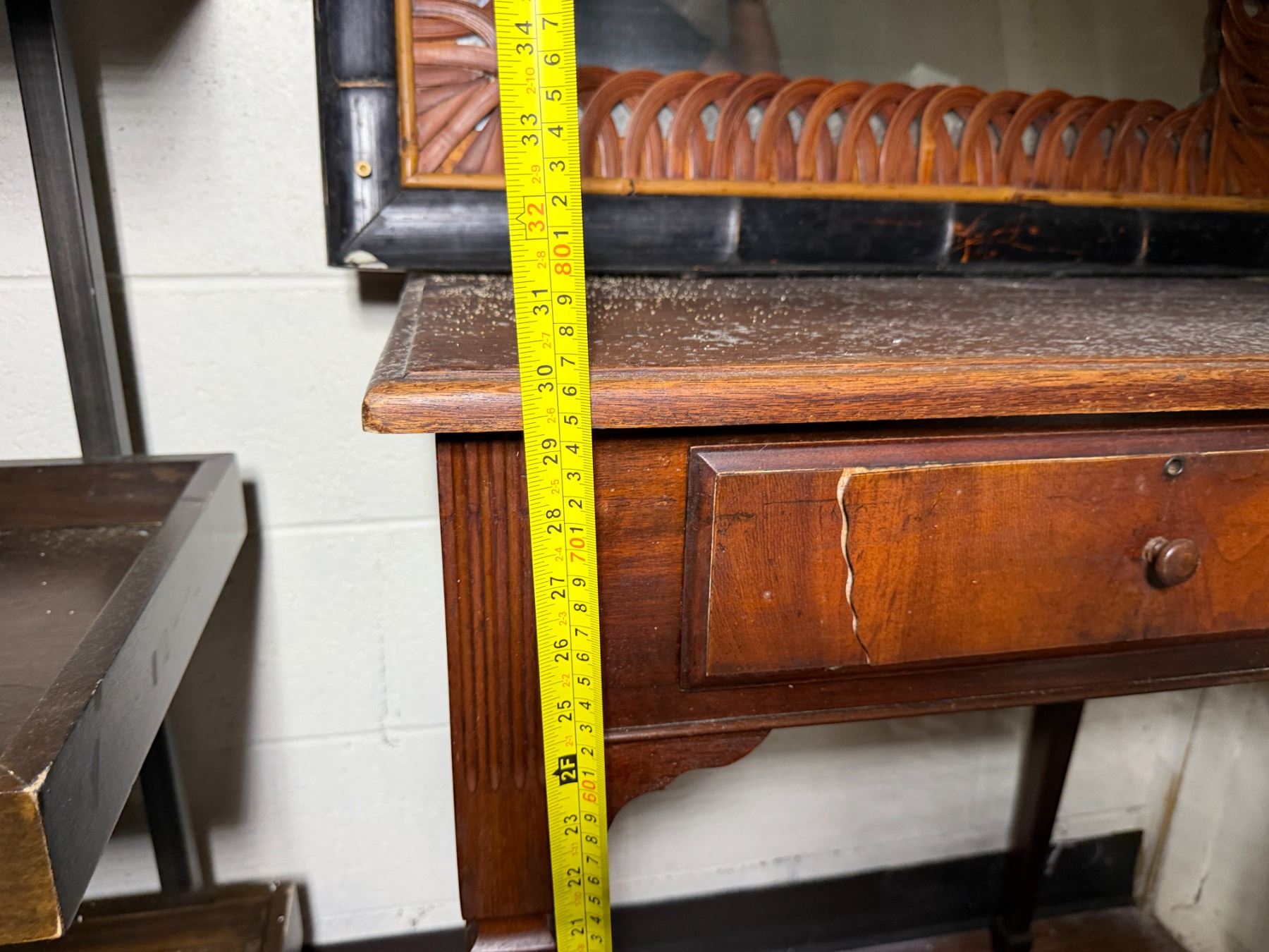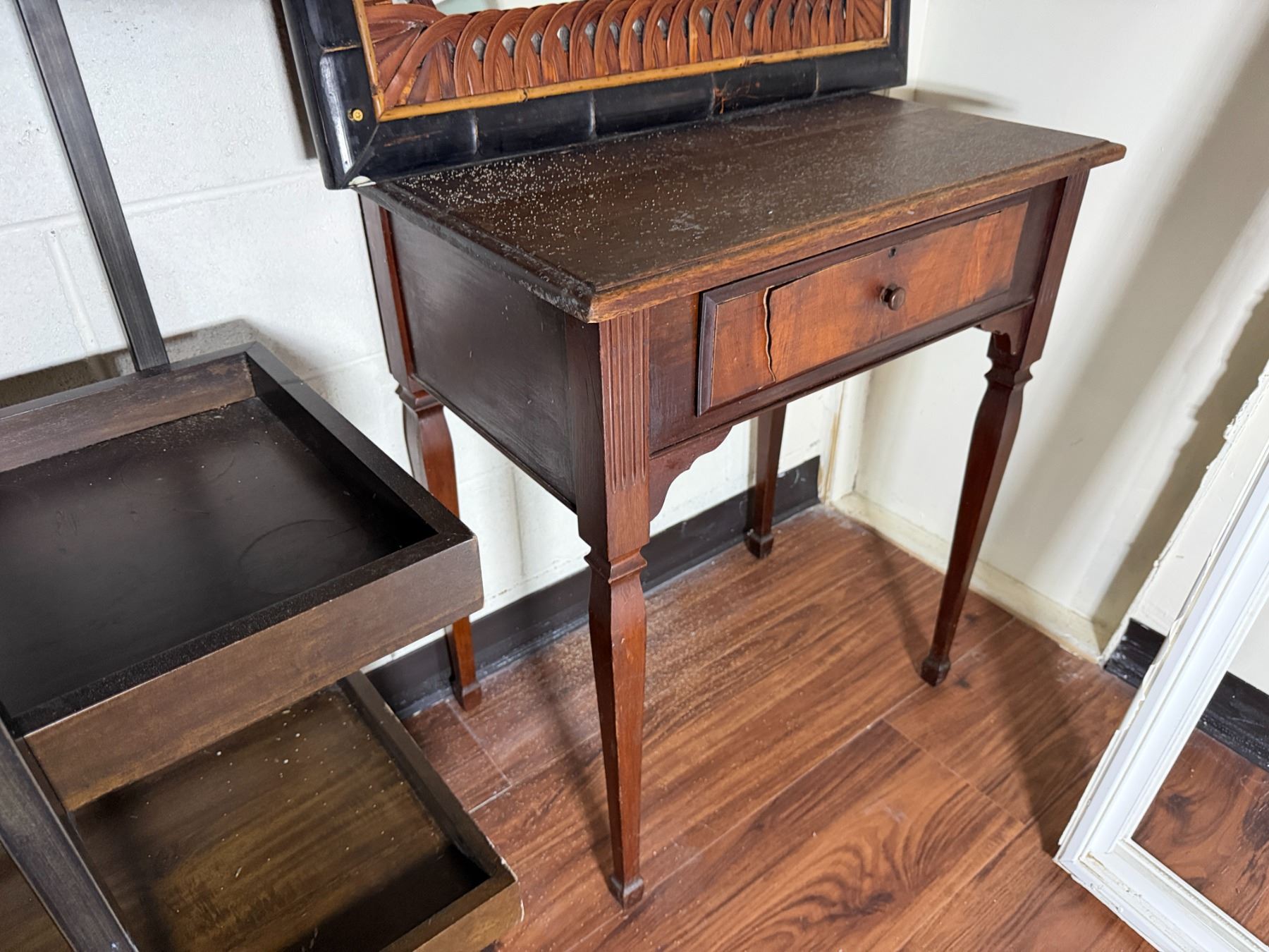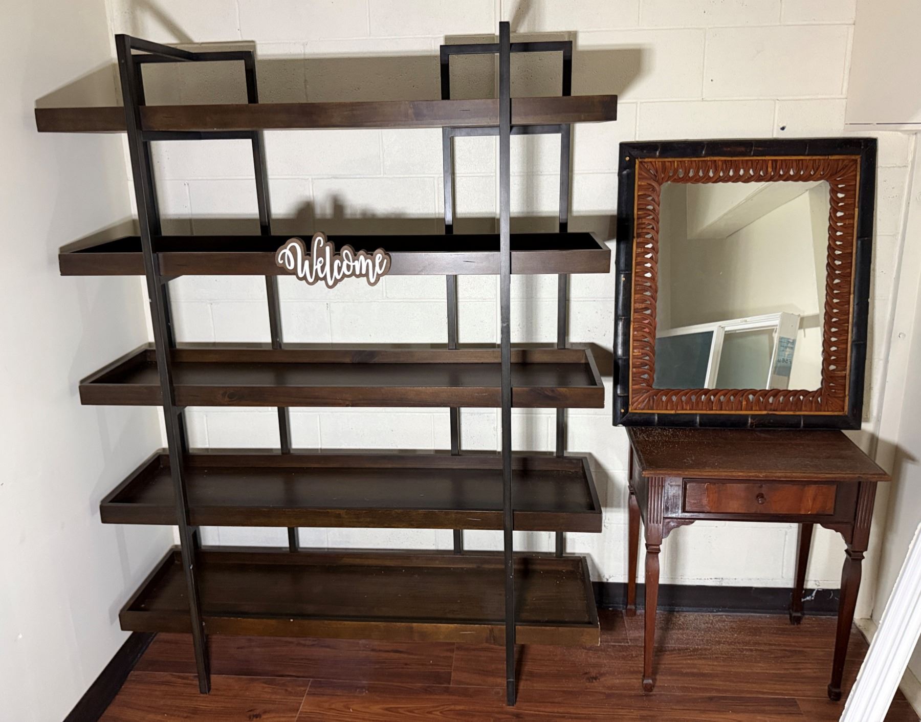 Lot 101 Wooden 5-Tier Shelving Unit, Table w/ Drawer (cracked) & Framed Wall Mirror, Misc Sizes