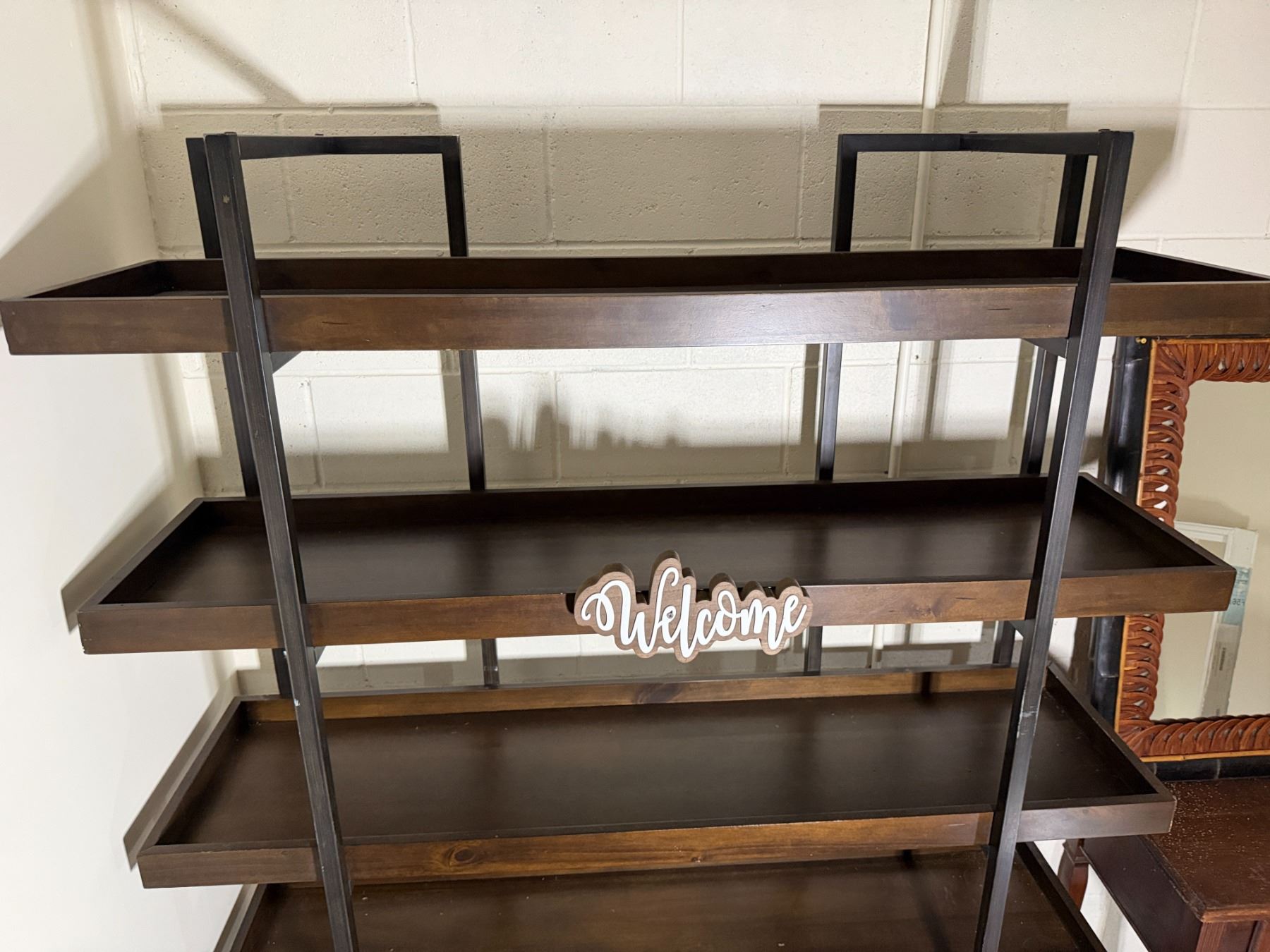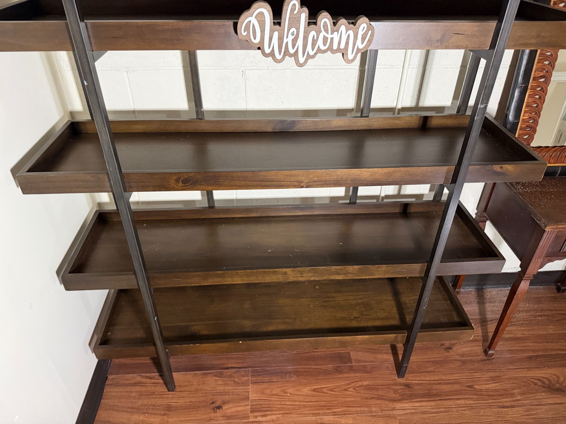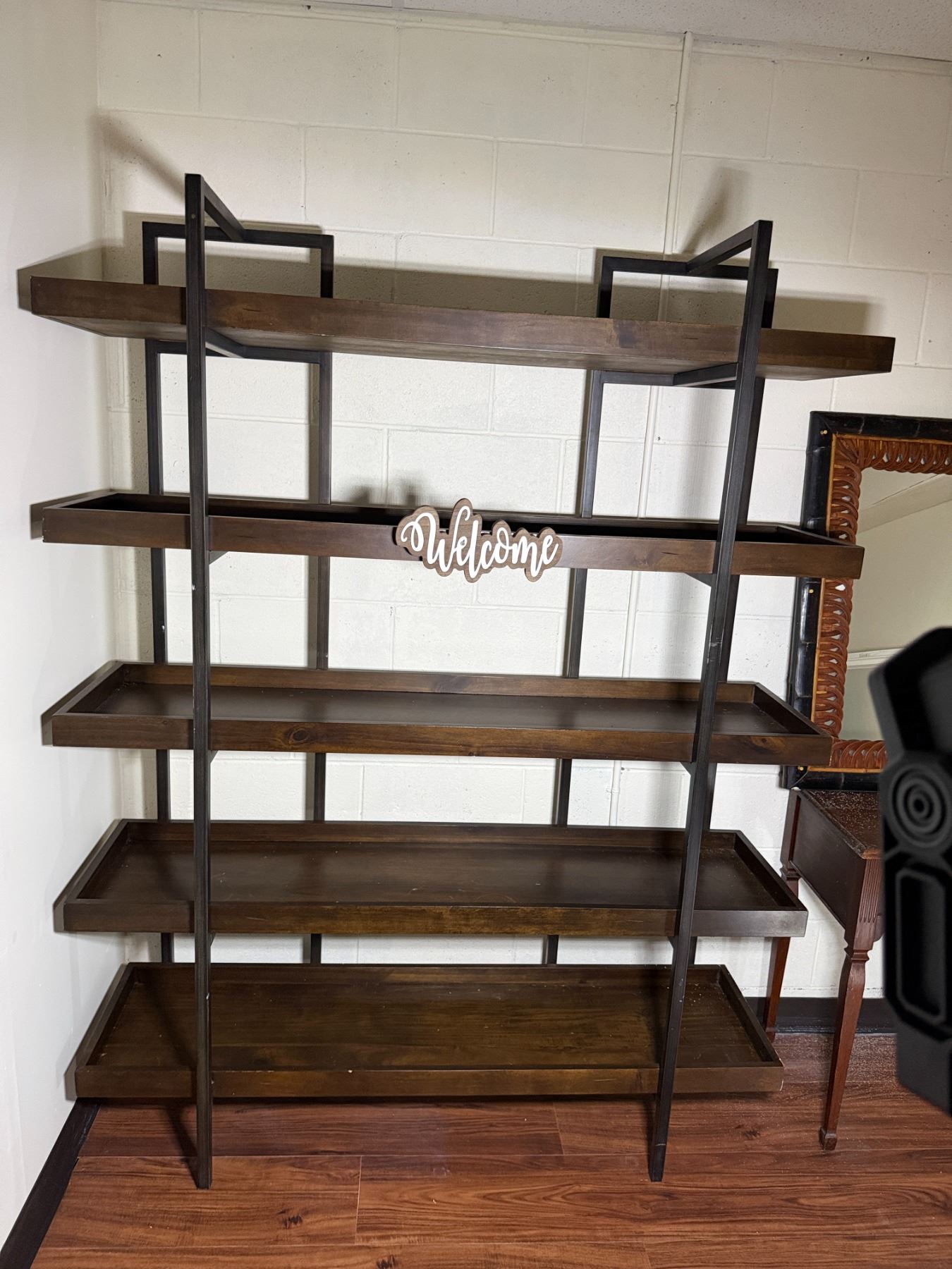 Lot 101 Wooden 5-Tier Shelving Unit, Table w/ Drawer (cracked) & Framed Wall Mirror, Misc Sizes