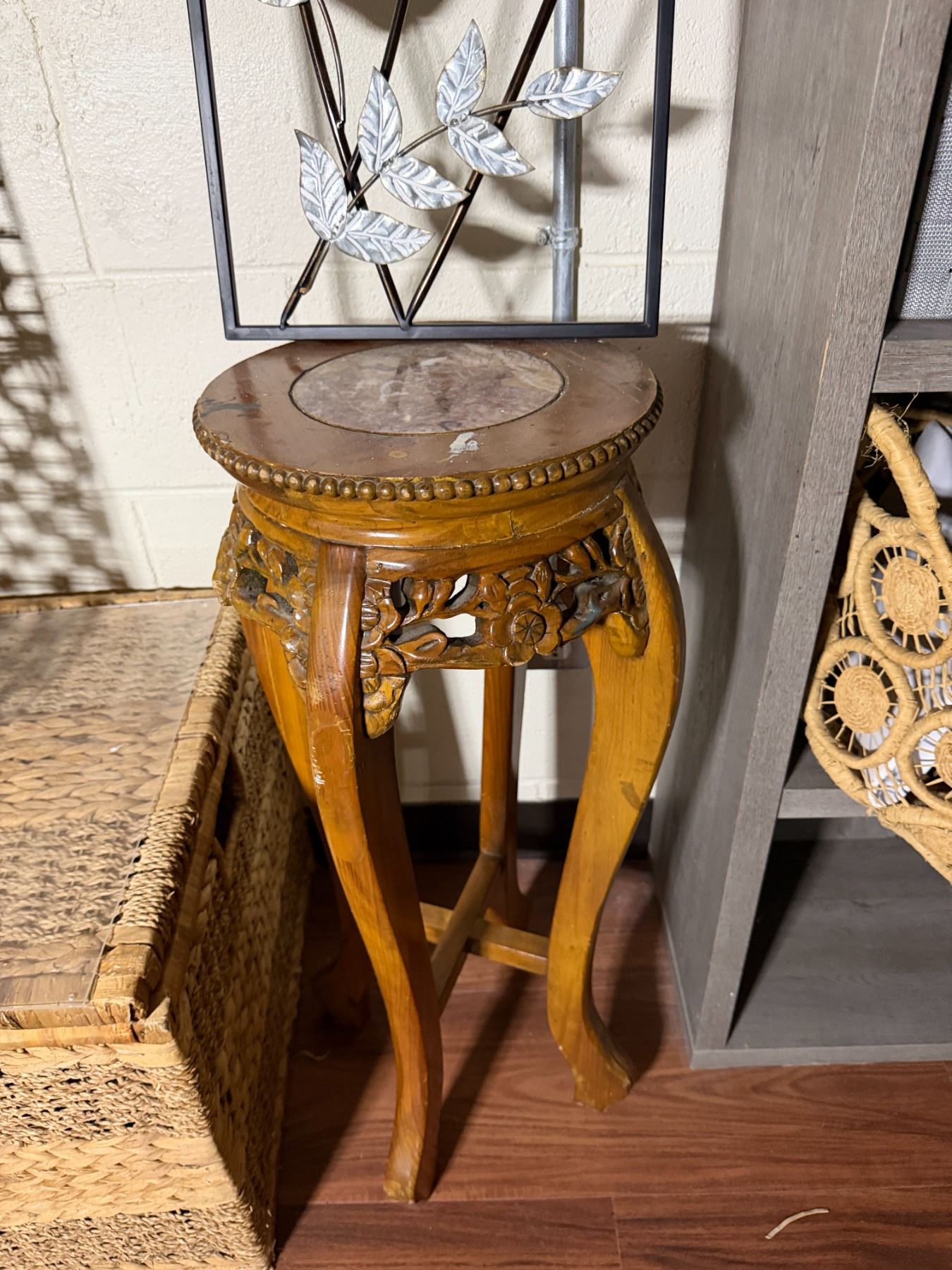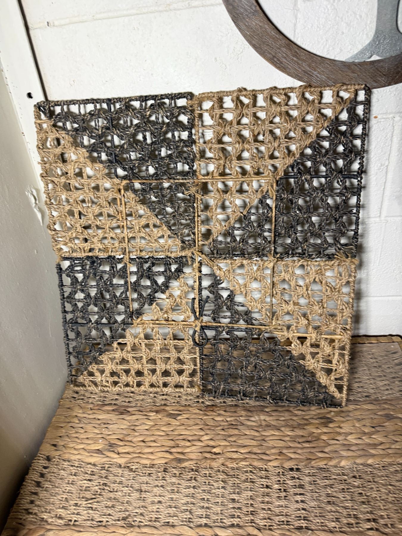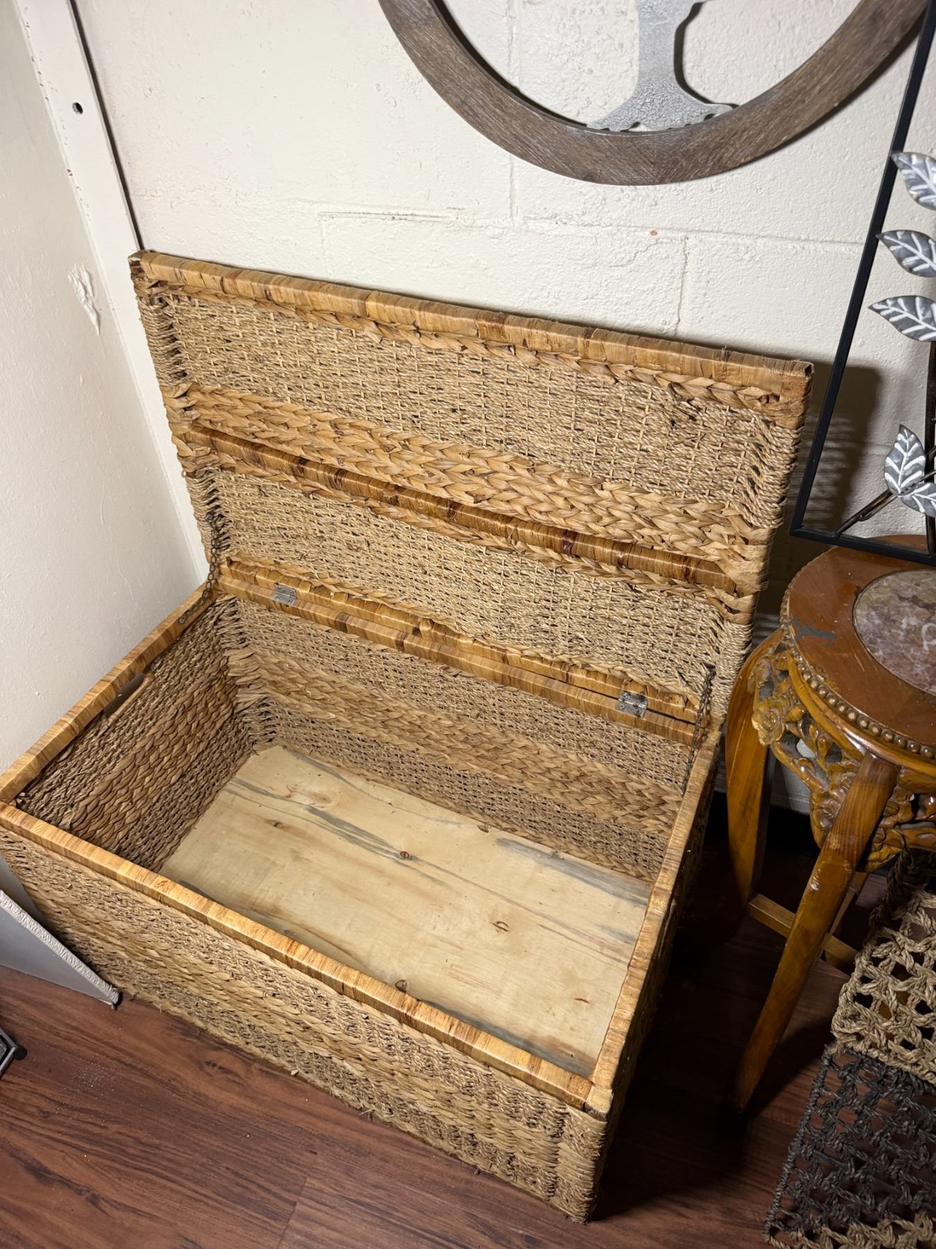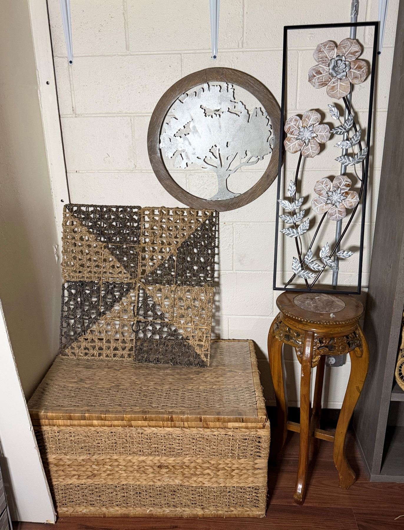 Lot 107 Woven Chest, 3 Misc Wall Hangings & Round Table w/ Cabriole Legs, Misc Sizes