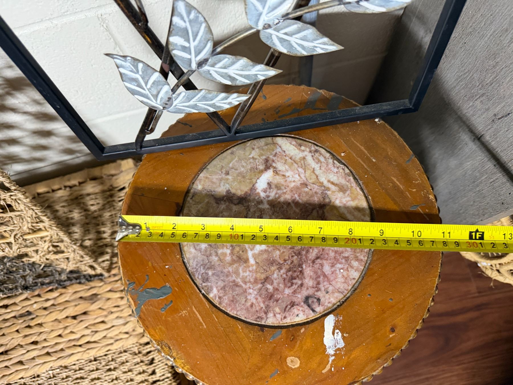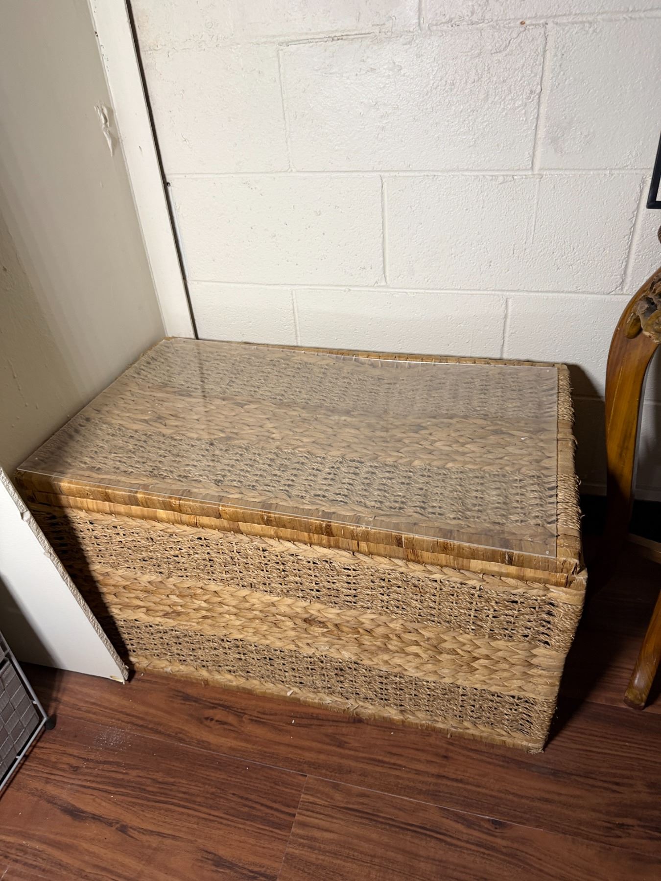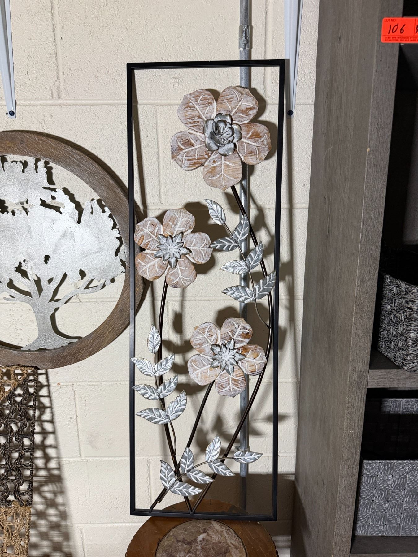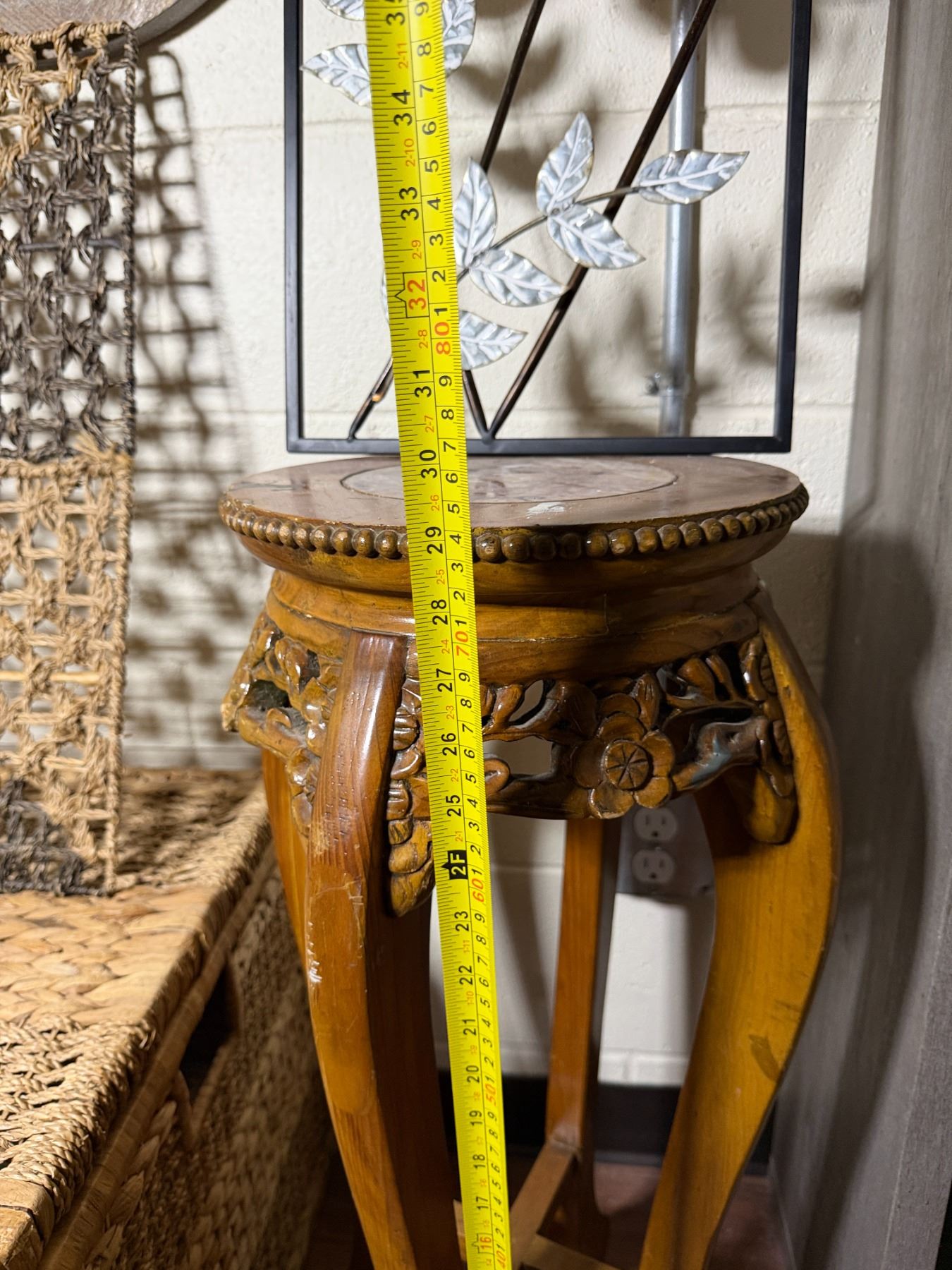 Lot 107 Woven Chest, 3 Misc Wall Hangings & Round Table w/ Cabriole Legs, Misc Sizes