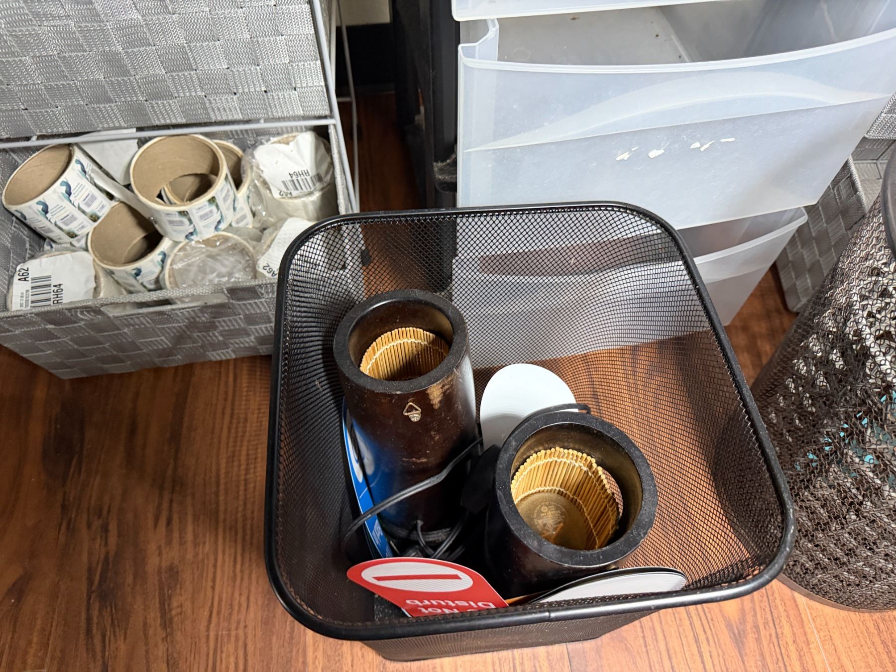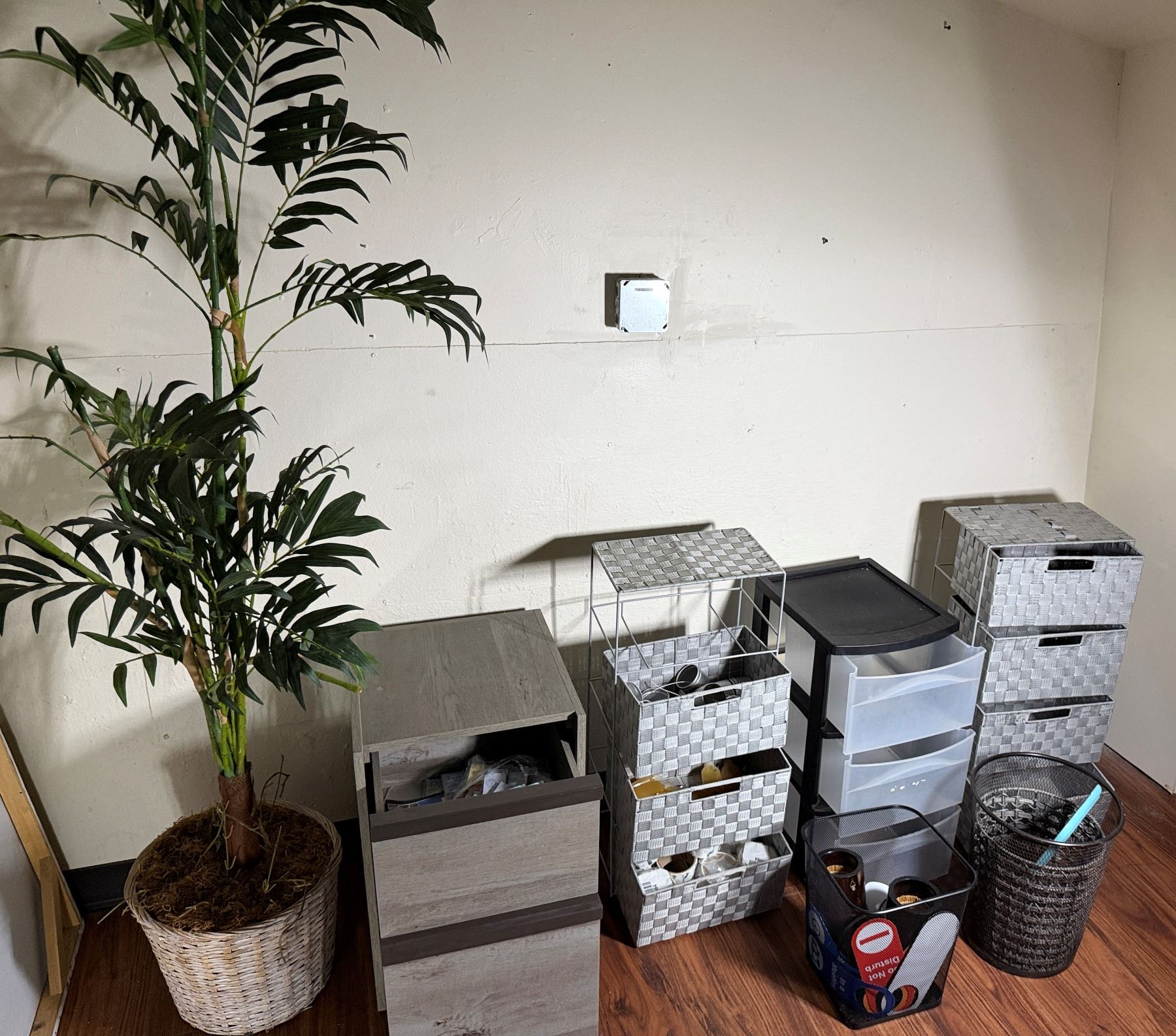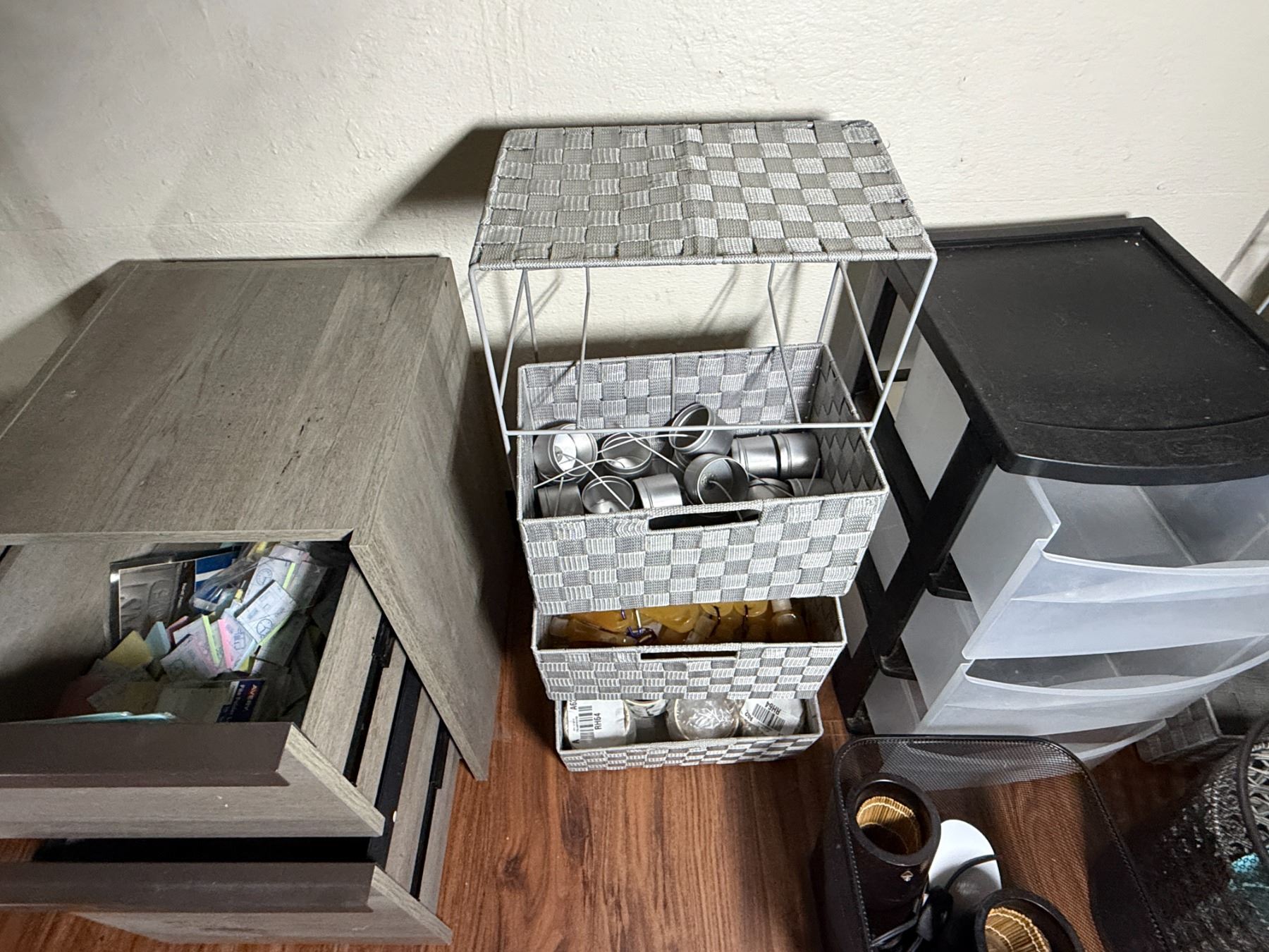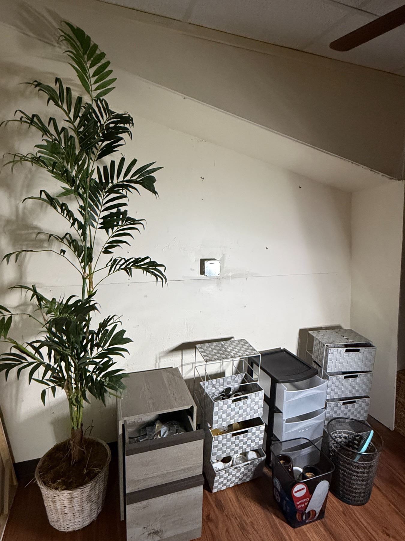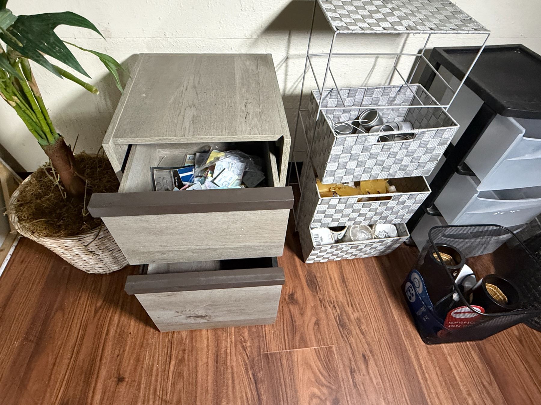 Multiple Storage Containers, Artificial Potted Palm, Misc Supplies, etc