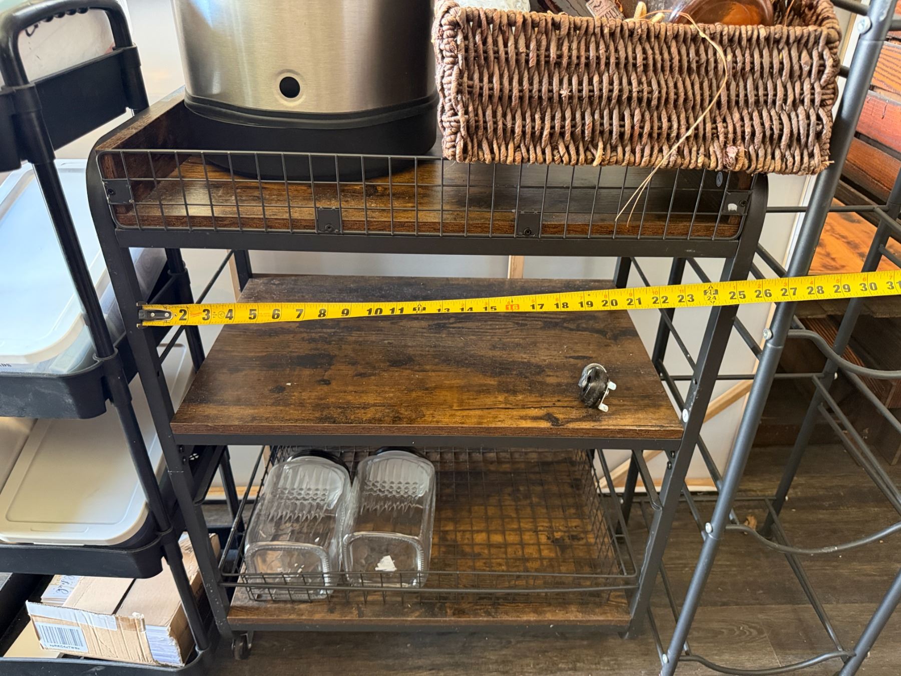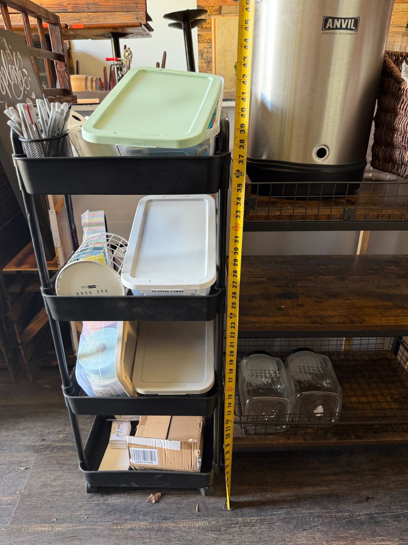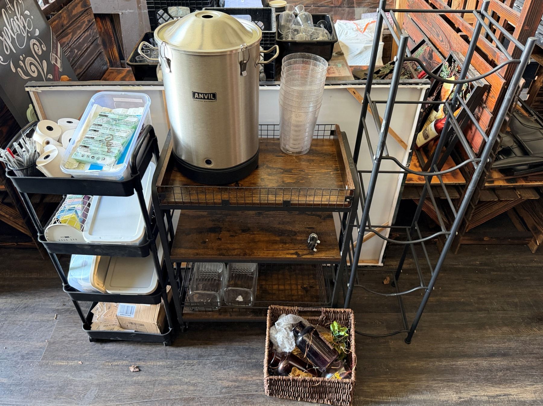 Qty 3 Shelving Units Misc Sizes & Contents: Baskets, Anvil Bucket Fermenter, Cards, Paper Rolls, etc