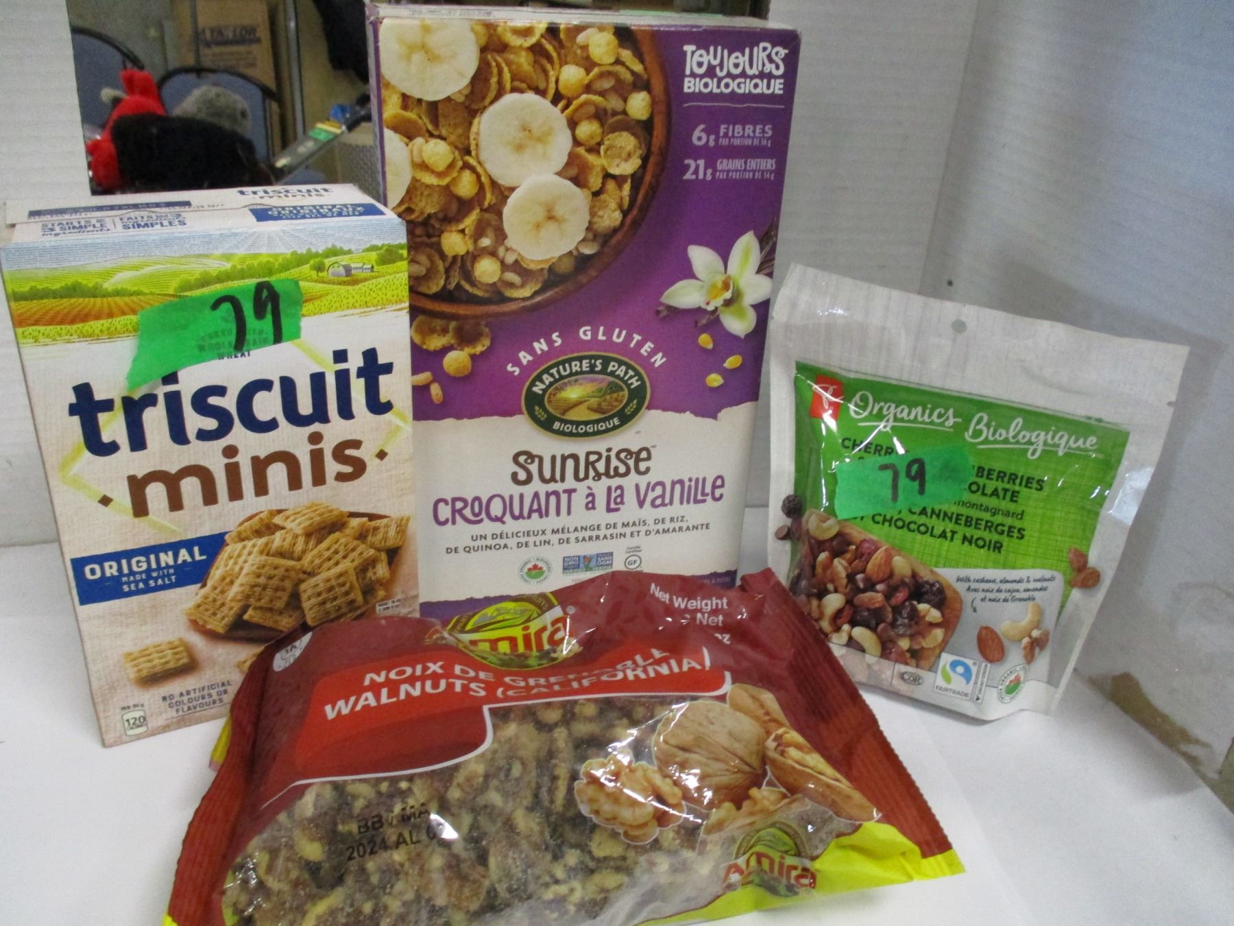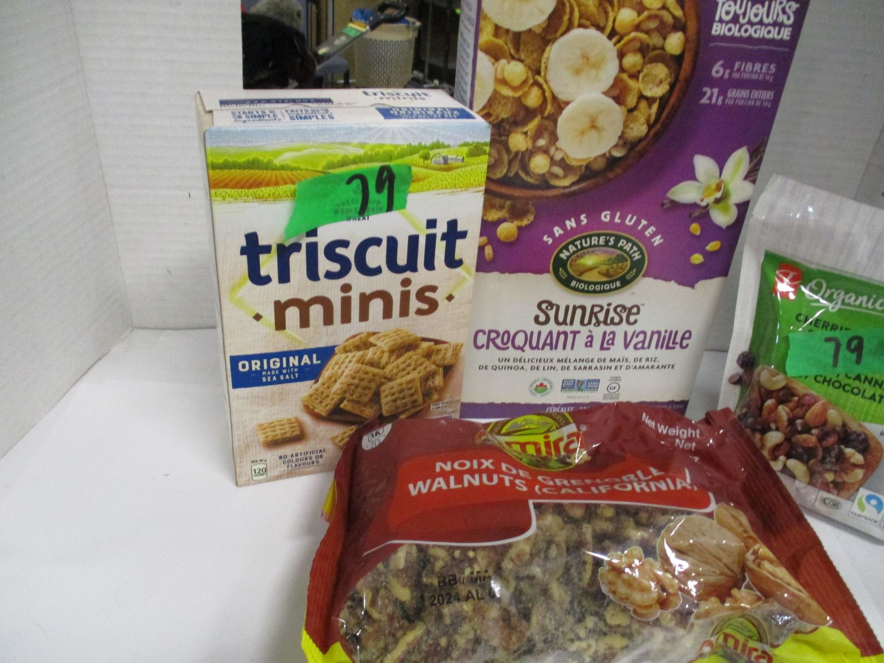 Lot 79 SHELF PULLS (AS IS): SUNRISE VANILLA CEREAL, MINI TRISCUITS, TRAIL MIX, WALNUTS - 4 PACKAGES
