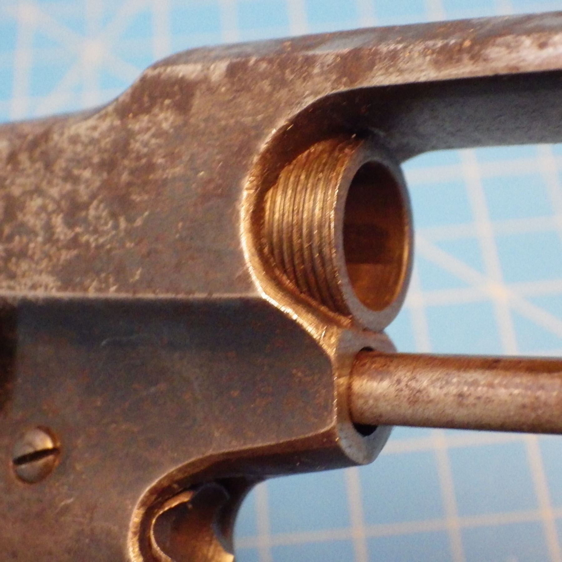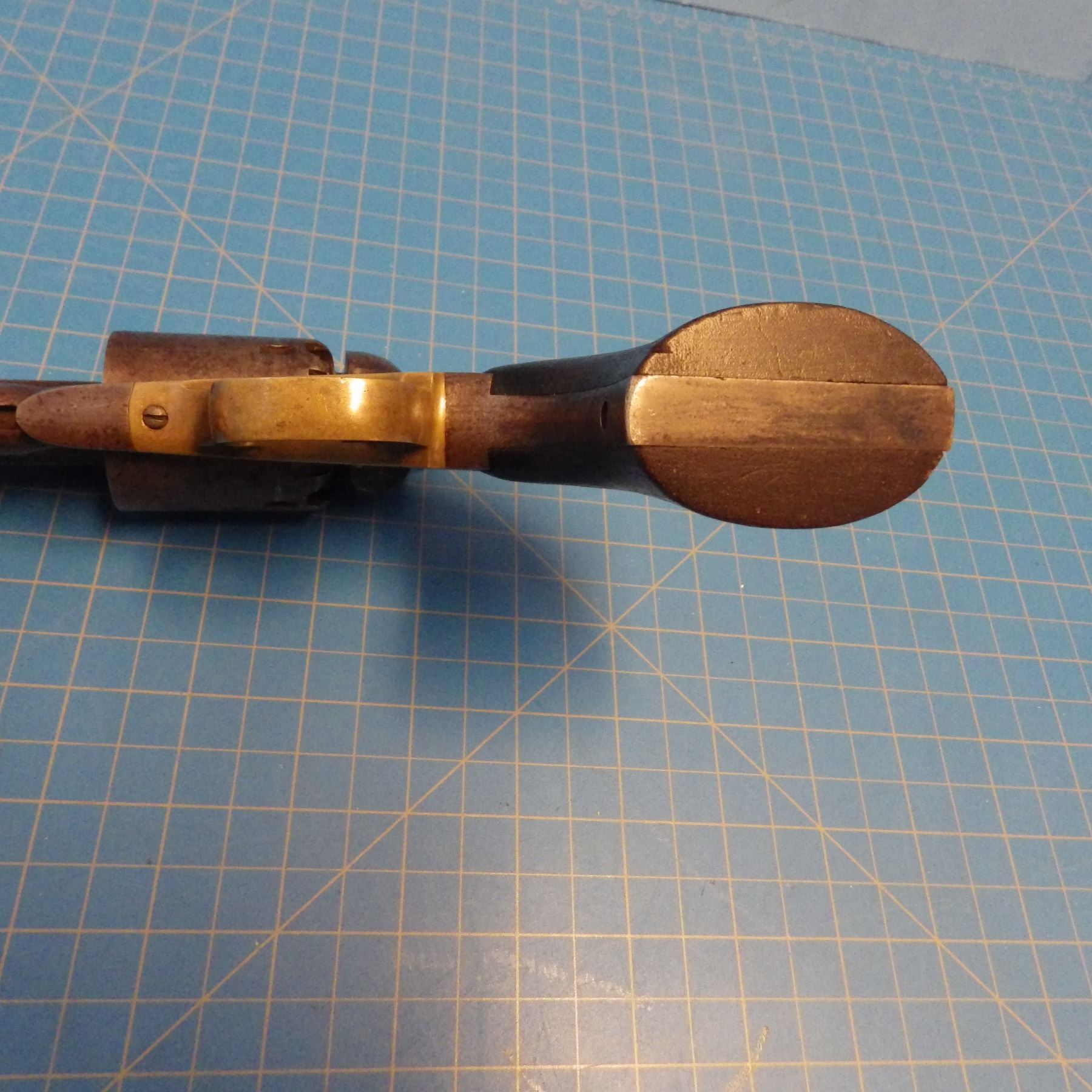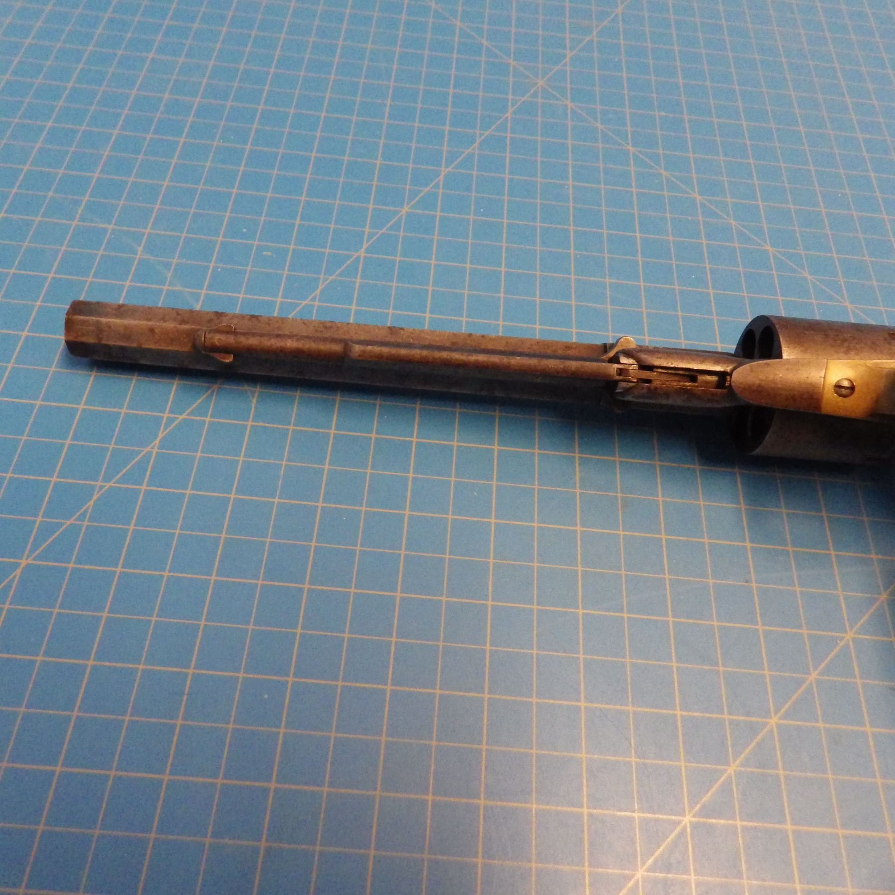 - features include: blued octagonal barrel and receiver/frame; brass trigger guard; walnut grip panels; single action trigger mechanism; barrel threads visible at the breech; safety notches on cylinder between nipples; webbed loading lever; fixed front and notched rear sights.