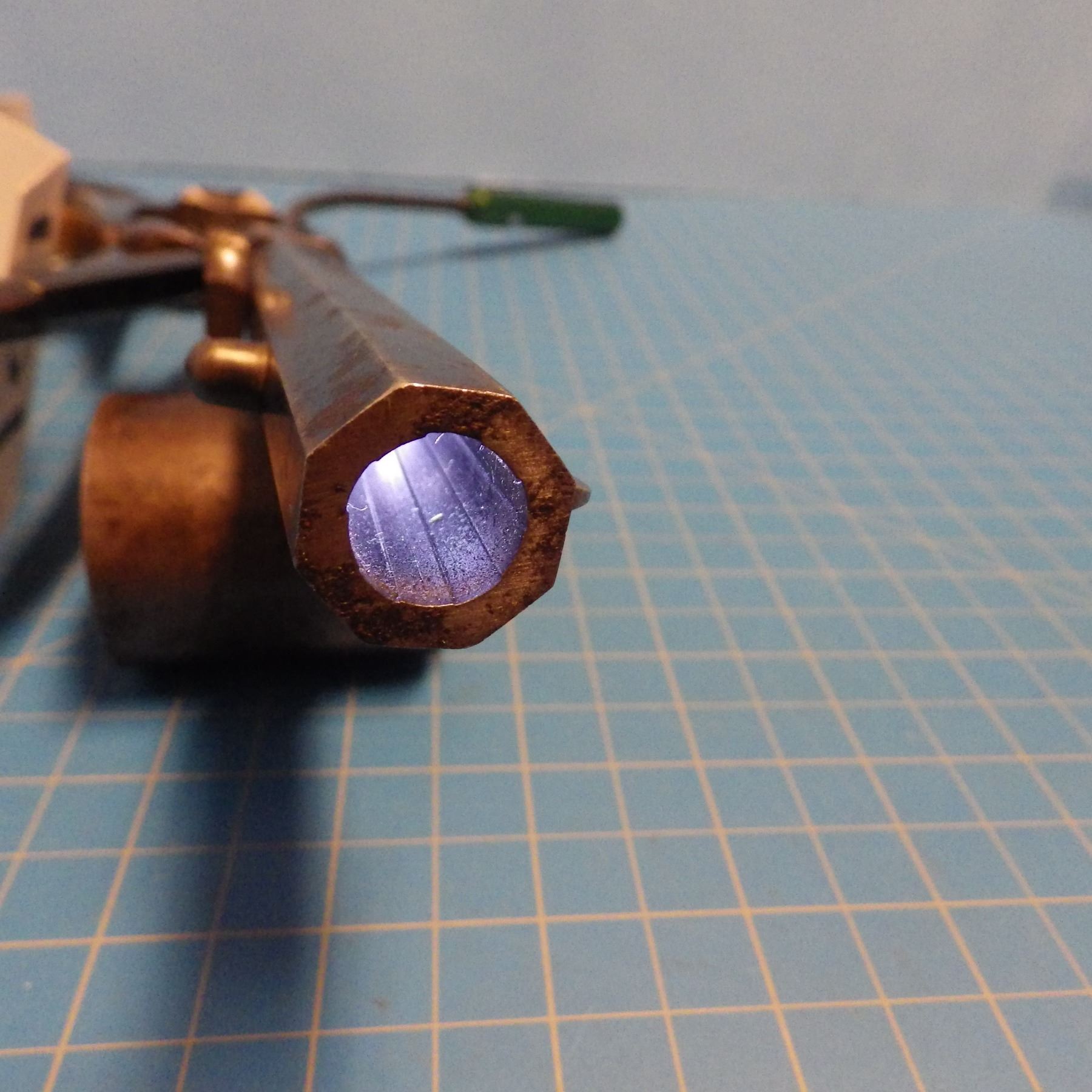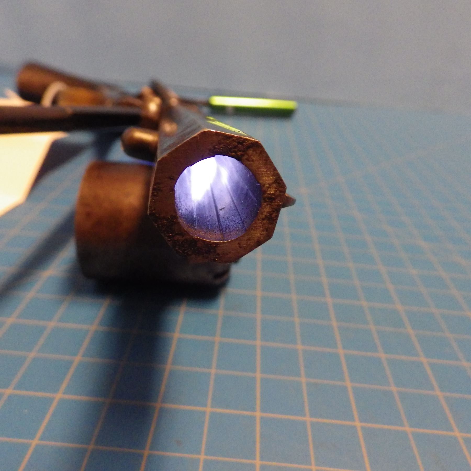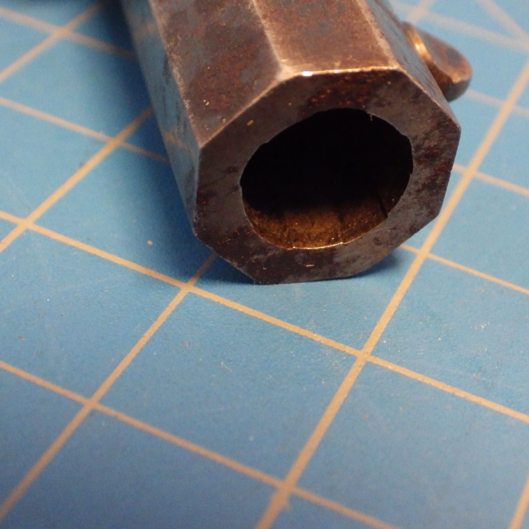 - features include: blued octagonal barrel and receiver/frame; brass trigger guard; walnut grip panels; single action trigger mechanism; barrel threads visible at the breech; safety notches on cylinder between nipples; webbed loading lever; fixed front and notched rear sights.
