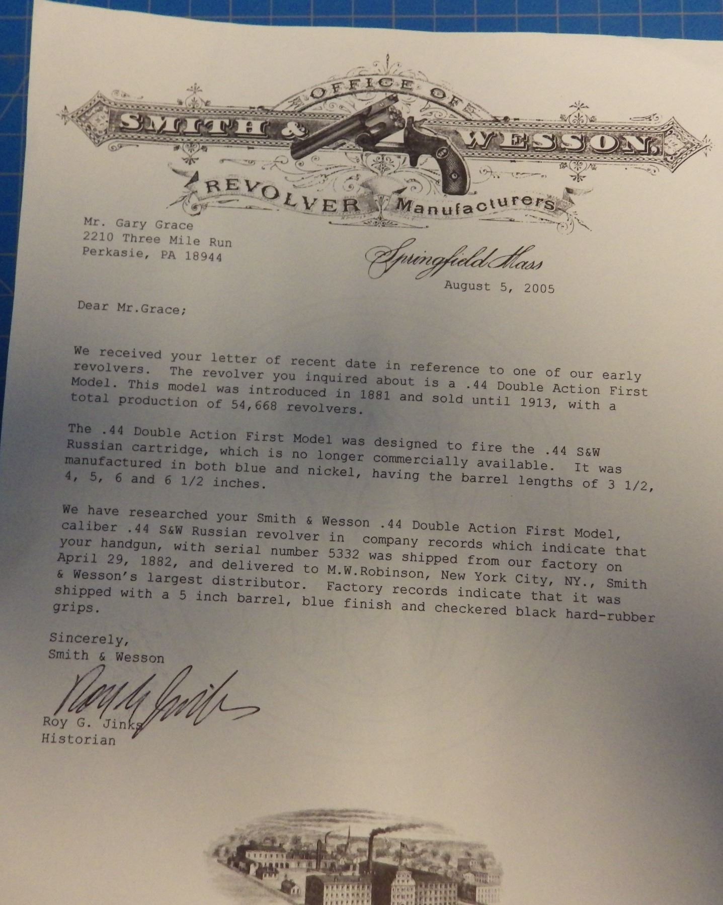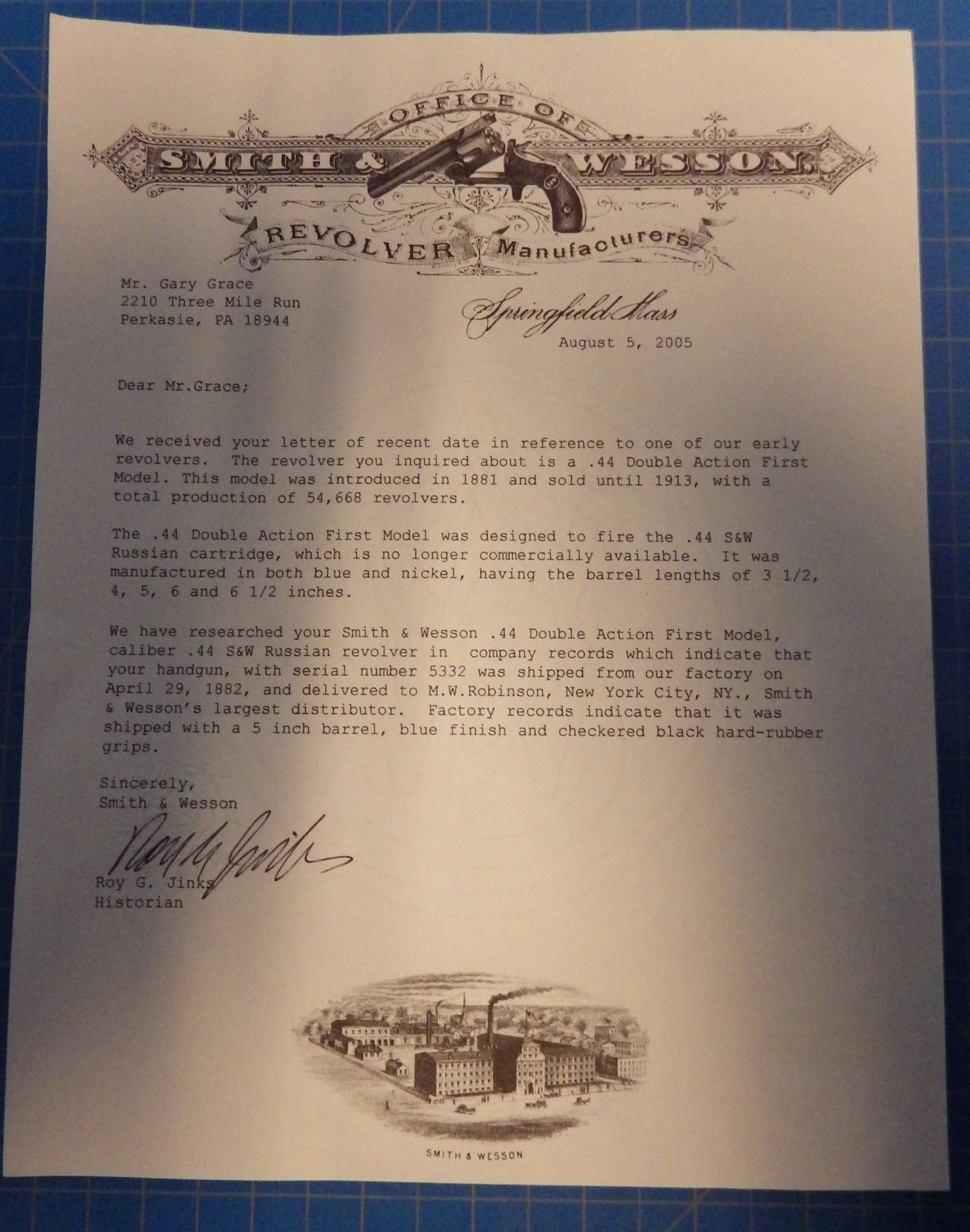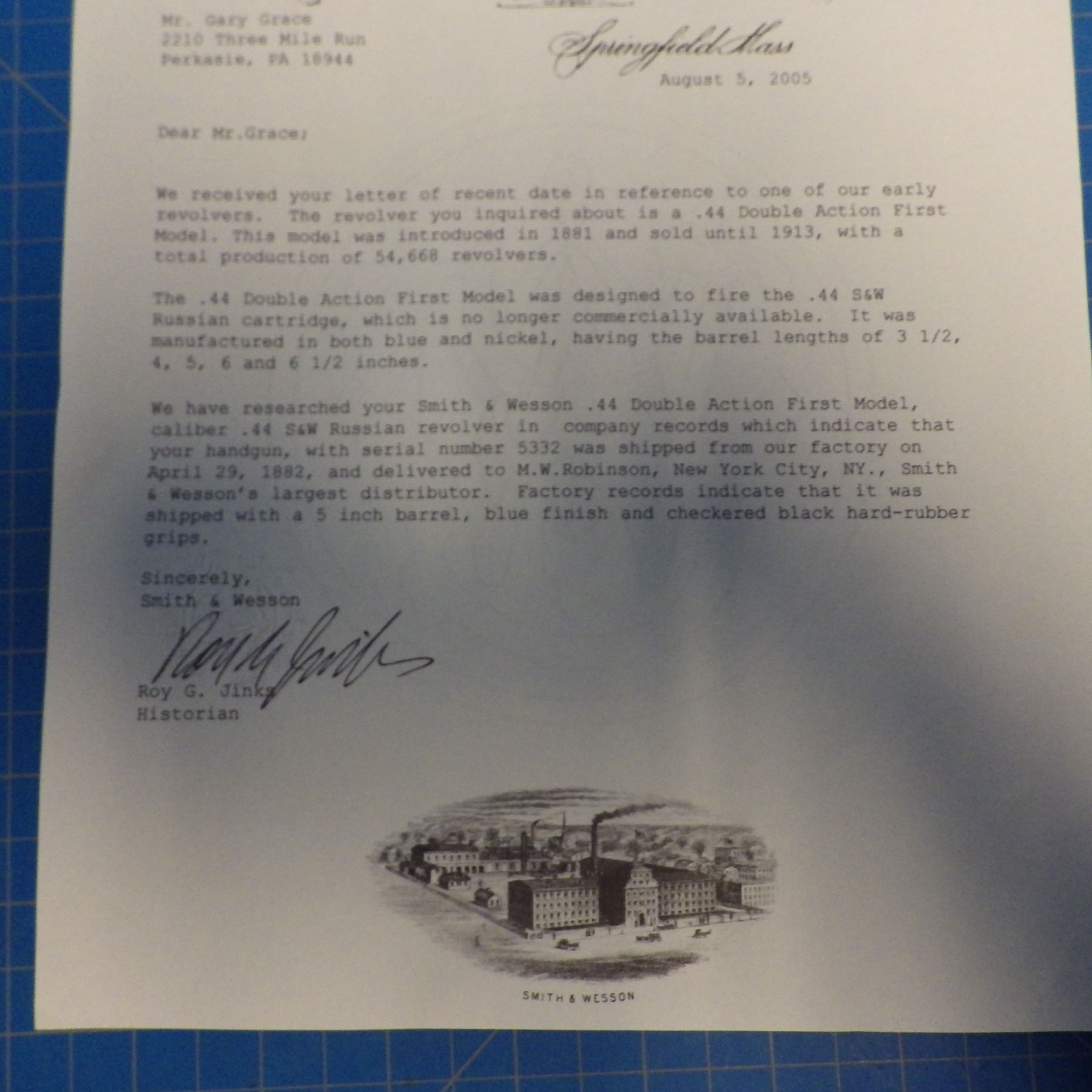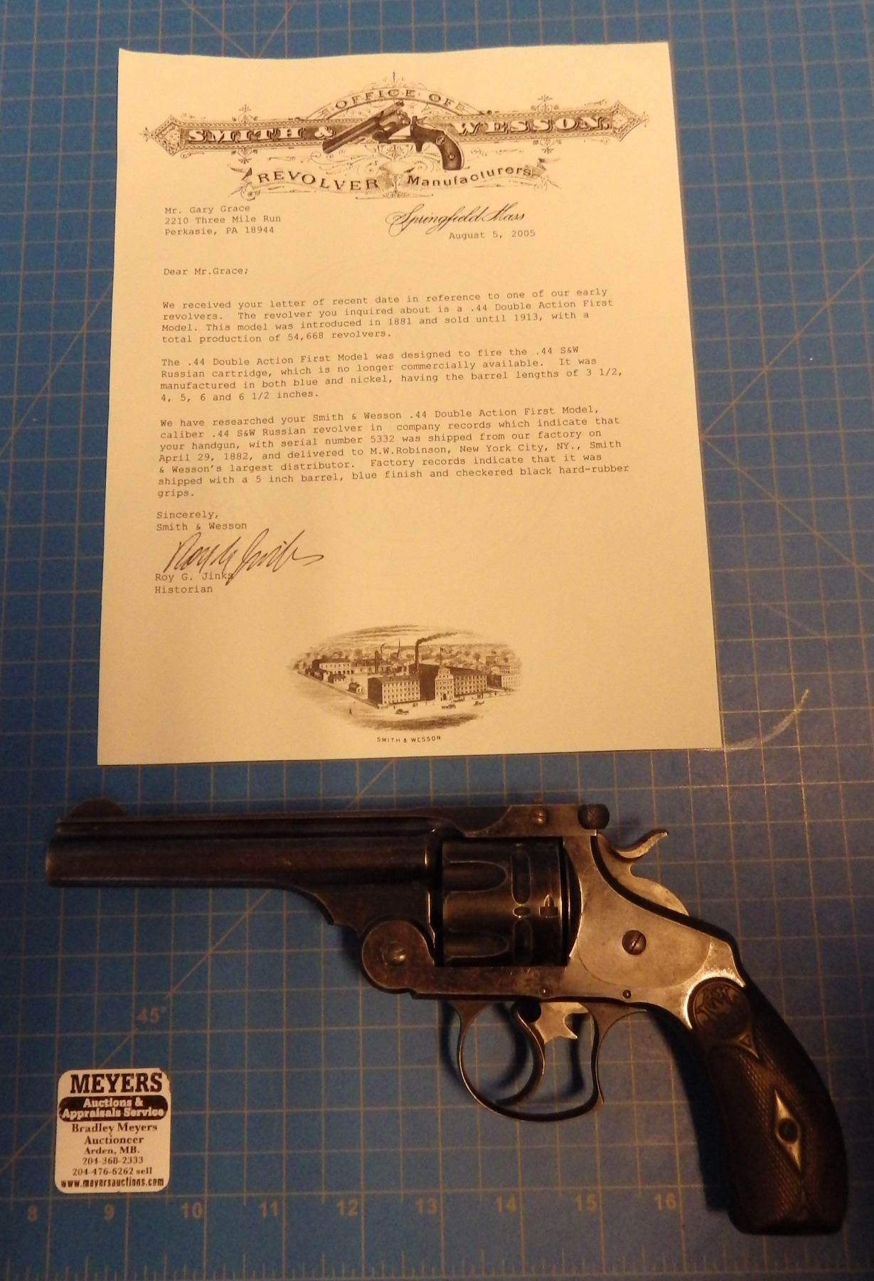 ANTIQUE PISTOL: SMITH & WESSON , .44 DOUBLE ACTION FIRST MODEL , 6 SHOT REVOLVER , .44 S&W RUSSIAN CARTRIDGE , BARREL LENGTH 127 mm , SERIAL # 5332 ... comes with letter from the OFFICE OF SMITH & WESSON REVOLVER MANUFACTURERS, DATED AUGUST 5, 2005. Left grip has minor crack ... see pictures.