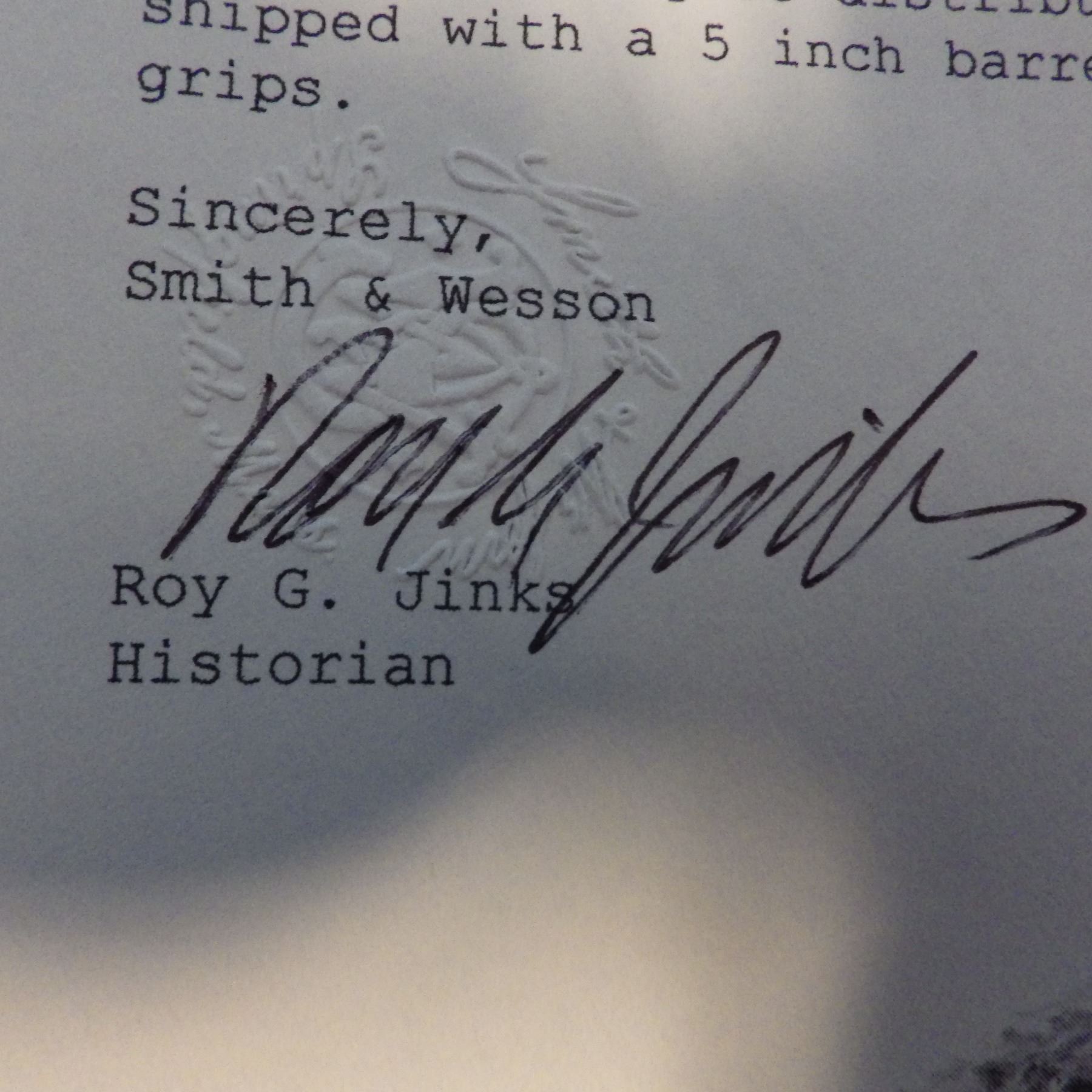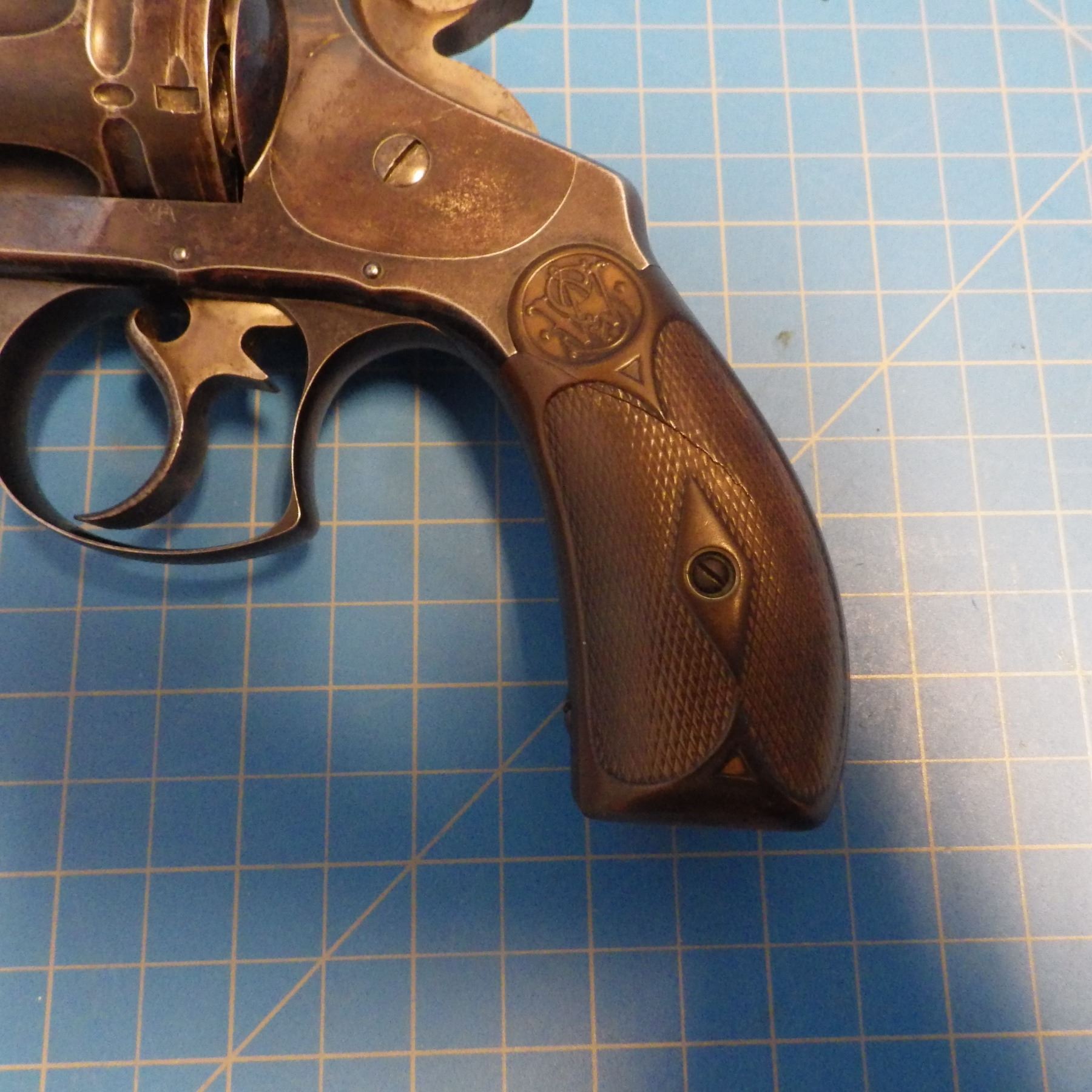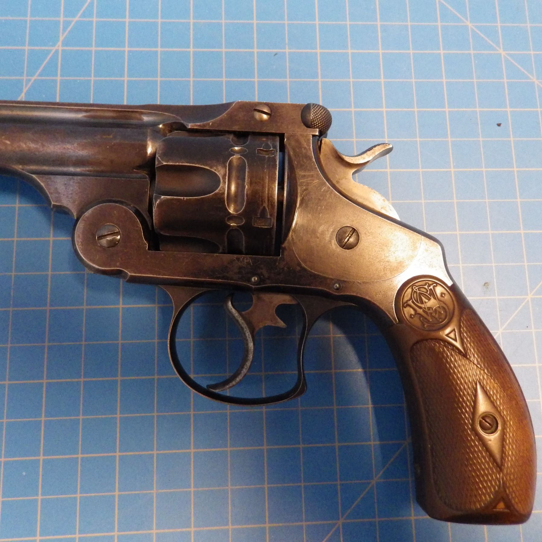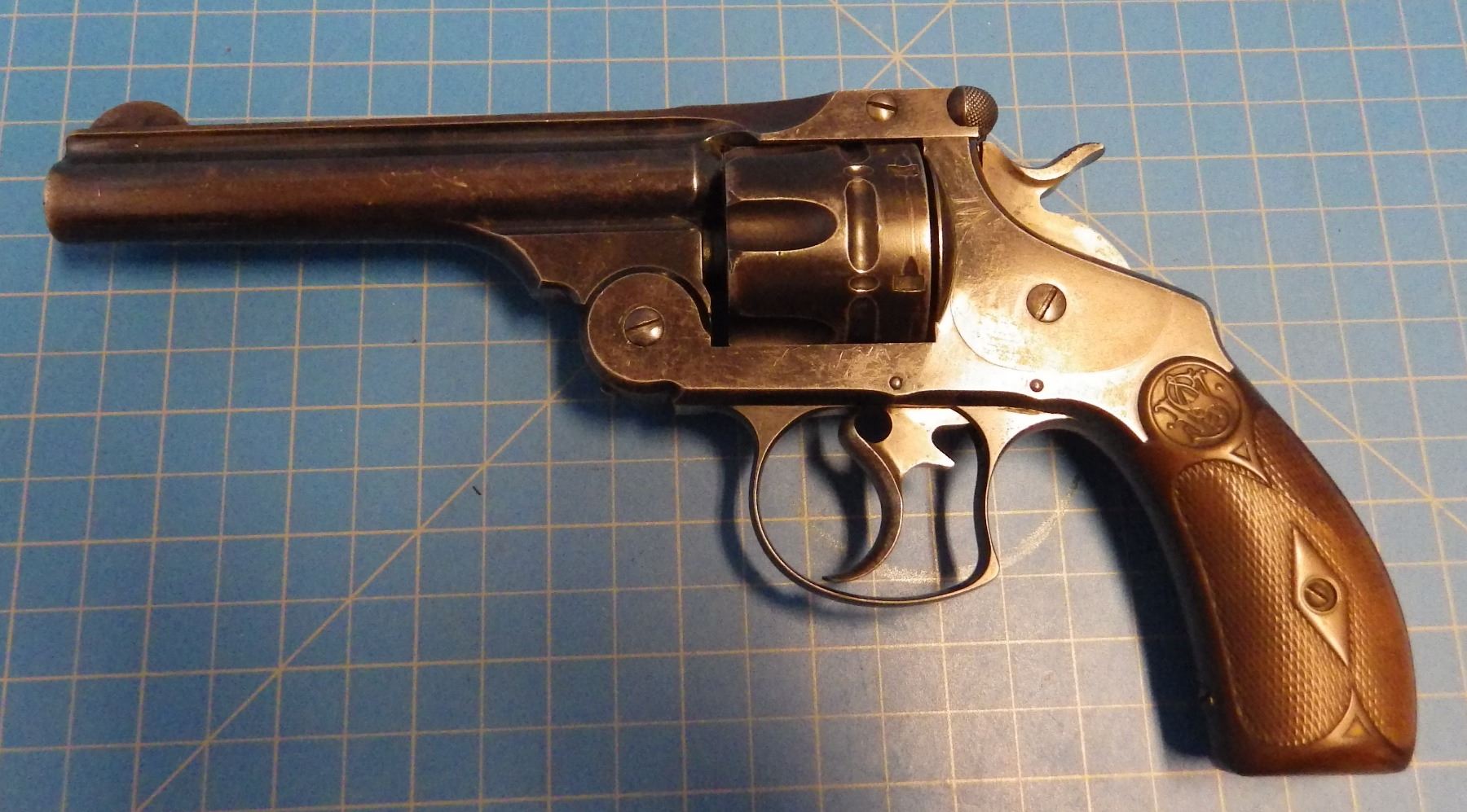 ANTIQUE PISTOL: SMITH & WESSON , .44 DOUBLE ACTION FIRST MODEL , 6 SHOT REVOLVER , .44 S&W RUSSIAN CARTRIDGE , BARREL LENGTH 127 mm , SERIAL # 5332 ... comes with letter from the OFFICE OF SMITH & WESSON REVOLVER MANUFACTURERS, DATED AUGUST 5, 2005. Left grip has minor crack ... see pictures.