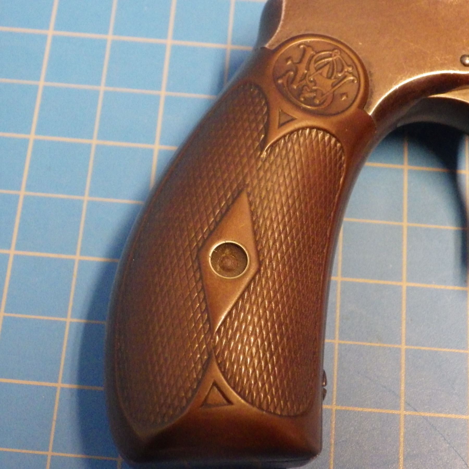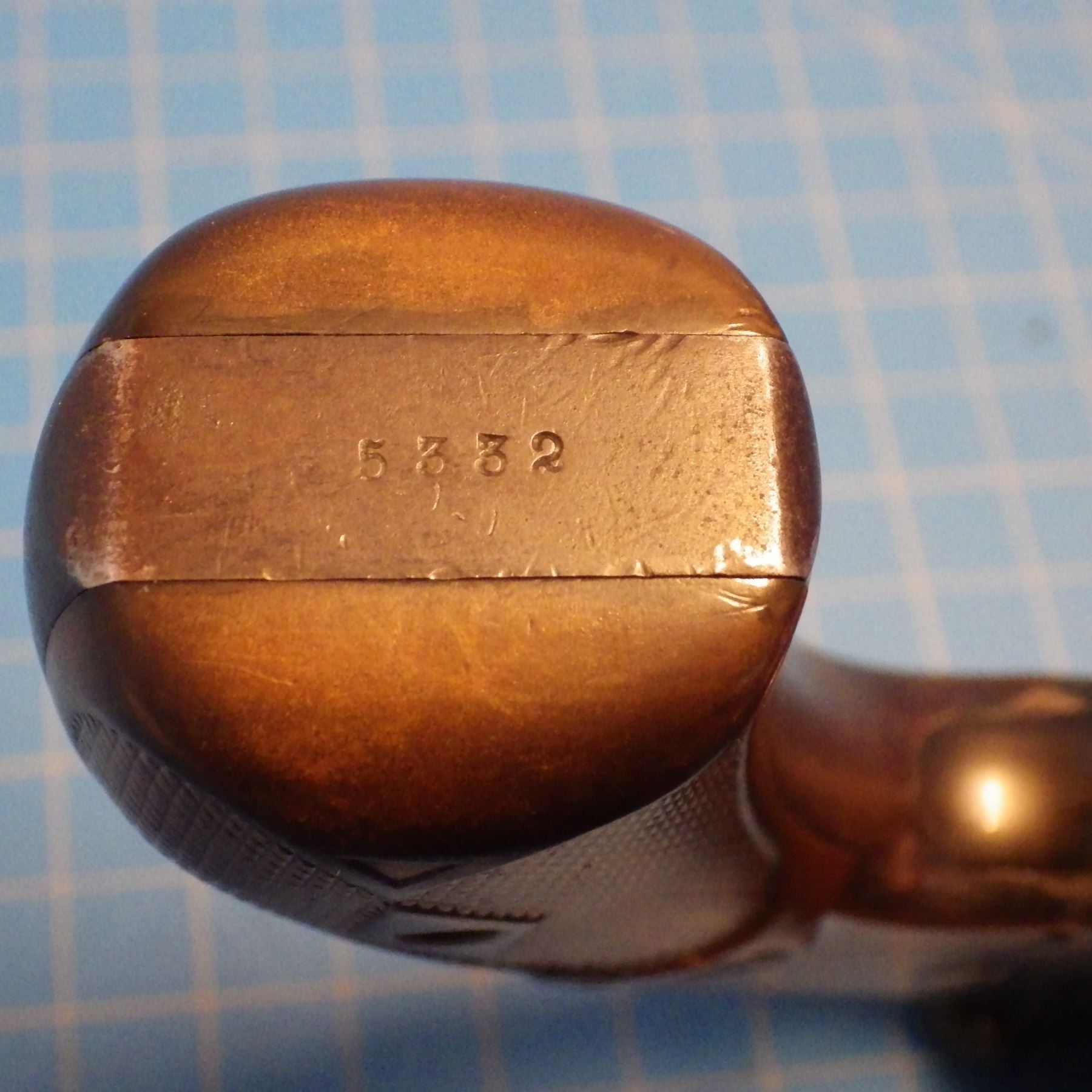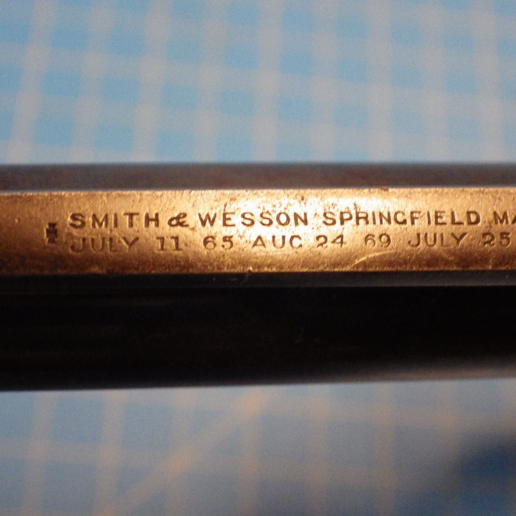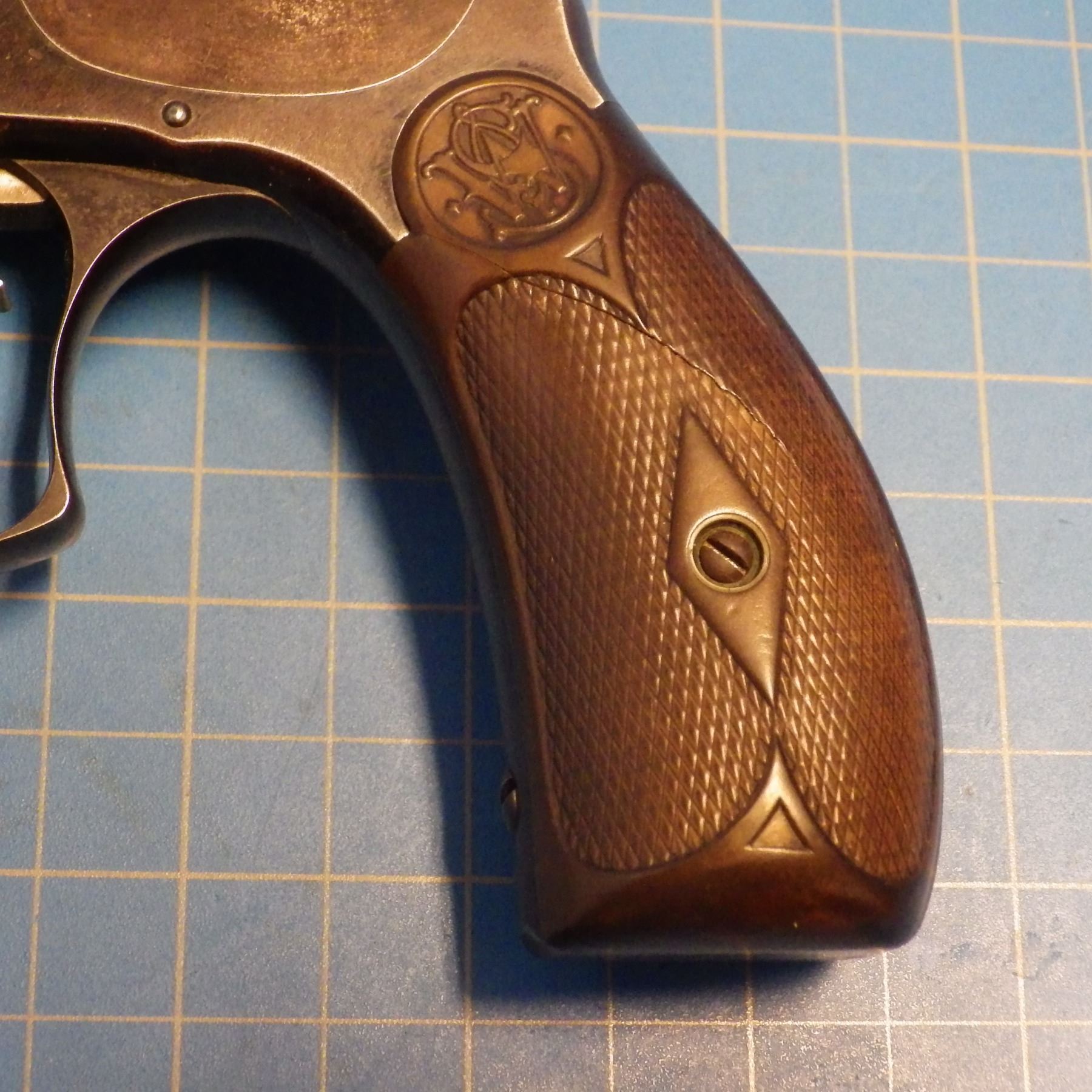 ANTIQUE PISTOL: SMITH & WESSON , .44 DOUBLE ACTION FIRST MODEL , 6 SHOT REVOLVER , .44 S&W RUSSIAN CARTRIDGE , BARREL LENGTH 127 mm , SERIAL # 5332 ... comes with letter from the OFFICE OF SMITH & WESSON REVOLVER MANUFACTURERS, DATED AUGUST 5, 2005. Left grip has minor crack ... see pictures.