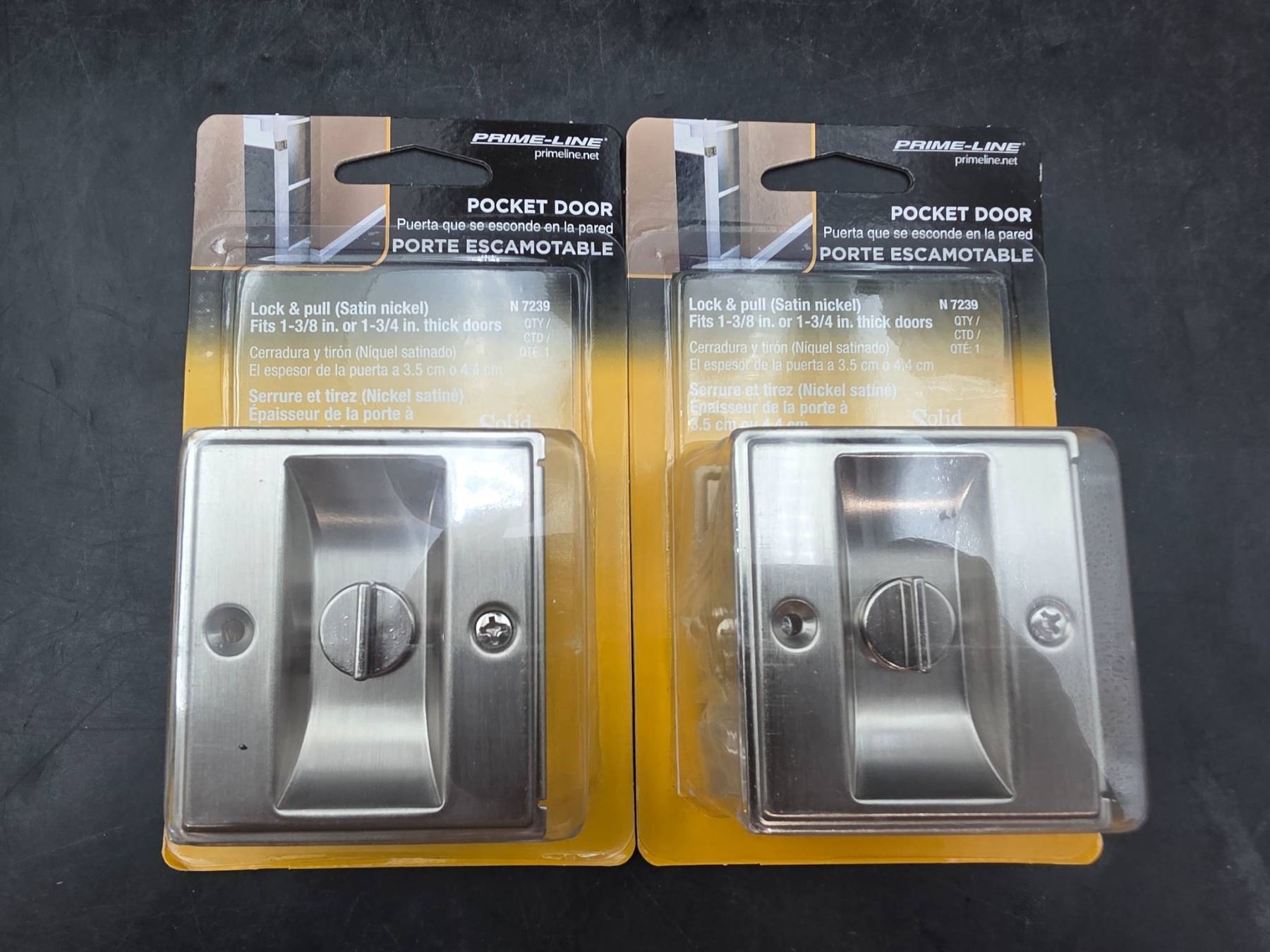 Lot 55 Lot of 2 - Prime-Line Pocket Door Lock and Pull, Satin Nickel, N7369