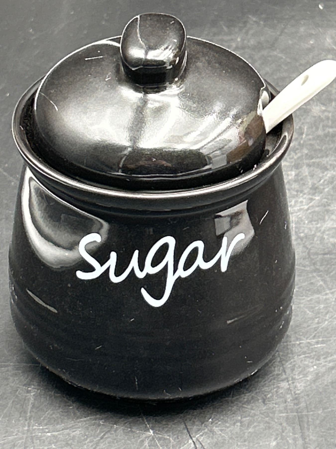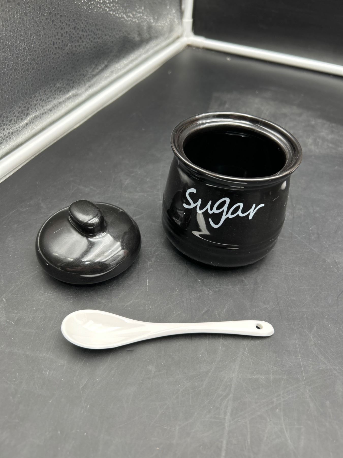 Lot 64 Black Ceramic Sugar Bowl With Lid and Spoon, 12 Oz Capacity