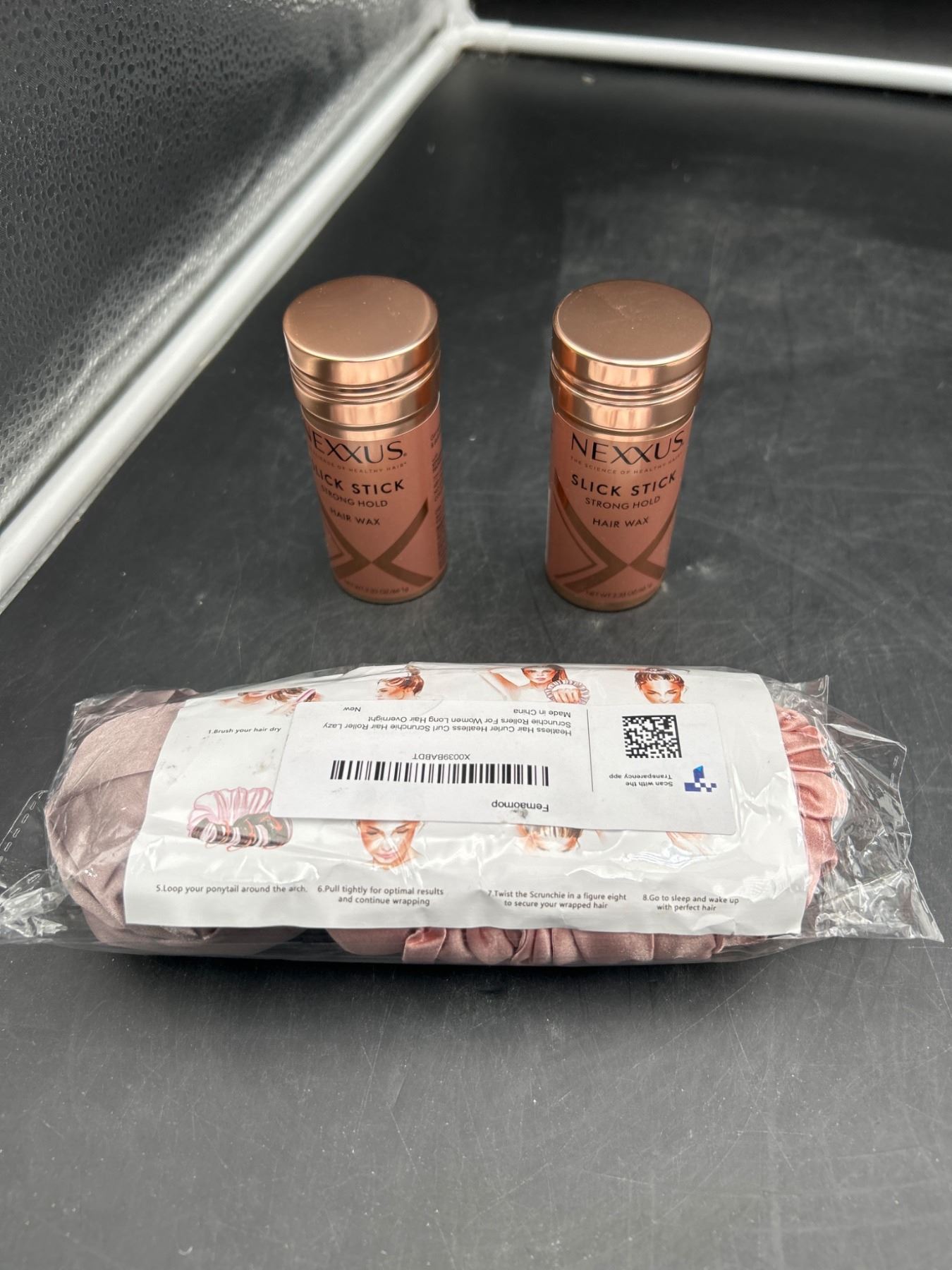 Lot 105 Nexxus Slick Stick Hair Wax (2 Units, 2.33 oz Each) and Pink Heatless Hair Curler