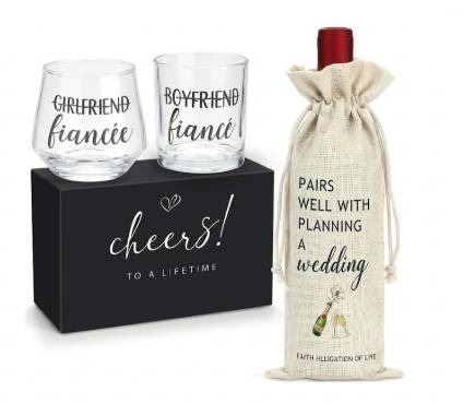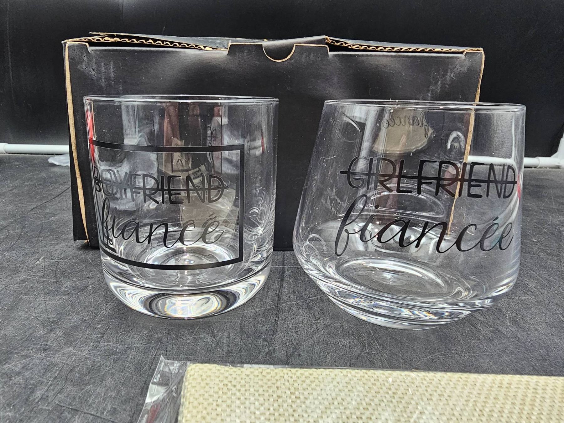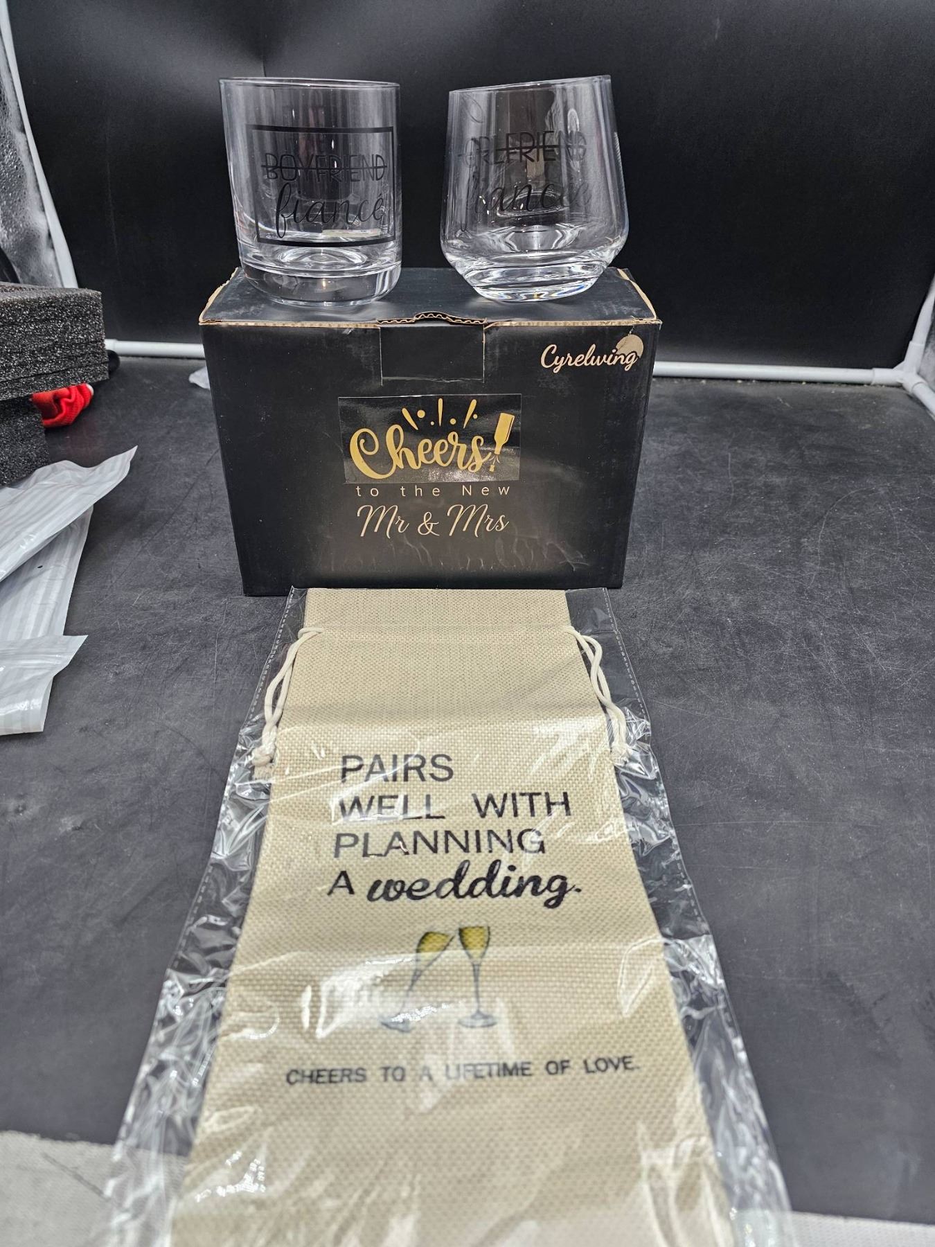 Lot 257 Cheers Mr. & Mrs. Glass Set with Decorative Cloth Piece