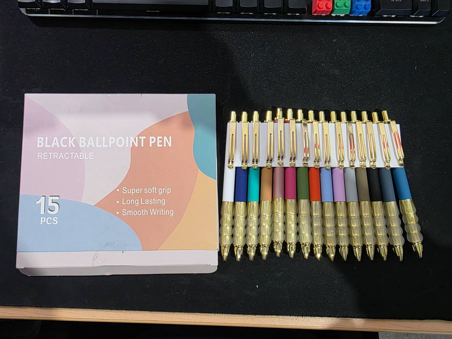 15 Retractable Black Ballpoint Pens with Assorted Barrel Colors