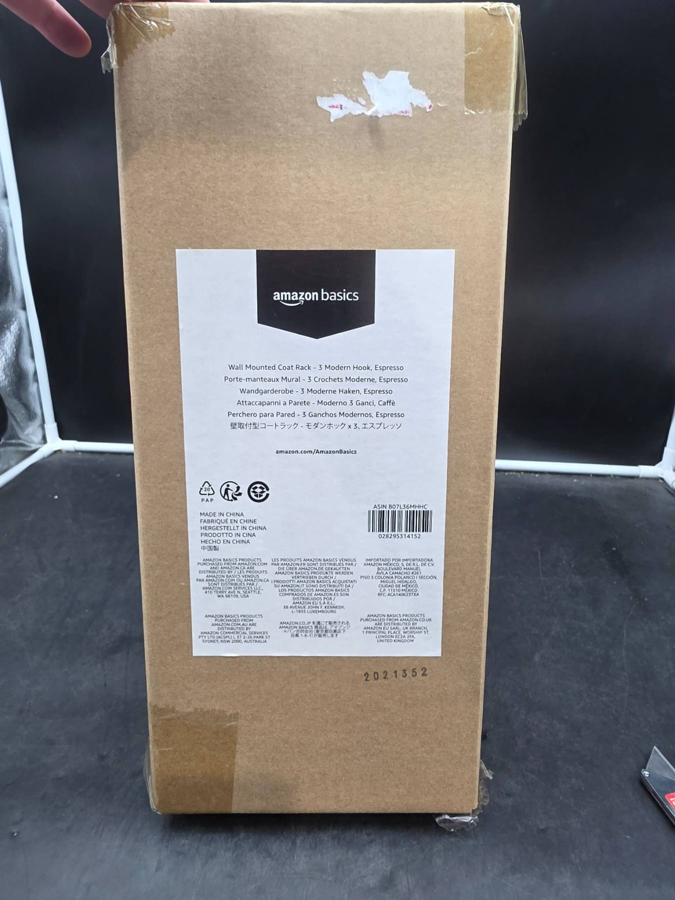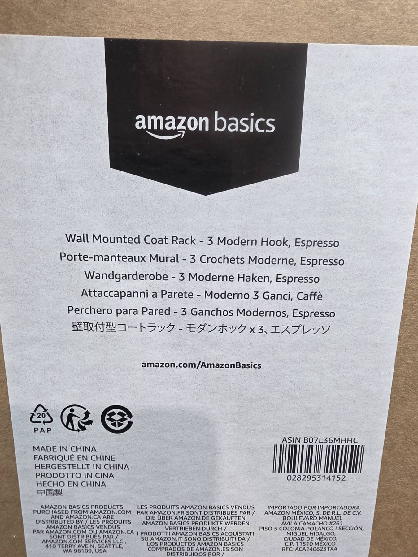 Lot 341 Amazon Basics Wall-Mounted Coat Rack, 3 Modern Hooks, Espresso