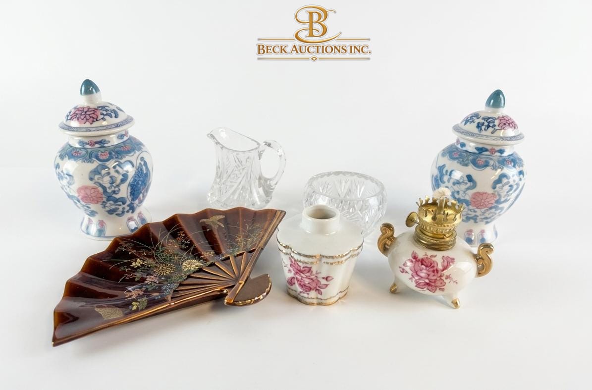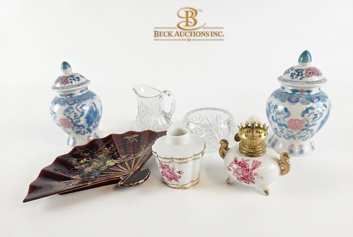 Lot 50 Chinese Porcelain & Decorative Arts ,Two Lidded Jars, Japanese Fan-Shaped Ceramic Dish And More