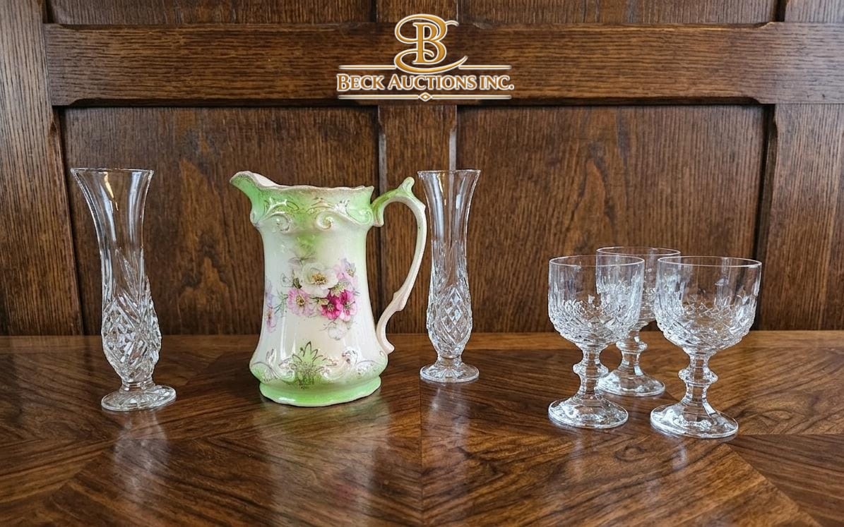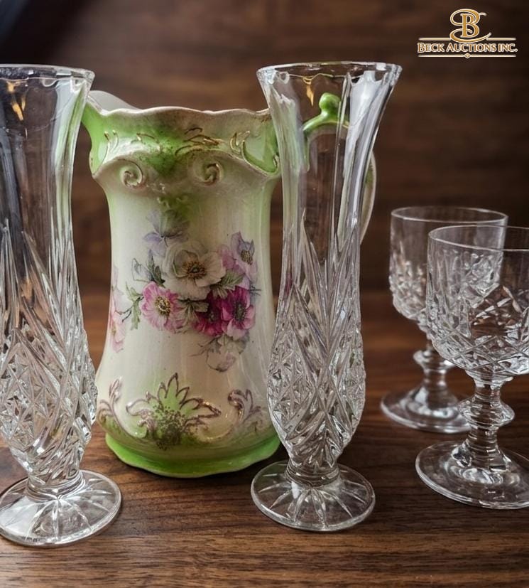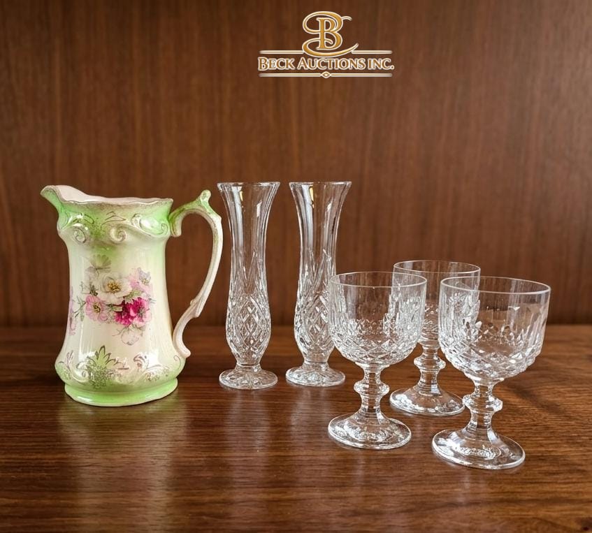 "Royal Victoria Pottery" Hand-Painted Floral Porcelain Pitcher, Wine Glasses And Crystal Vases.
