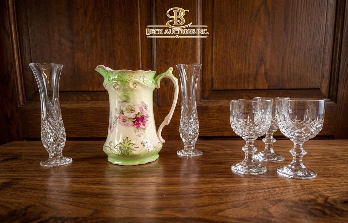 Lot 58 "Royal Victoria Pottery" Hand-Painted Floral Porcelain Pitcher, Wine Glasses And Crystal Vases.
