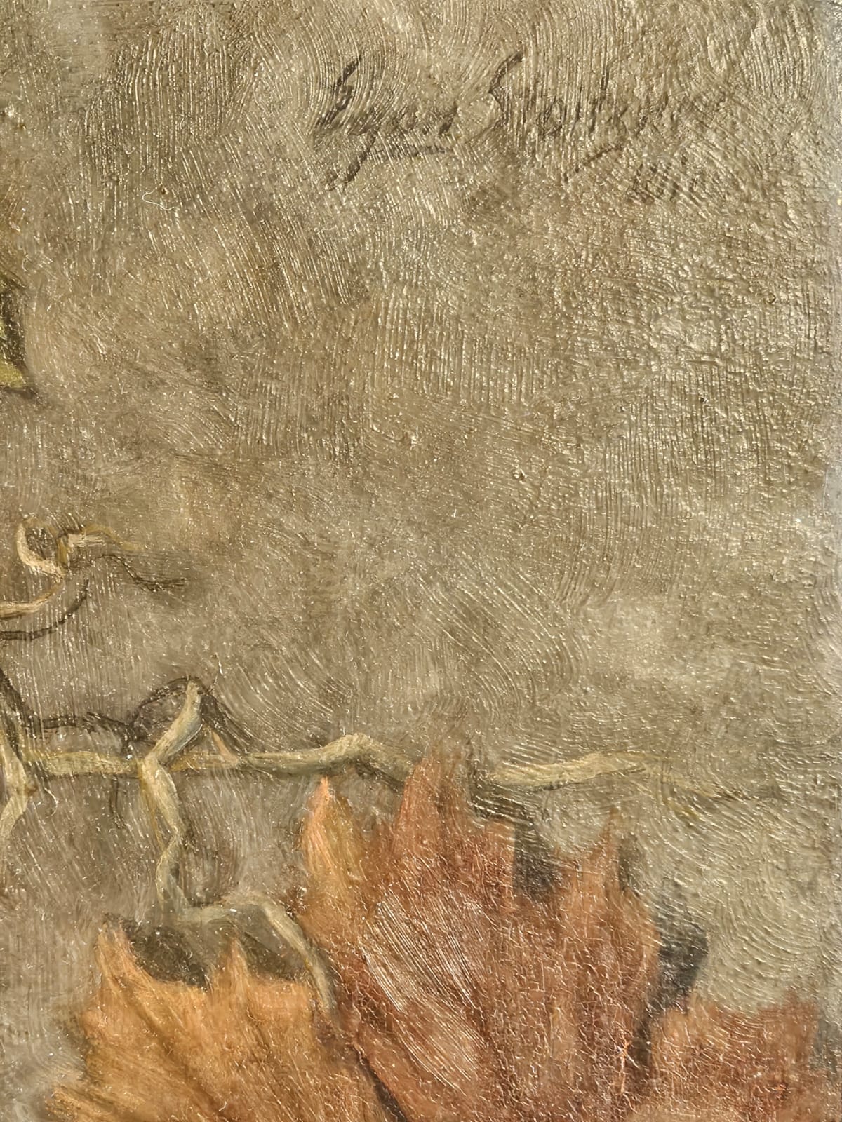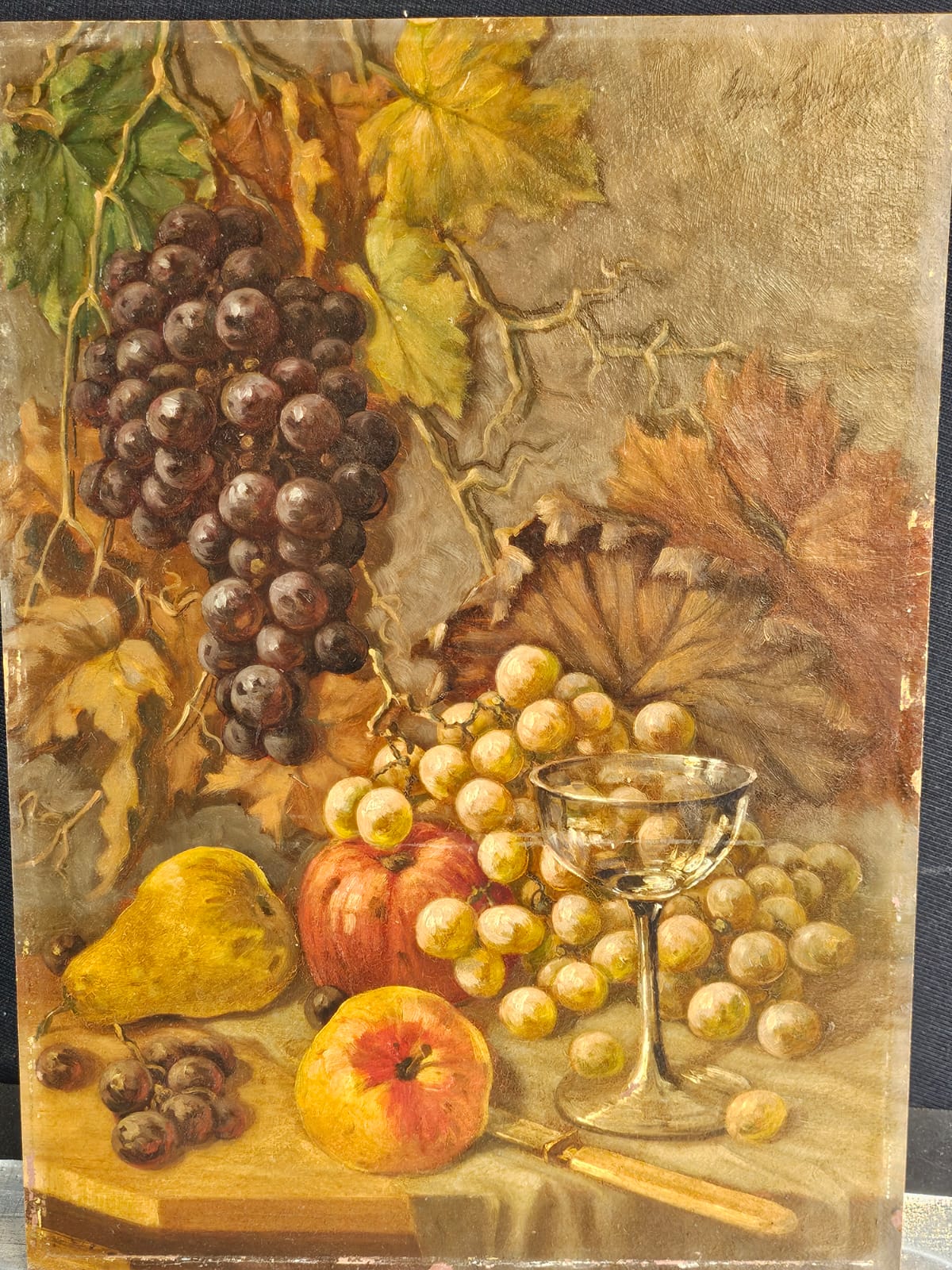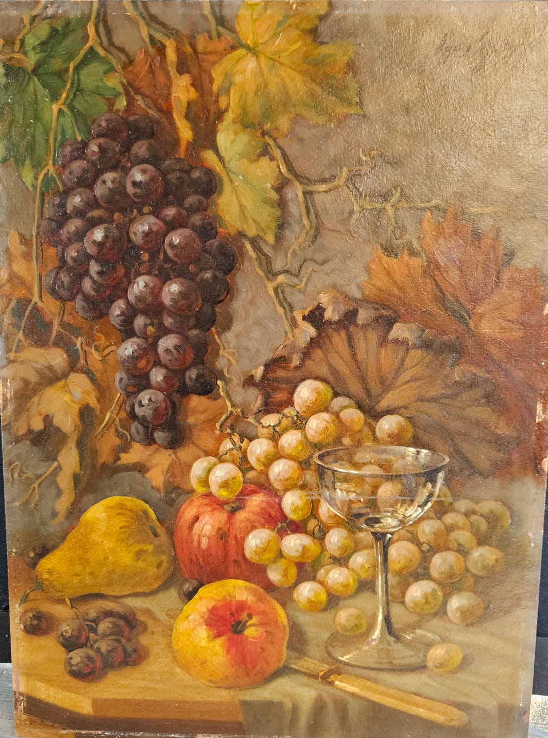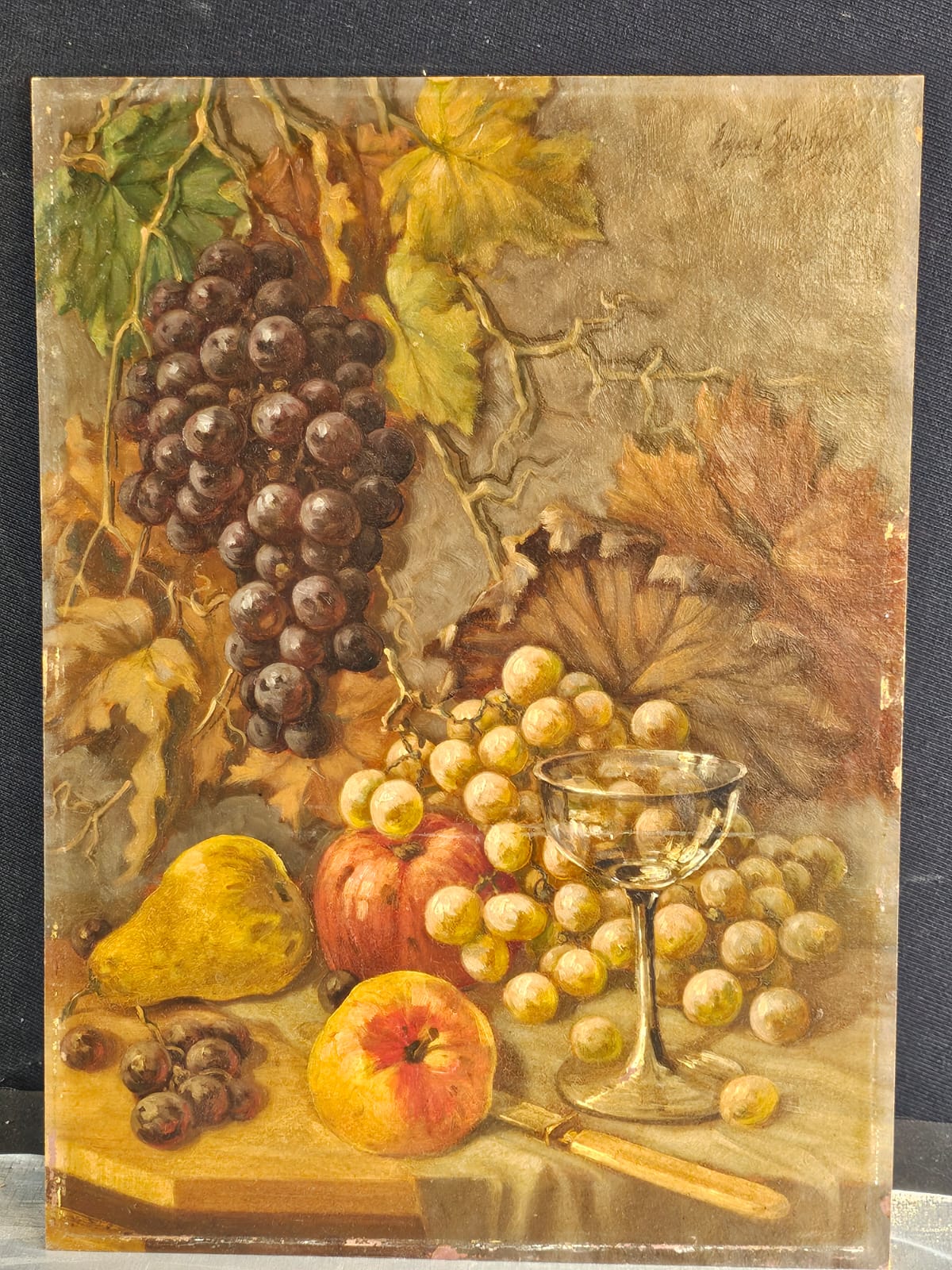 "Egon Stoitzner Wien" Oil Painting On Board Featuring A Classical Arrangement Of Grapes, Pears, And Apples Beside A Crystal Glass 17*12 INCHES