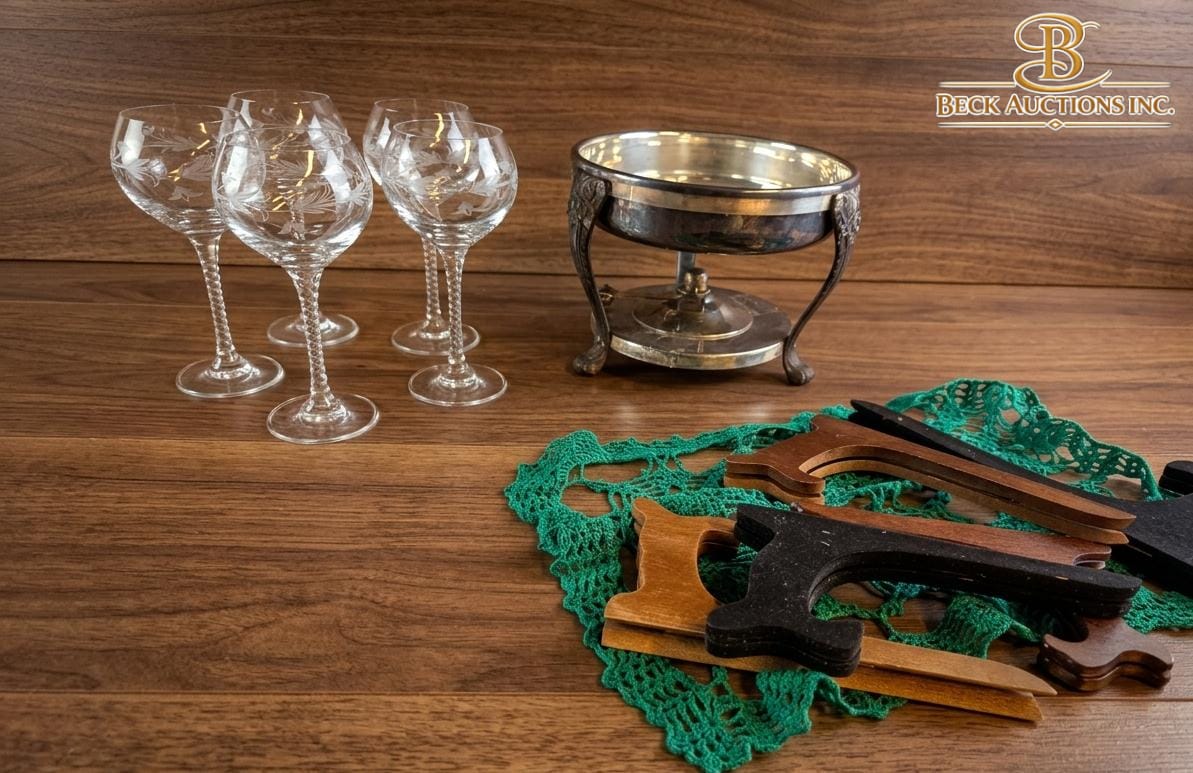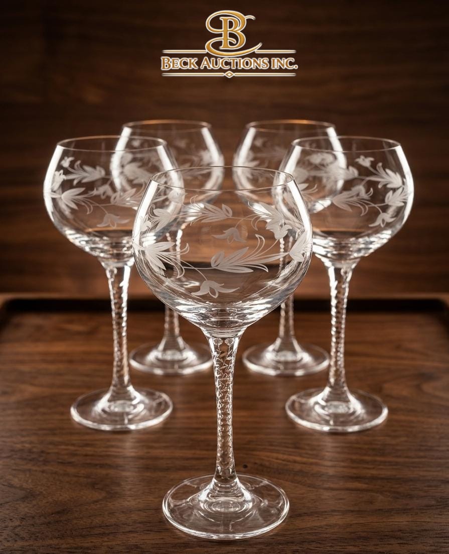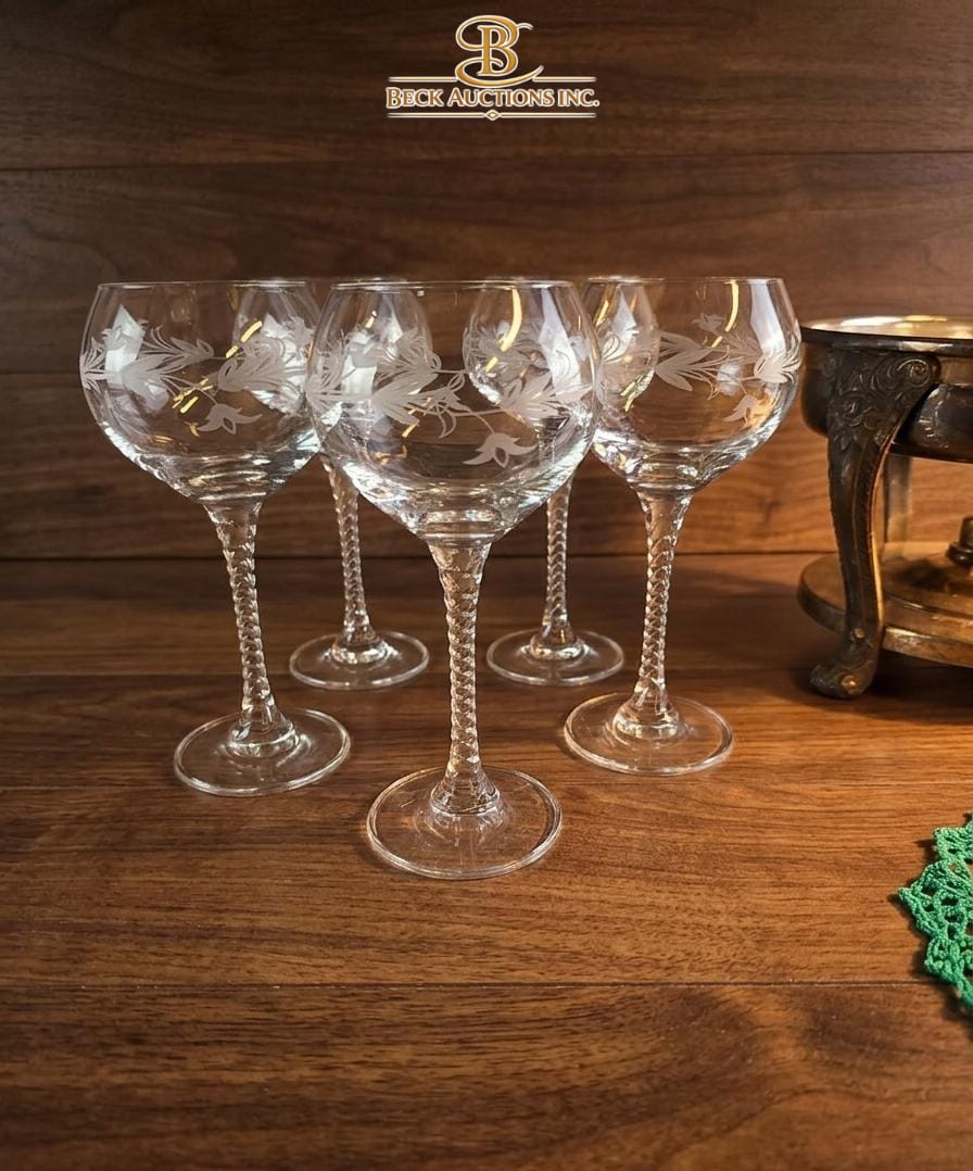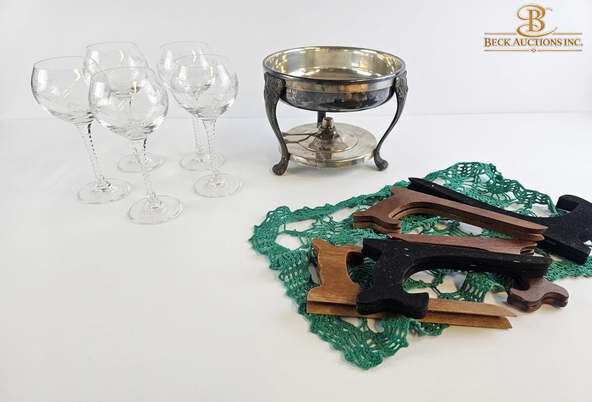 Lot 74 Vintage Crystal Hock Wine Glasses 8''INCHES H Metal Dish Holder Stand And Several Wooden Easels.