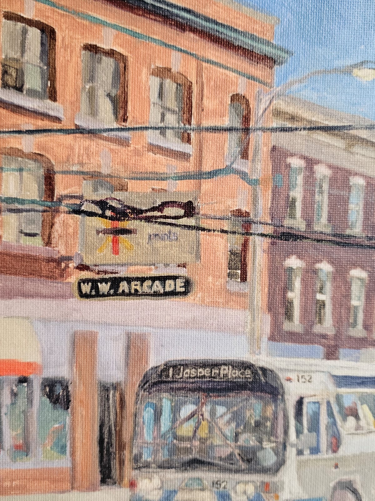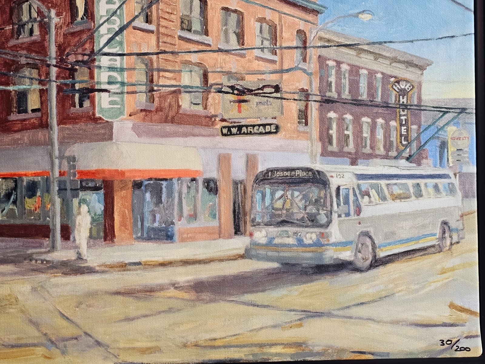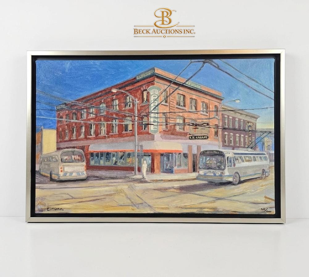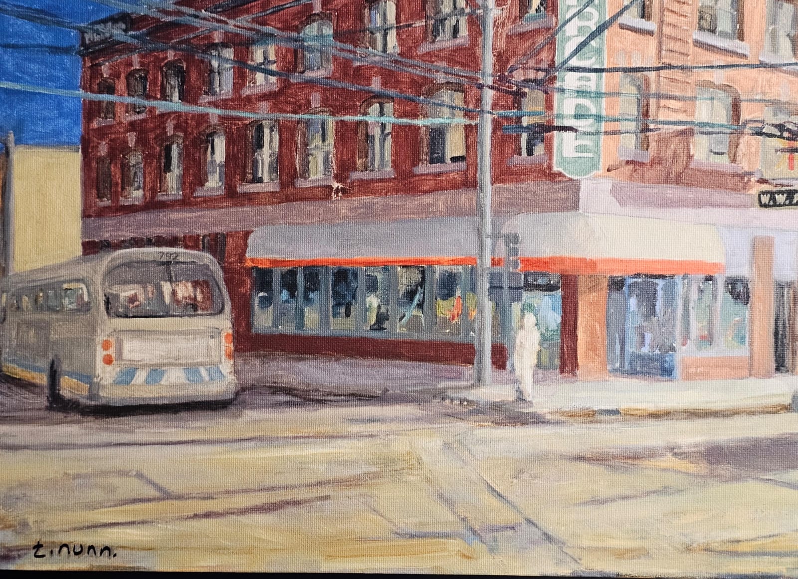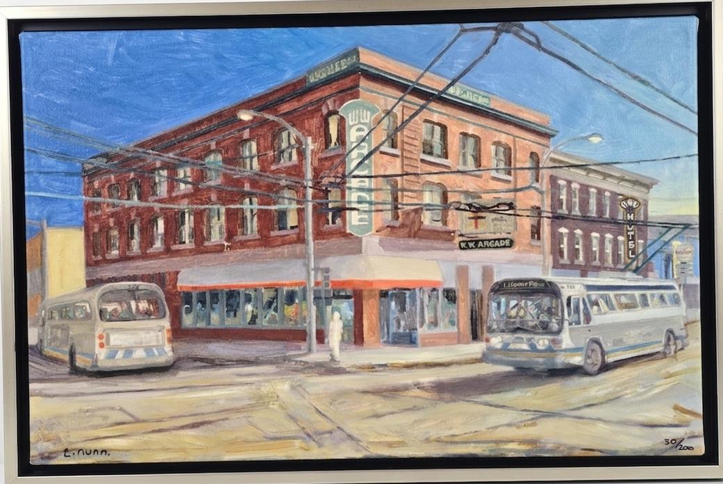 Lot 6 Framed Urban Scene Painting, By artist T. Nunn, Depicting A City Street Corner With Buses