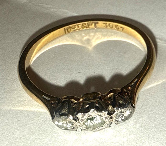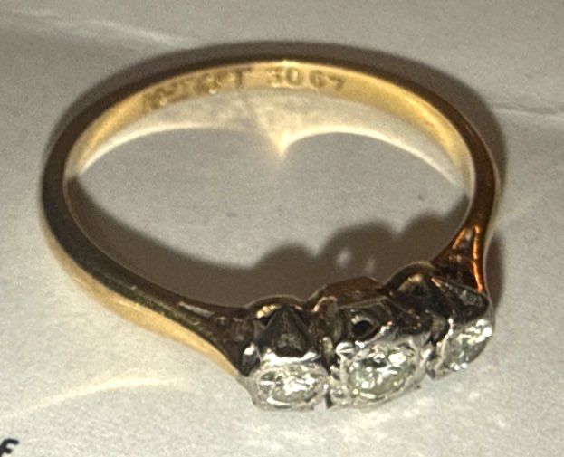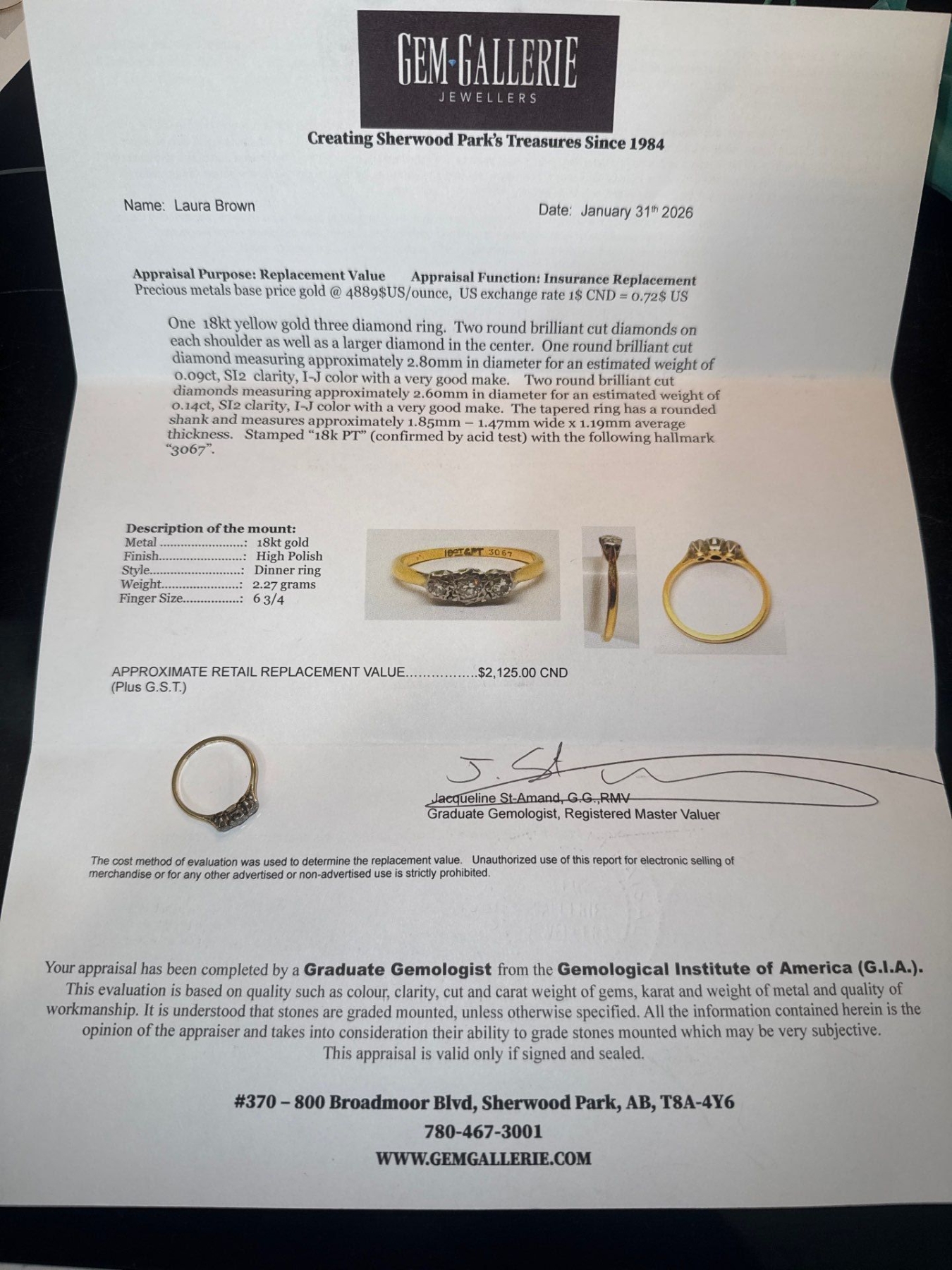 Lot 1 18K Yellow Gold Three Diamond Ring w/ Appraisal Paperwork