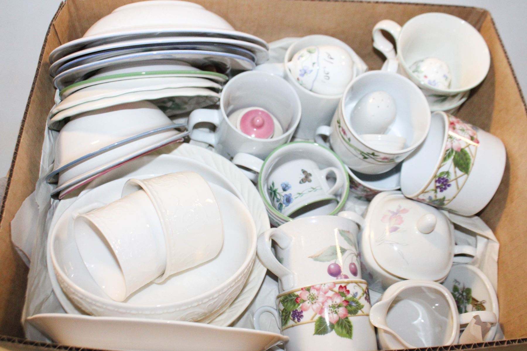DECORATIVE STONEWARE DISHES- BOX LOT ASSORTED